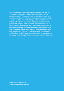 « Qu'est-ce donc, encore une fois, qu'exposer une œuvre ? C'est poser l'existence et la présence de l'œuvre : ici et maintenant ; et c'est encore poser le sujet percevant : ici et maintenant. Exposer, c'est vouloir la présence existentielle des choses et des êtres. C'est imposer l'œuvre à l'œuvre : telle quelle ; et c'est imposer le sujet percevant au sujet percevant : tel quel. Dans l'élémentarité rudimentaire de leurs natures respectives. Dans leur essence originaire et originelle. Car c'est en imposant l'œuvre à elle-même et le percevant à lui-même, que l'œuvre s'impose au percevant et le percevant à l'œuvre. Froidement, sans raffinement de l'intellect ou de l'esprit, sans théâtralité ni dramaturgie. Sans apprêt médiatique. Nature. Au sens culinaire du terme. »