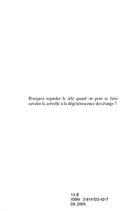 « Pourquoi regarder la télé quand on peut se faire cavaler la cervelle à la dégénérescence des étangs ? ». L'écriture désinvolte de l'une des grandes figures de la littérature expérimentale belge s'exprime à merveille dans l'un de ses premiers textes publiés.