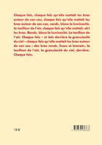 Chaque fois, chaque fois qu'elle mettait les bras autour de son cou, chaque fois qu'elle mettait les bras autour de son cou, ronds, bleue la luminosité, la touffeur de l'air, chaque fois qu'elle mettait, oh! les bras. Ronds, bleue la luminosité. La touffeur de l'air. Chaque fois – et loin derrière la granulosité du ciel – chaque fois qu'elle mettait les bras autour de son cou : des bras ronds, lisses et bronzés, la touffeur de l'air, la granulosité du ciel, derrière. Chaque fois.