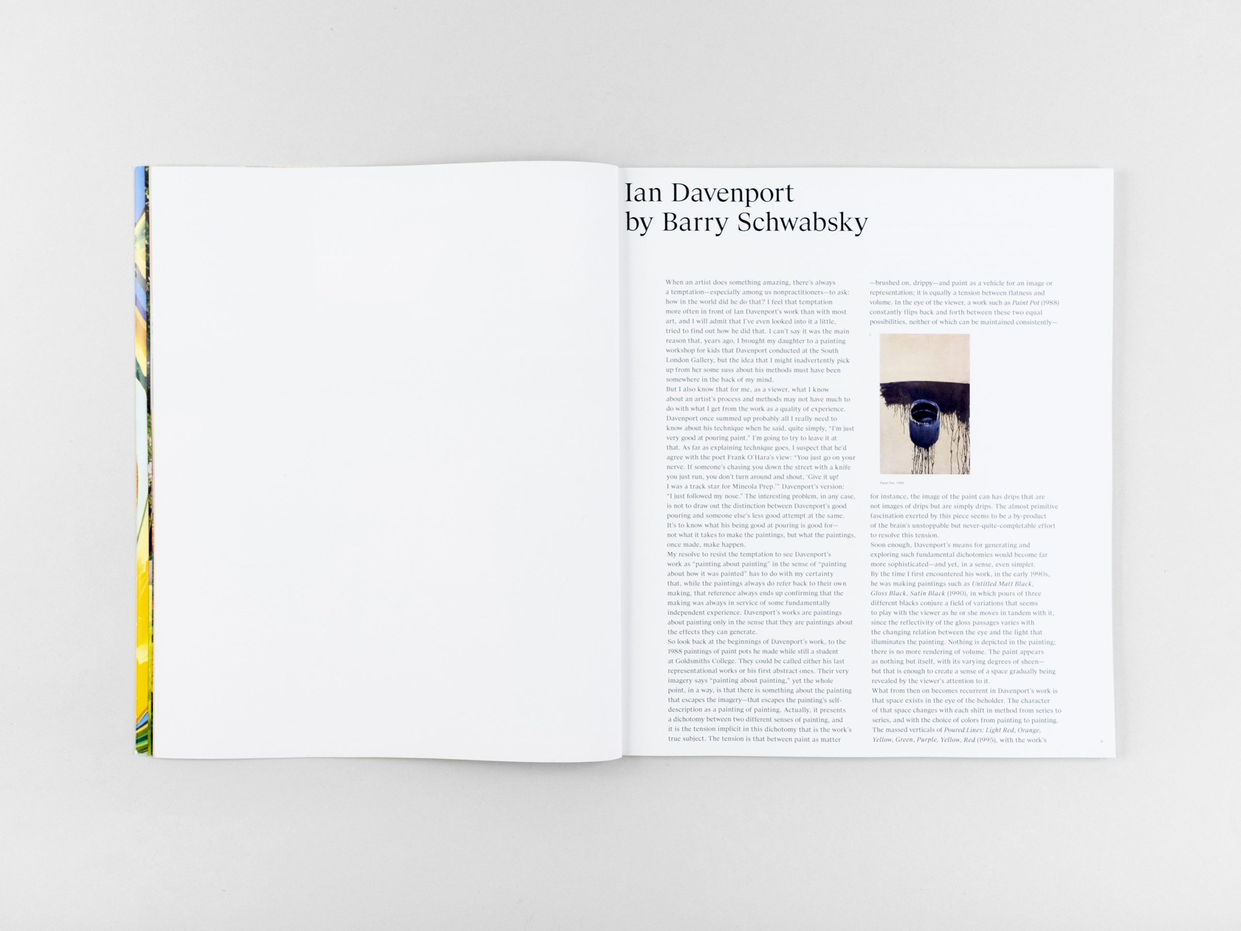Le processus créatif de Ian Davenport (né en 1966 à Sidcup, Angleterre) comporte deux aspects : d'une part, l'acte de peindre, d'autre part l'aspect performatif. Il commence par répandre de la peinture laquée sur un panneau de MDF, puis il le fait pivoter de sorte à faire se déplacer la peinture sur la surface. Certains de ses travaux sont, à l'inverse, produits en laissant la gravité agir et répandre la peinture sur la surface. La brillance de la peinture laisse percevoir les reflets de celui qui la regarde. Ces œuvres clairement attractives peuvent paraître simples, mais elles sont bien plus complexes que ce que cette explication suggère. L'intensité maximale apparaît lorsque la situation est hors de contrôle, le moment où les couleurs entrent en contact. Ces œuvres ont une présence, un pouvoir de transformer l'espace qu'elles occupent, changeant la perception de l'environnement qui les entoure.