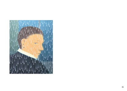 En peinture, nous pouvons voir comment une image apparaît, car nous avons une tendance naturelle à voir des choses dans la moindre tache ou quelques touches de pinceau. Notre regard cherche sans cesse à interpréter, à donner du sens à ce qu'il perçoit. À quel moment commence ou s'arrête la ressemblance ? J'aimerais voir l'instant où la peinture commence à faire référence, à ressembler à autre chose qu'à elle-même. C'est pourquoi je cherche à donner seulement la quantité nécessaire d'éléments, d'indices. (Ce que vous pensez voir est souvent à l'abri des regards.) Il n'y a pas de photos sur les murs de mon atelier. Je préfère observer et déduire. Je regarde les gens, le monde et ses représentations, peint et autres. Mes peintures sont des constructions de lignes, de couleurs et de proportions. La façon de peindre est prédéterminée dans le croquis, le plan. Mais mes images ne sont pas nouvelles. Je ne les ai pas vraiment inventées. C'est comme si elles étaient déjà là. »