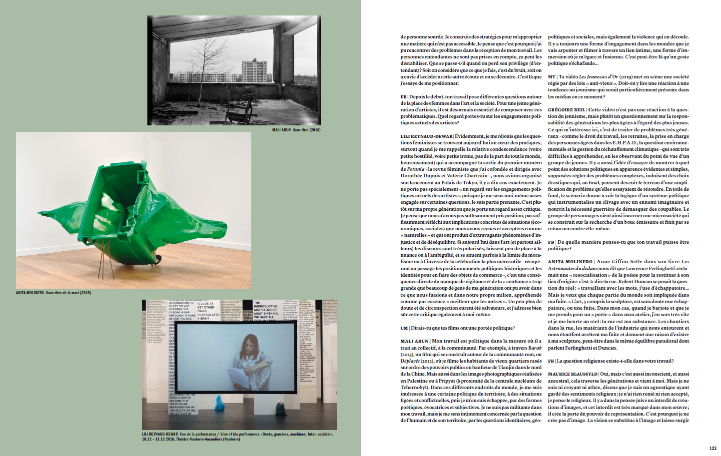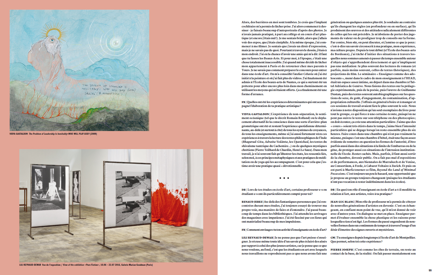 Un grand entretien rassemble les paroles des artistes de l'exposition. Construit à partir de leurs réponses à un ensemble de questions thématiques que nous leur avons posées individuellement, il s'intéresse au contexte dans lequel se développe leur pratique – concernant leurs influences théoriques ou artistiques, leurs modes de vies et leurs conditions matérielles d'existence, ou encore leur rapport à la transmission – et tente de dresser un panorama (forcément fragmentaire) de ce qui nourrit, influence, inspire leur travail. Cet entretien est illustré par un large ensemble iconographique de plus de deux cents œuvres.