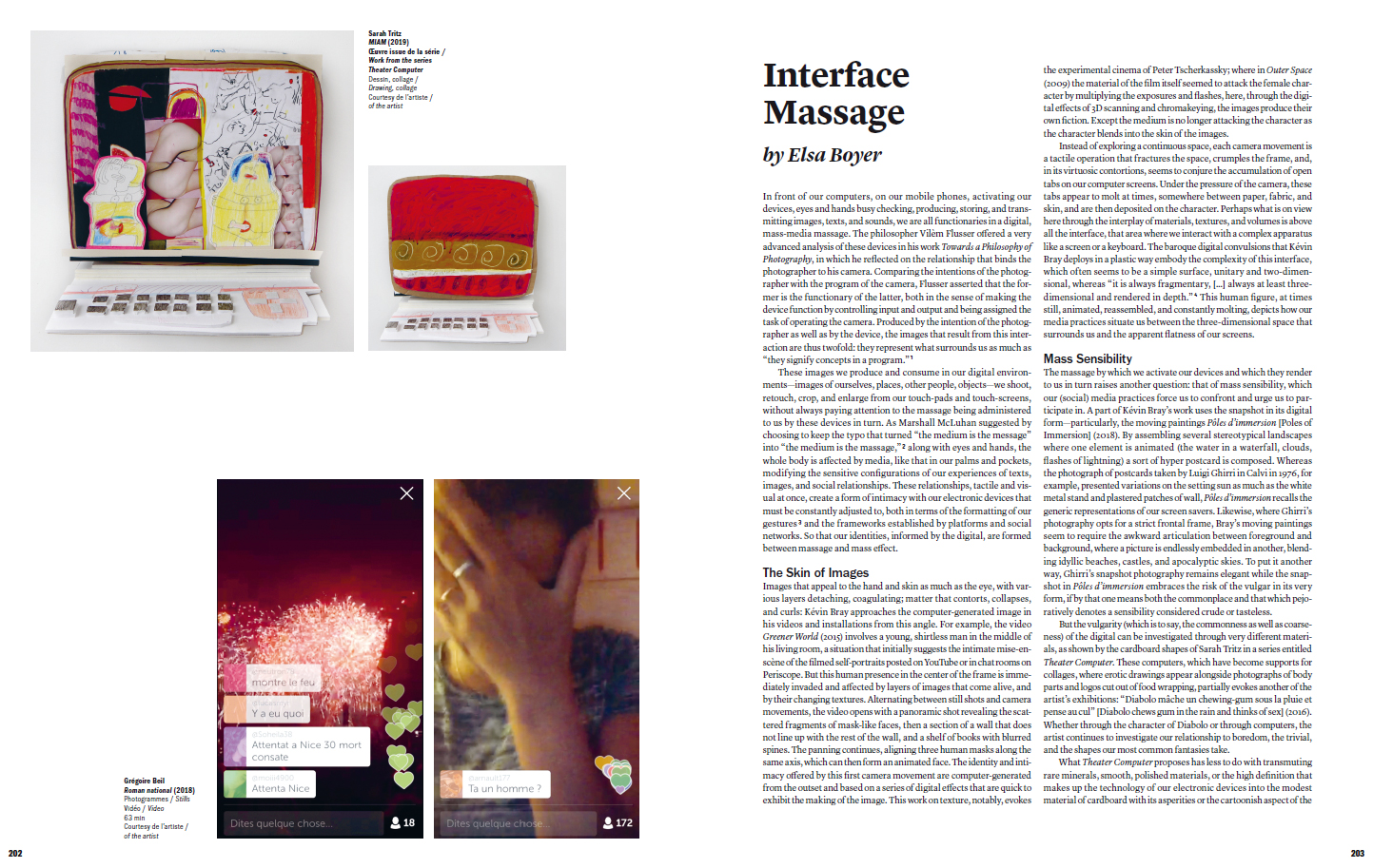 - « Massage d'interface » par Elsa Boyer, étudie les rapports intimes, corporels et émotionnels que nous développons au contact des interfaces et outils numériques et comment des artistes s'en emparent