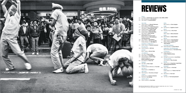 Lauren O'Neill-Butler sur Agnes Denes, Barry Schwabsky sur Jean Dubuffet, Jace Clayton sur Christian Marclay ; quatre artists et critiques réévaluent l'hésitage de Douglas Crimp ; Amy Taubin sur The Laundromat de Steven Soderbergh ; les comptes-rendus d'exposition à Paris, Zurich, Basel, Vilnius, etc.