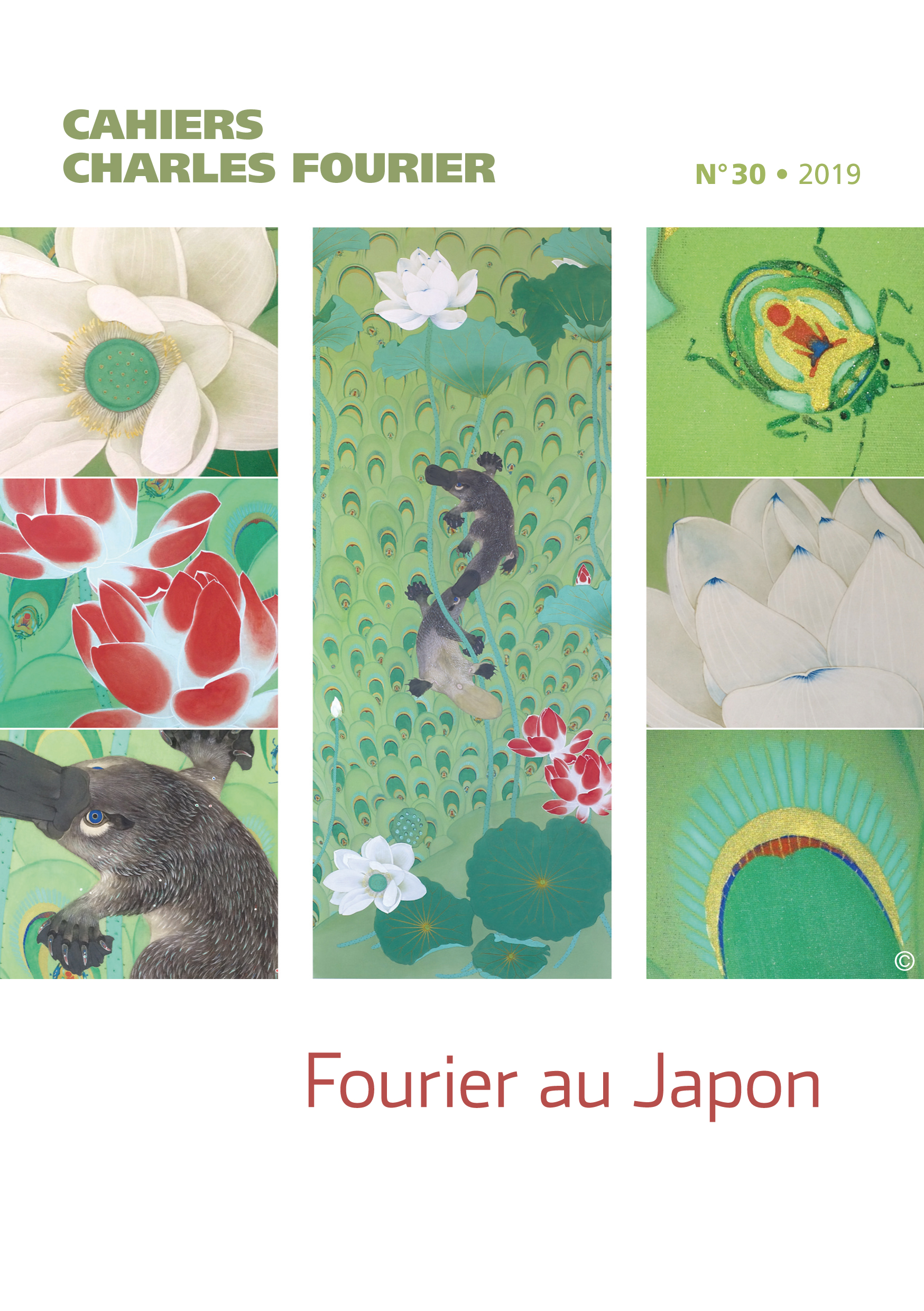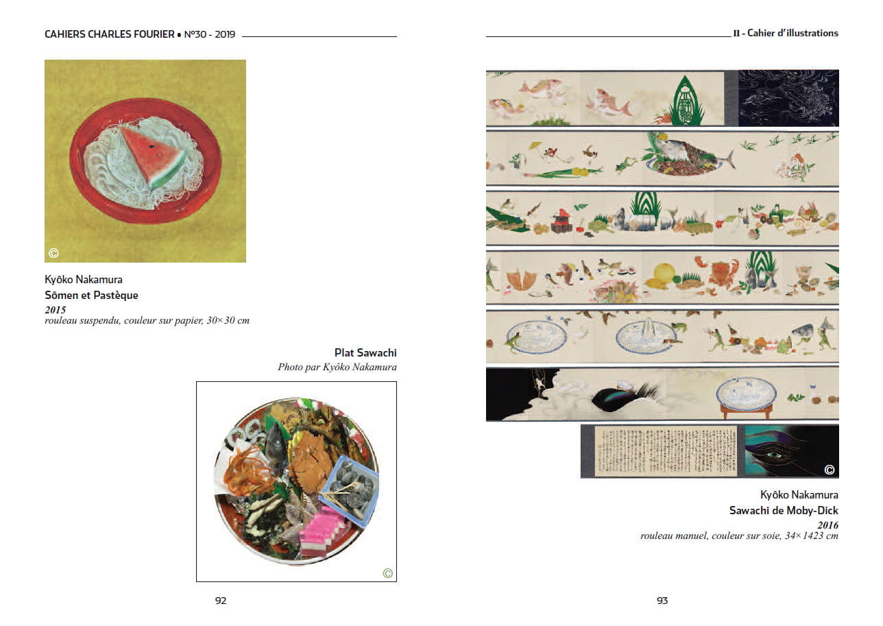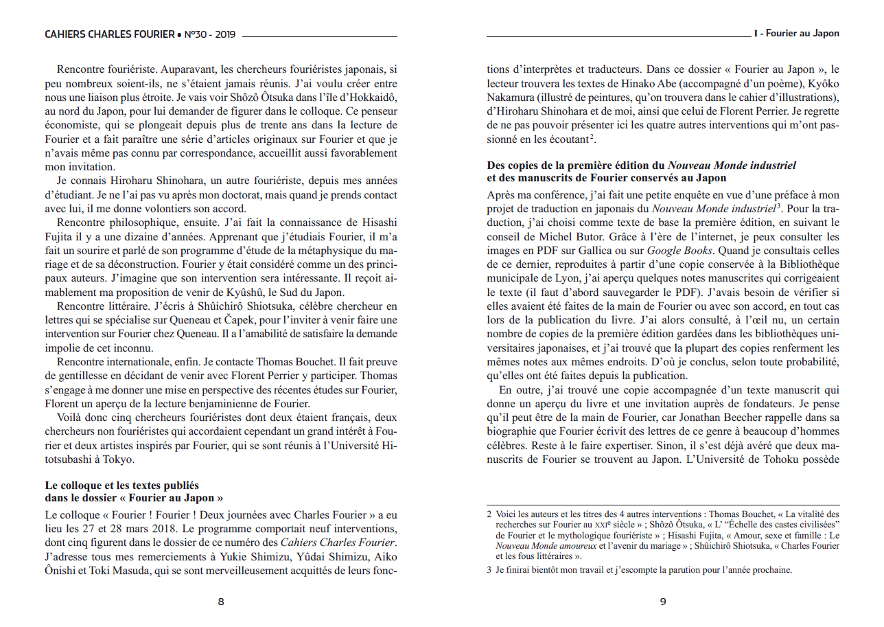 Le trentième numéro des Cahiers Charles Fourier, intitulé « Fourier au Japon », se tourne vers une contrée que l'imaginaire utopique de Fourier n'a pourtant pas arpentée. Depuis 2006 et la traduction par Tomomi Fukushima du Nouveau Monde amoureux, un nouveau regard est porté par les artistes japonais-es sur l'amour libre et les diverses « fantaisies du goût », qu'elles soient amoureuses ou gastrosophiques. Ce numéro en offre deux expressions picturales et poétiques (par Kyôko Nakamura et Hinako Abe), qui ornent sa couverture et ses pages intérieures. Il est complété par les recherches originales de 2 universitaires japonais spécialistes de Fourier (T. Fukushima et Hiroharu Shinoharu), qui croisent celles de Florent Perrier.