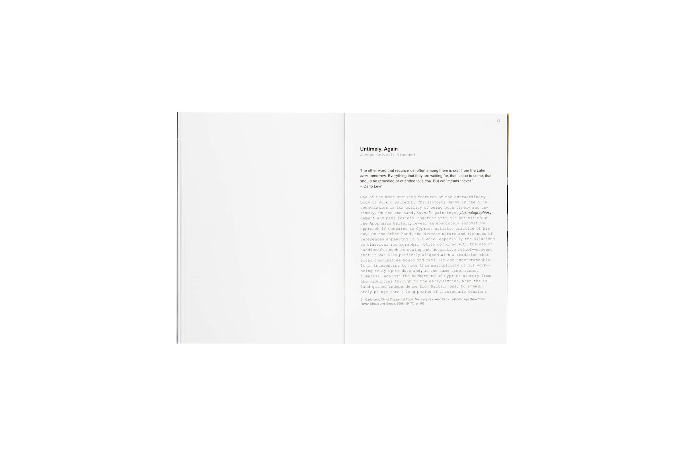 Catalogue monographique consacré à la vie et à l'œuvre de Christoforos Savva, figure tutélaire de la scène artistique chypriote naissante des années 1960 (catalogue de l'exposition du pavillon chypriote à la 58e Biennale de Venise, organisé en l'honneur du cinquantième anniversaire de la mort de l'artiste).
