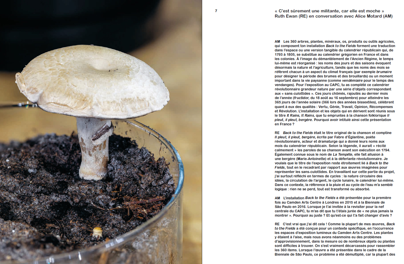 Le CAPC développe depuis 2017 une nouvelle série d'ouvrages dédiée aux installations spécifiques de la nef qui construisent depuis plus de 40 ans la notoriété du musée d'art contemporain de Bordeaux. Cette série veut rendre hommage et faire valoir une mémoire visuelle forte de ces installations à grande échelle. C'est pourquoi, à travers un choix exigeant, cette série met l'accent sur l'image dans un format approprié. Le 4eme ouvrage de cette série est consacré à l'installation It Rains, It Rains de l'artiste Ruth Ewan présentée au CAPC. Cette installation est une réactivation grandeur nature du calendrier républicain – aussi appelé calendrier révolutionnaire.