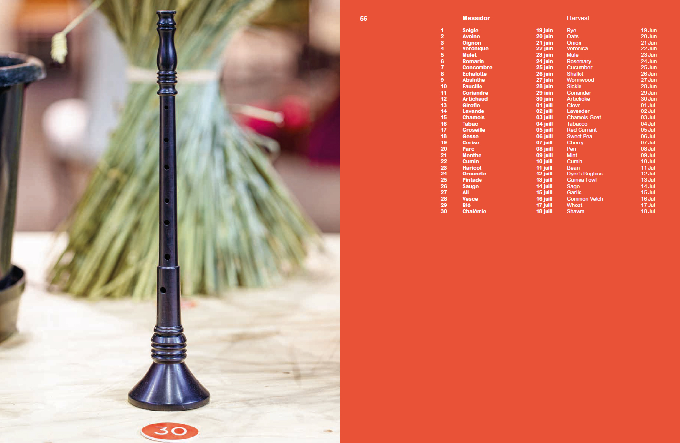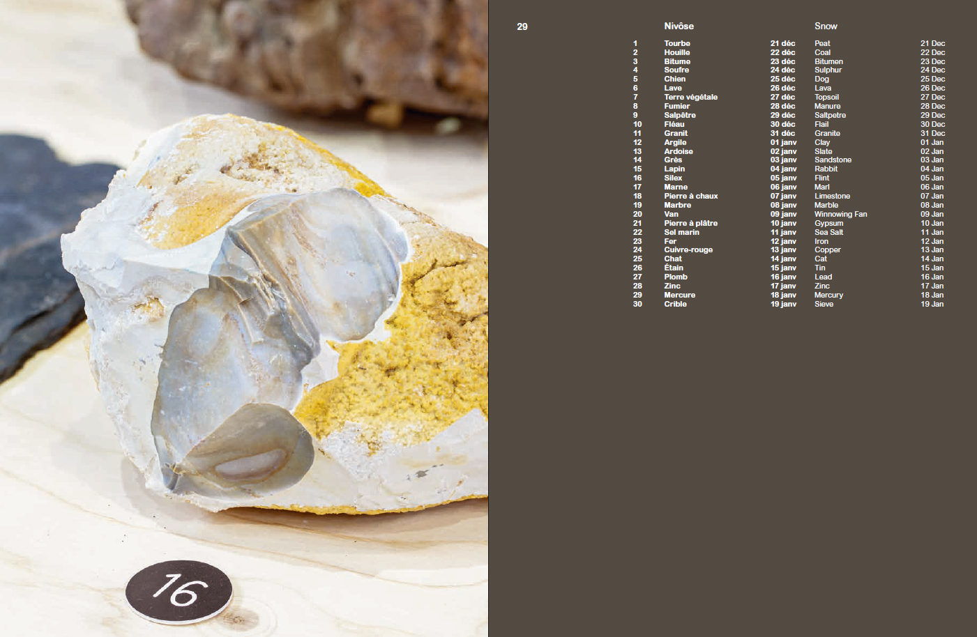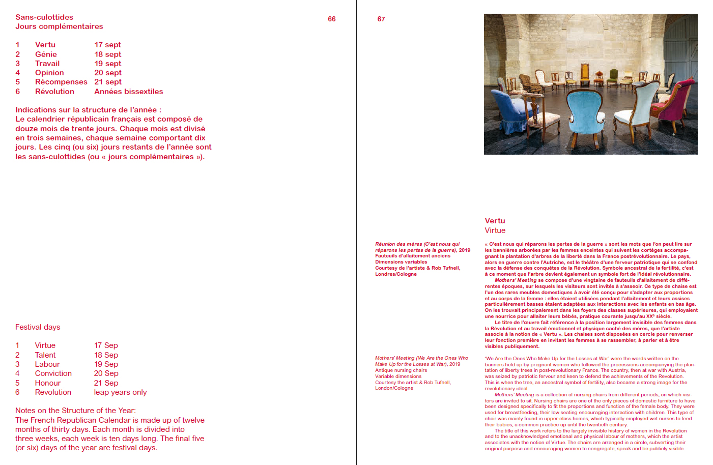 Rassemblant 360 objets utilisés pour désigner chaque jour de l'année comme une laitue, une charrette, de la cire, du miel, un sapin, etc., l'installation – version plastique tangible du calendrier révolutionnaire – nous fait vivre, le temps de l'exposition, au rythme d'une année républicaine.