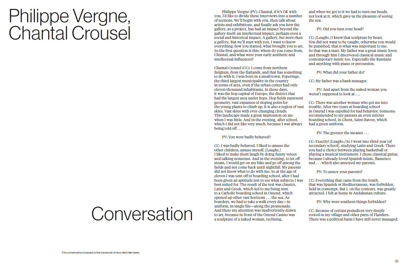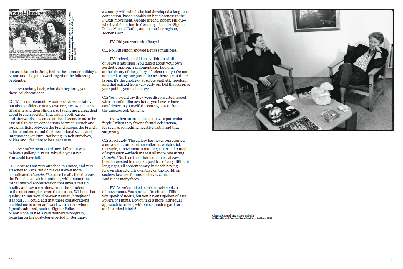 Publié à l'occasion des quarante ans de la galerie Chantal Crousel, cet ouvrage fleuve (plus de 700 pages et 3 kg) revient sur l'histoire de la galerie, considérée comme un acteur majeur de la scène artistique contemporaine, en France comme à l’international.