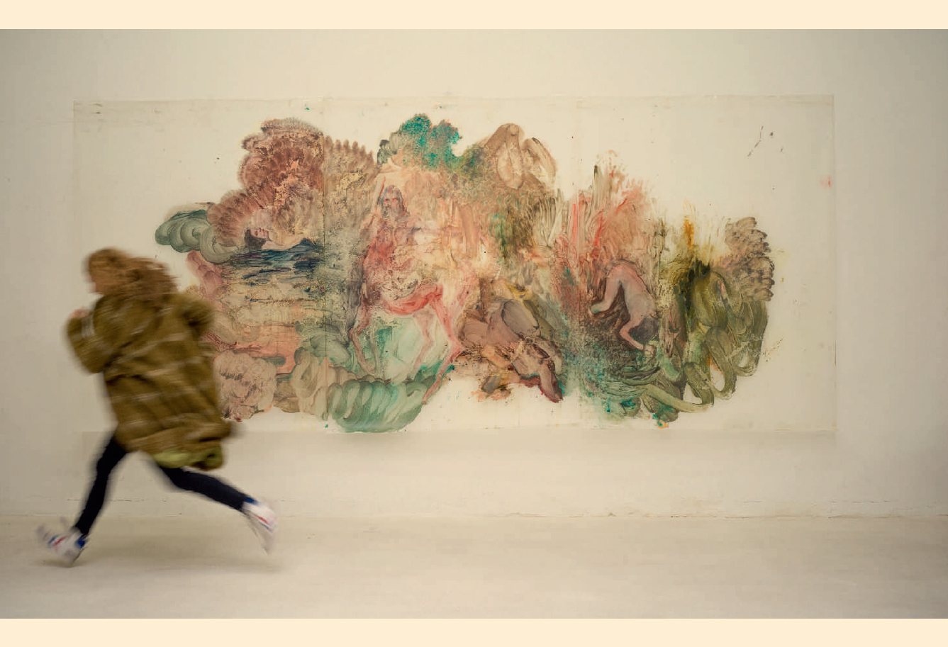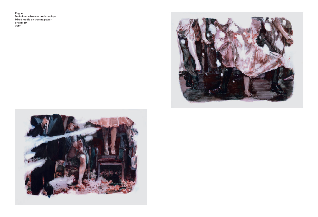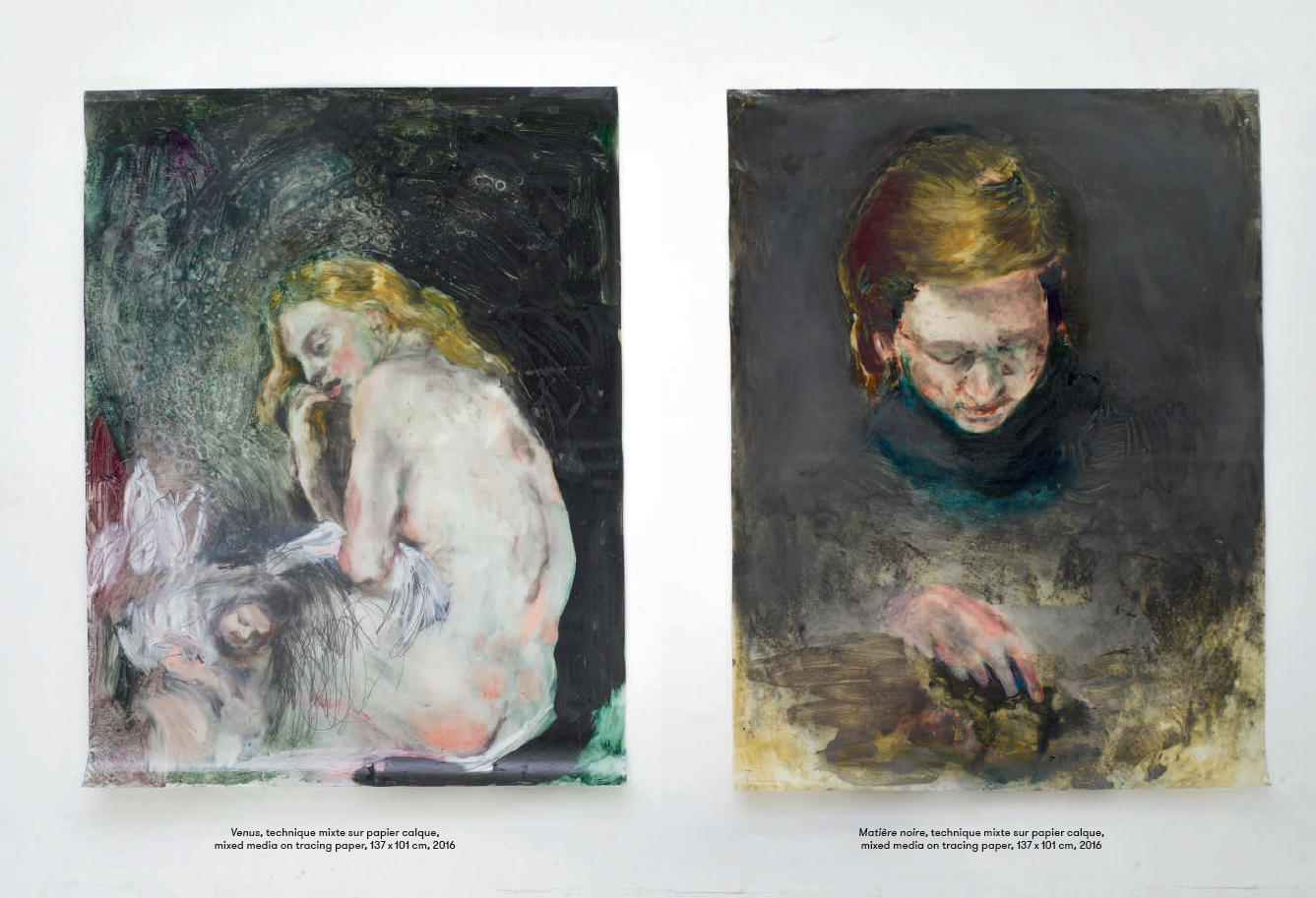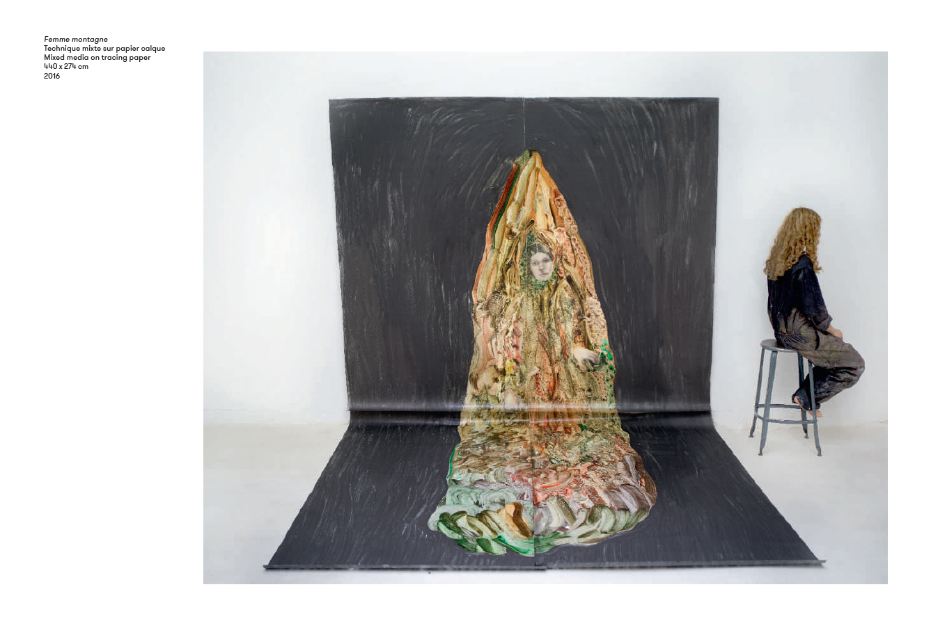 « Un rapport dichotomique que Sarah Jérôme distille dans son œuvre en opérant à des frottements entre la séduction et la répulsion, l'étonnement et l'effroi, le rêve et le cauchemar, la délicatesse et la brutalité. Elle explore un espace entre-deux, deux états, deux sentiments, deux moments. Mue, réalisée en 2013 figure un couple dont les corps sont enchevêtrés. Formés de longs fils de lins tressés, ils semblent surgir de la matière, comme l'apparition d'une vision, d'un souvenir aussi bienveillant qu'angoissant. Les tresses épaisses les emprisonnent, ils sont comme pétrifiés, figés dans le temps. L'artiste fait ici référence à nos ancêtres dont les histoires nourrissent non seulement les nôtres, mais aussi une mémoire collective. Entre présence et absence, ils nous habitent et traversent le temps. Leur apparence fascinante et monstrueuse souligne la complexité de l'histoire humaine. L'artiste fouille la dimension monstrueuse du corps avec une série de peintures intitulée Les Montagnes. Sur des feuilles de calque, la peinture à l'huile est asséchée par l'essence. Les matières opposées sont travaillées par le dessin. L'artiste prélève et creuse la peinture pour faire surgir des visages féminins de montagnes massives et monumentales.