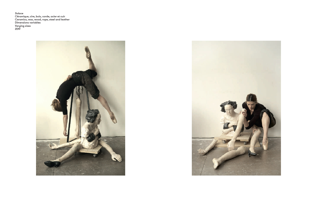 Entre l'âge de sept ans et vingt ans, Sarah Jérôme exerce la danse quotidiennement. Au fil des étirements, des enchaînements et des efforts, elle parvient à sculpter et à modeler son corps. La danse classique appelle à un dressage du corps, une discipline que l'artiste a peu à peu refusée et abandonnée. En 2008, elle décide de se plonger dans le dessin, la peinture et la sculpture. Le corps constitue la colonne vertébrale de sa réflexion plastique. Des ramifications s'opèrent vers d'autres territoires comme le temps, la mémoire, le paysage et la matière. Ses œuvres génèrent des impressions contradictoires. Si la danse représente une source de jouissance et de beauté, elle renferme aussi la douleur, la privation et la soumission. La grâce y est synonyme de torture.
