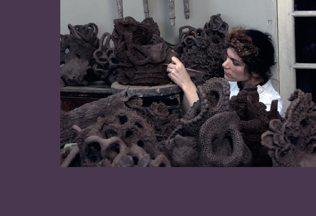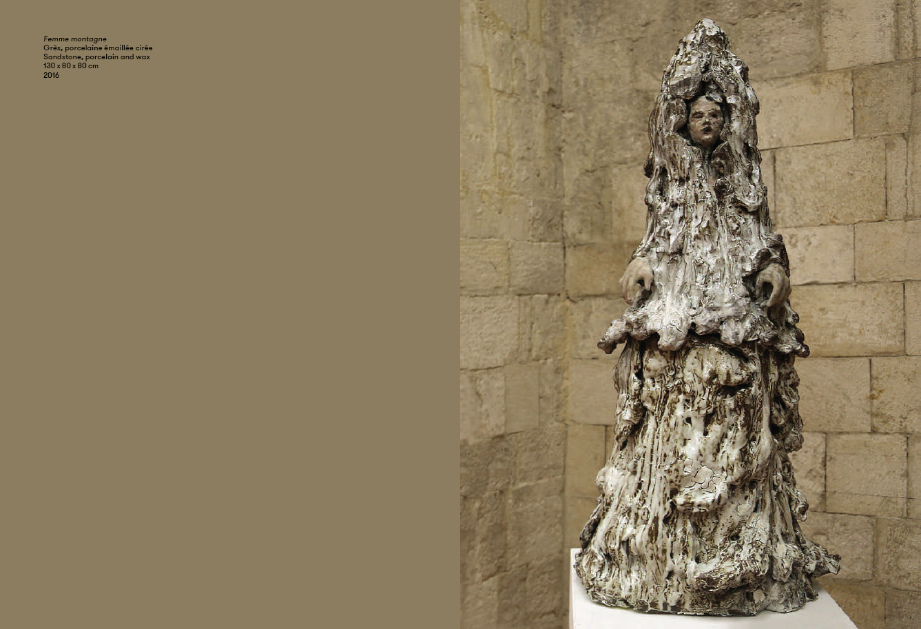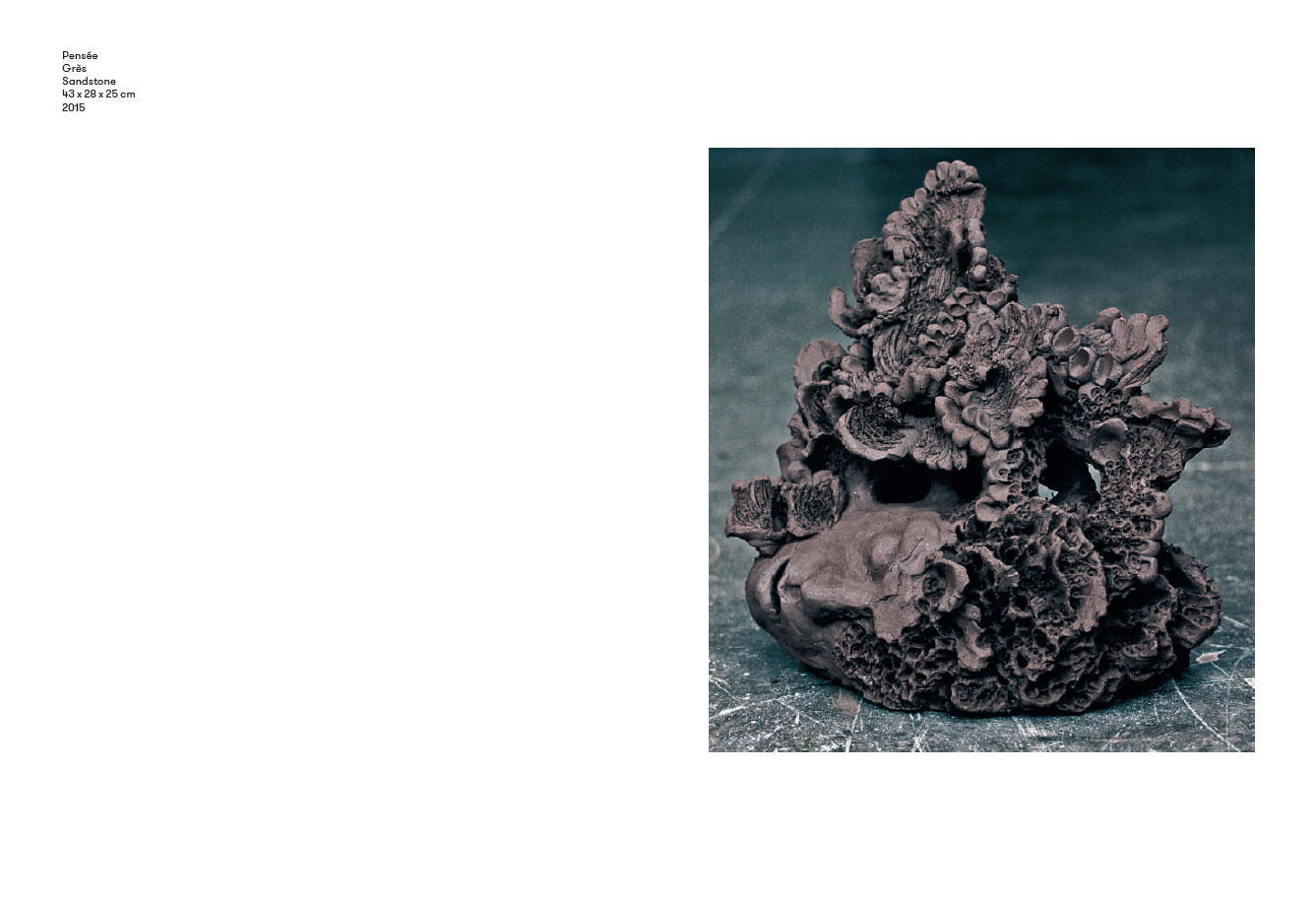 Telles des chrysalides rocheuses renfermant des corps de femmes, les montagnes sont autant un abri à l'intérieur duquel il est possible de se cacher, qu'une prison. Les corps sont ici envisagés comme des constructions formées de couches et de strates. Pris dans la matière et dans l'ambivalence, ils sont en devenir ou bien murés dans la douleur et l'impossibilité. Il en est de même pour les visages sculptés dans la terre. Le Champs de Pensées est composé de têtes endormies disposées au sol, elles sont survolées par un groupe de corbeaux dont les intentions sont aussi menaçantes que protectrices. En hybridant le corps, la nature et la mémoire, Sarah Jérôme revisite un registre symboliste convoquant la magie, la religion, les mythologies et la poésie. Son œuvre engendre une vision plurielle de notre histoire, des relations humaines et de nos relations à la nature. Entre épanouissement et aliénation, l'artiste sonde la matière humaine pour en extraire les trésors monstrueux. »
