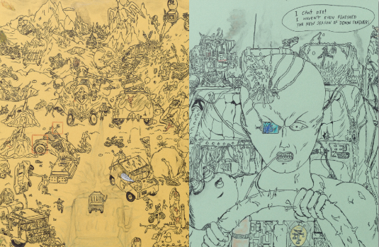 Une série d'illustrations mettant en scène des automobiles au sein d'un monde post-apocalyptique inspiré par l'esthétique dystopique des années 1980-1990.