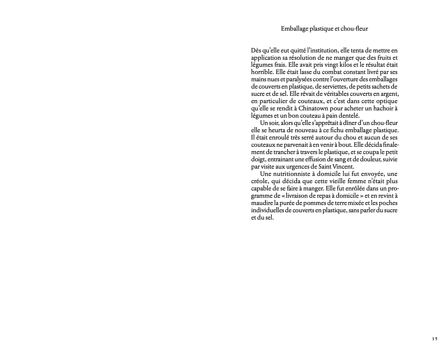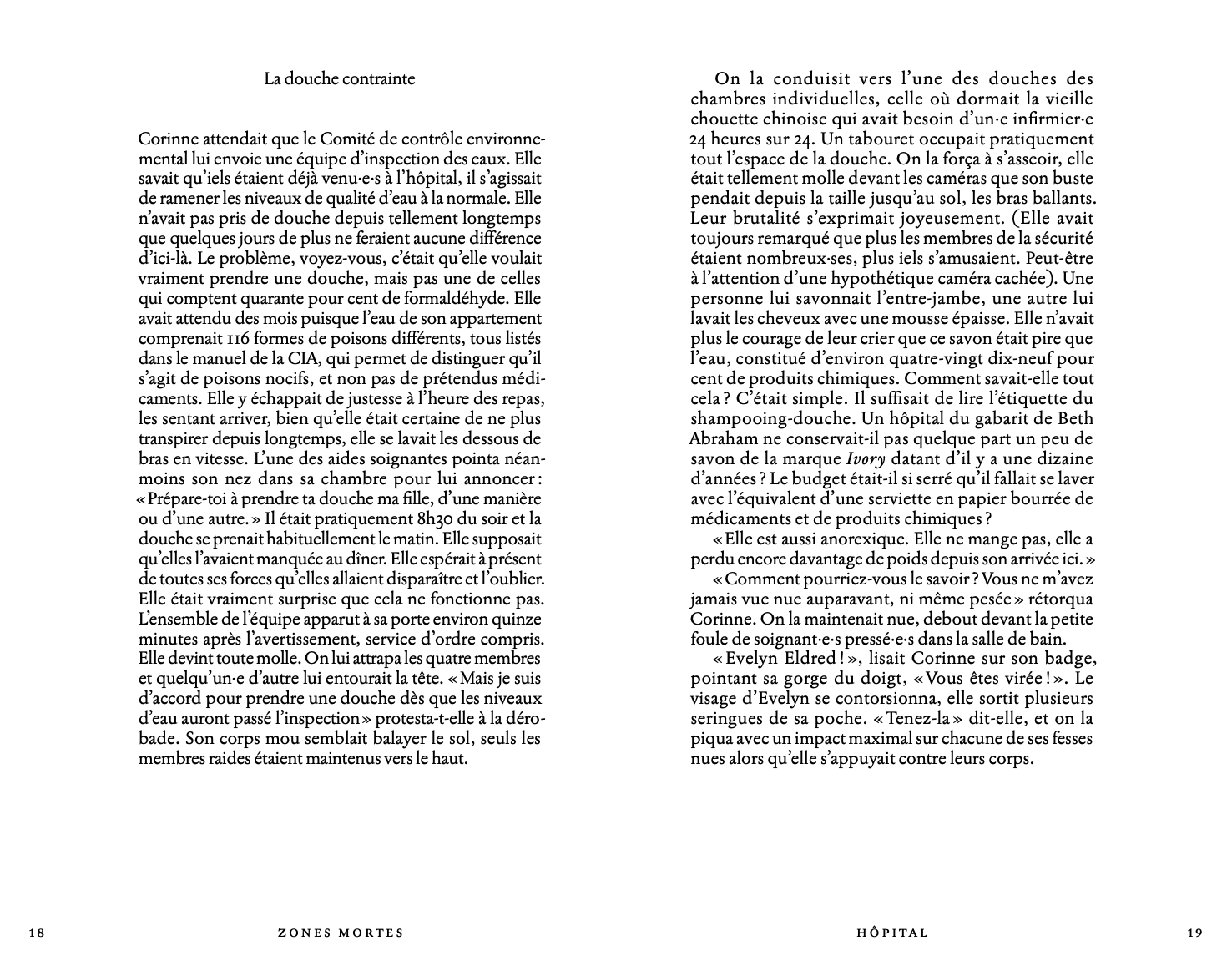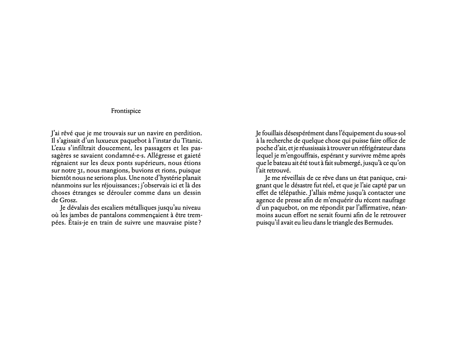 « J'ai rêvé que je me trouvais sur un navire en perdition. Il s'agissait d'un luxueux paquebot à l'instar du Titanic. L'eau s'infiltrait doucement, les passagers et les passagères se savaient condamné·e·s. Allégresse et gaieté régnaient sur les deux ponts supérieurs, nous étions sur notre 31, nous mangions, buvions et rions, puisque bientôt nous ne serions plus. Une note d'hystérie planait néanmoins sur les réjouissances ; j'observais ici et là des choses étranges se dérouler comme dans un dessin de Grosz. »