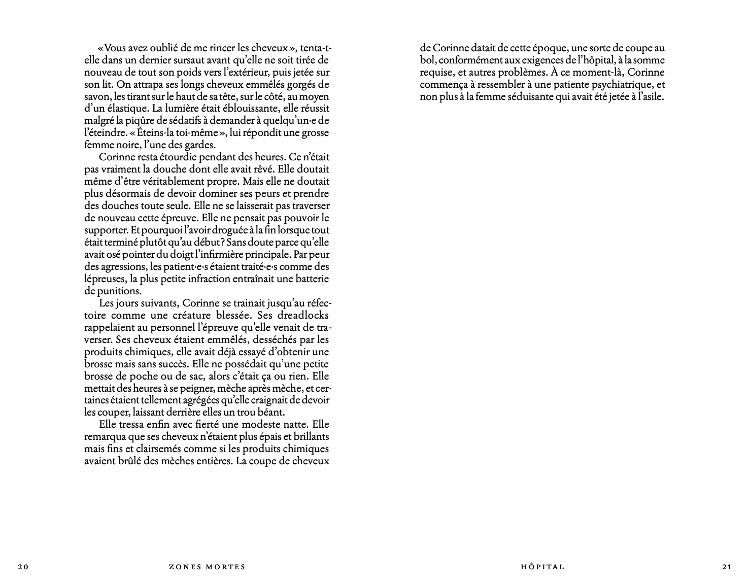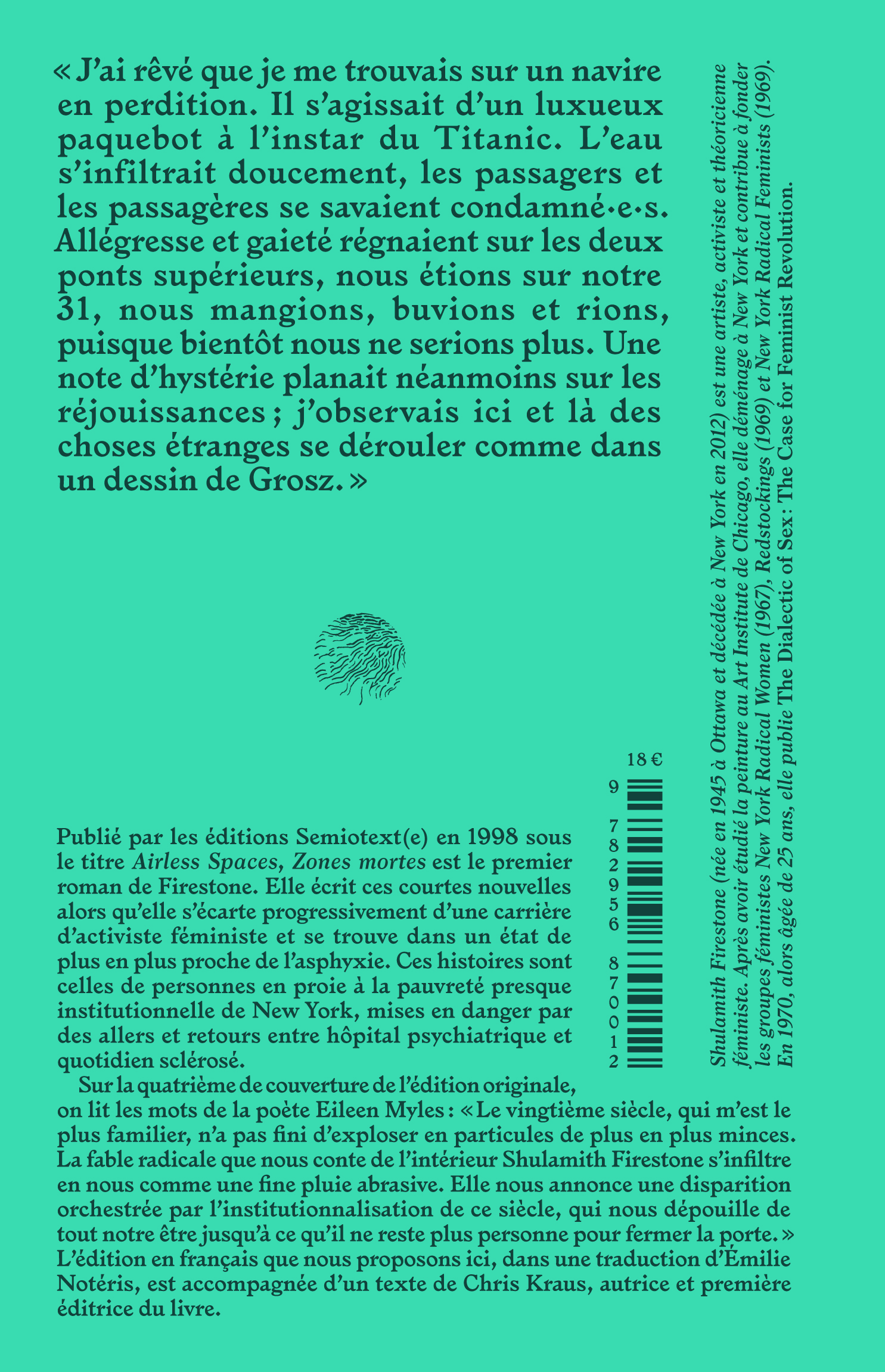 Zones mortes est le premier roman de Shulamith Firestone. Elle écrit ces courtes nouvelles alors qu'elle s'écarte progressivement d'une carrière d'activiste féministe et se trouve dans un état de plus en plus proche de l'asphyxie. Ces histoires sont celles de personnes en proie à la pauvreté presque institutionnelle de New York, mises en danger par des allers et retours entre hôpital psychiatrique et quotidien sclérosé. Sur la quatrième de couverture de l'édition originale, on lit les mots de la poète Eileen Myles : « Le vingtième siècle, qui m'est le plus familier, n'a pas fini d'exploser en particules de plus en plus minces. La fable radicale que nous conte de l'intérieur Shulamith Firestone s'infiltre en nous comme une fine pluie abrasive. Elle nous annonce une disparition orchestrée par l'institutionnalisation de ce siècle, qui nous dépouille de tout notre être jusqu'à ce qu'il ne reste plus personne pour fermer la porte. »