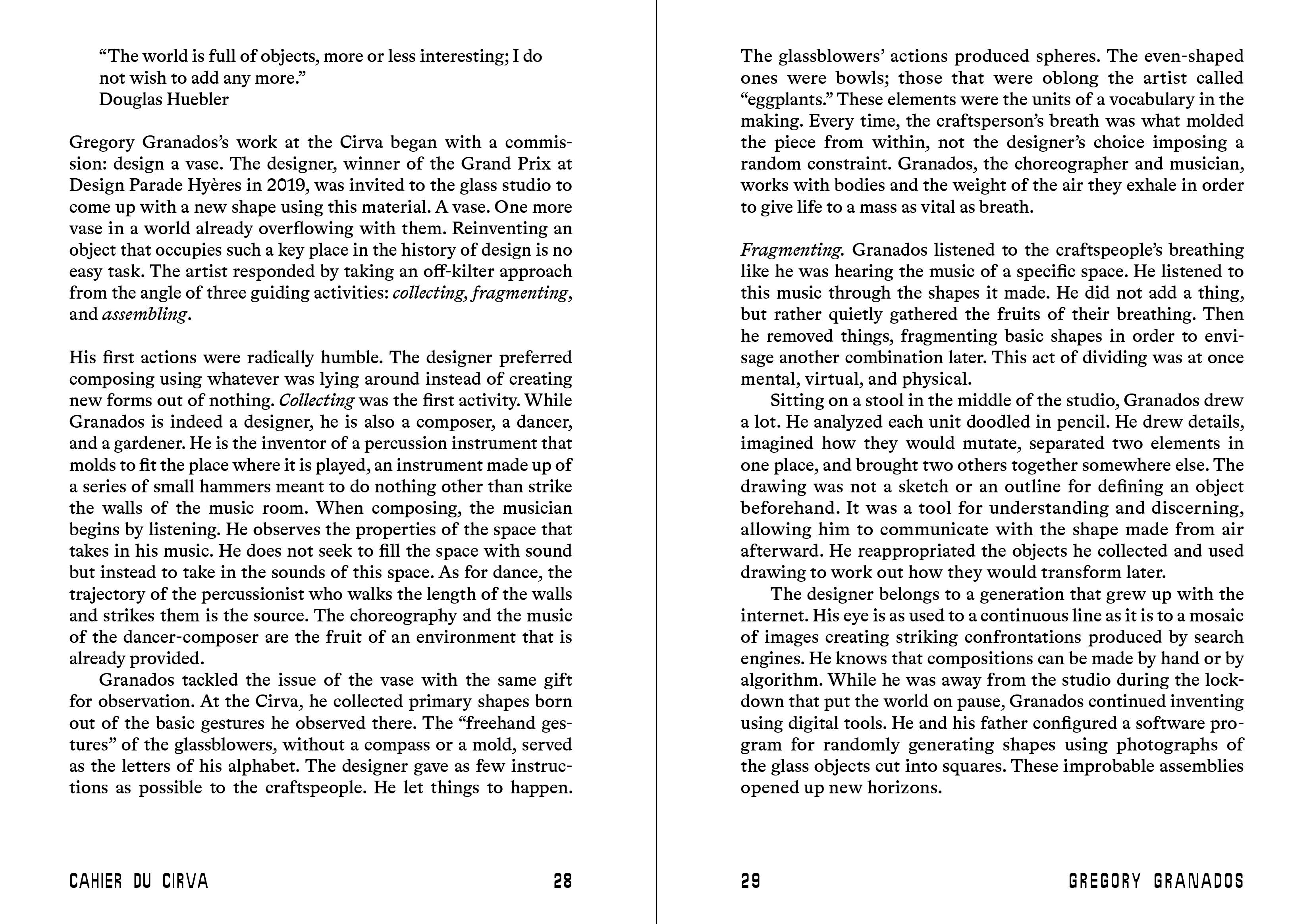 Gregory Granados, tantôt danseur, musicien ou encore jardinier, imagine ainsi dans ce cahier la forme idéale d'un vase accueillant une plante dansante – une Desmodium gyrans, une espèce dont le feuillage s'agite à la diffusion de certaines fréquences. Sa recherche discrète et subtile articule des formes données comme autant de samples. Il définit cette attitude à la fois contemplative et festive à partir d'une liste d'actions, « récolter, fragmenter, assembler », qui constituent la trame de son lexique et de sa méthodologie à l'égard du verre.