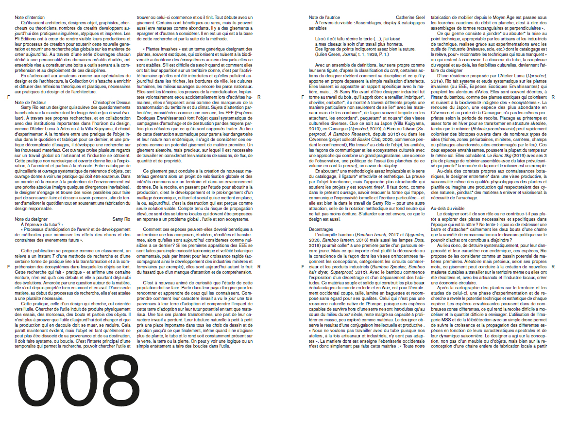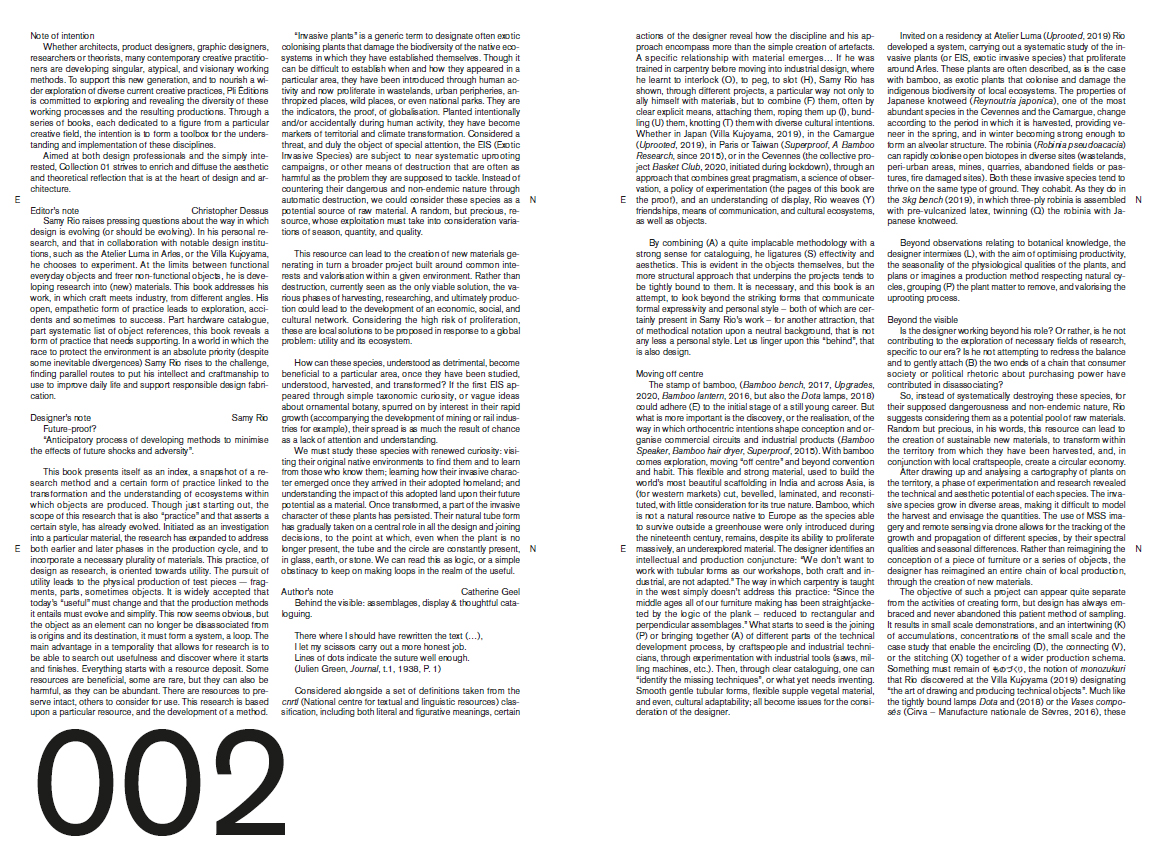 Un par un, les échantillons sont décortiqués et analysés afin d'en extraire des commentaires et des solutions qui sauront inspirer les concepteurs du design et de l'architecture de demain. L'édition se positionne comme un état des lieux des explorations menées par le designer en présentant le résultat de cinq années de recherches en France et à l'international.