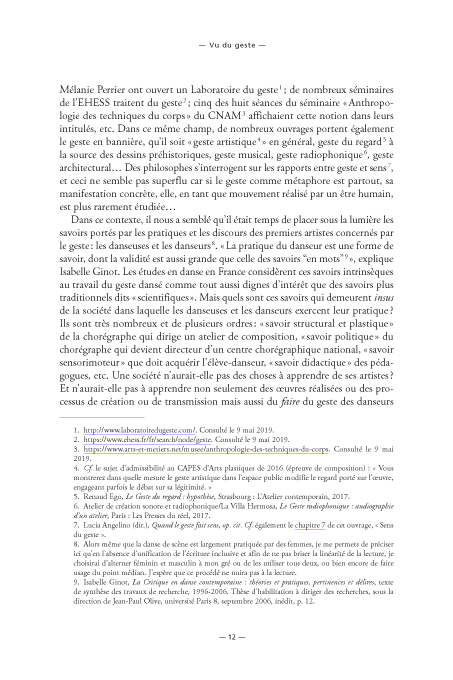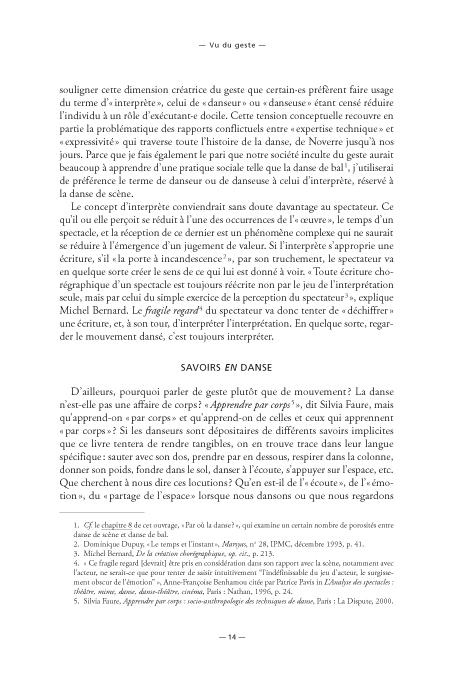« S'appuyer sur l'air », « partager l'espace », « donner son poids », « danser à l'écoute »… Les danseurs et les danseuses sont dépositaires de savoirs implicites dont on trouve trace dans leur langue. Mais comment faire la lumière sur ces savoirs issus de l'expérience du geste et de la perception ? Sur quelle pensée de l'imaginaire ou de l'émotion prendre appui pour saisir au mieux les enjeux du geste dansé ? Comment « lire » ce geste, et avec quels outils ? Comment peut-il