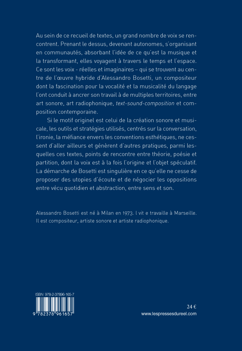 Au sein de ce recueil de textes, un grand nombre de voix se rencontrent. Prenant le dessus, devenant autonomes, s'organisant en communautés, absorbant l'idée de ce qu'est la musique et la transformant, elles voyagent à travers le temps et l'espace. Ce sont les voix – réelles et imaginaires – qui se trouvent au centre de l'œuvre hybride d'Alessandro Bosetti, un compositeur dont la fascination pour la vocalité et la musicalité du langage l'ont conduit à ancrer son travail à de multiples territoires, entre art sonore, art radiophonique, text-sound-composition et composition contemporaine.