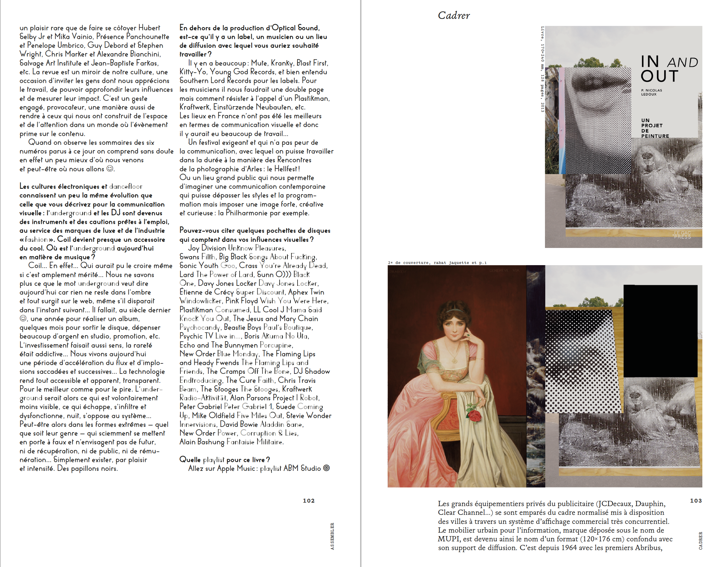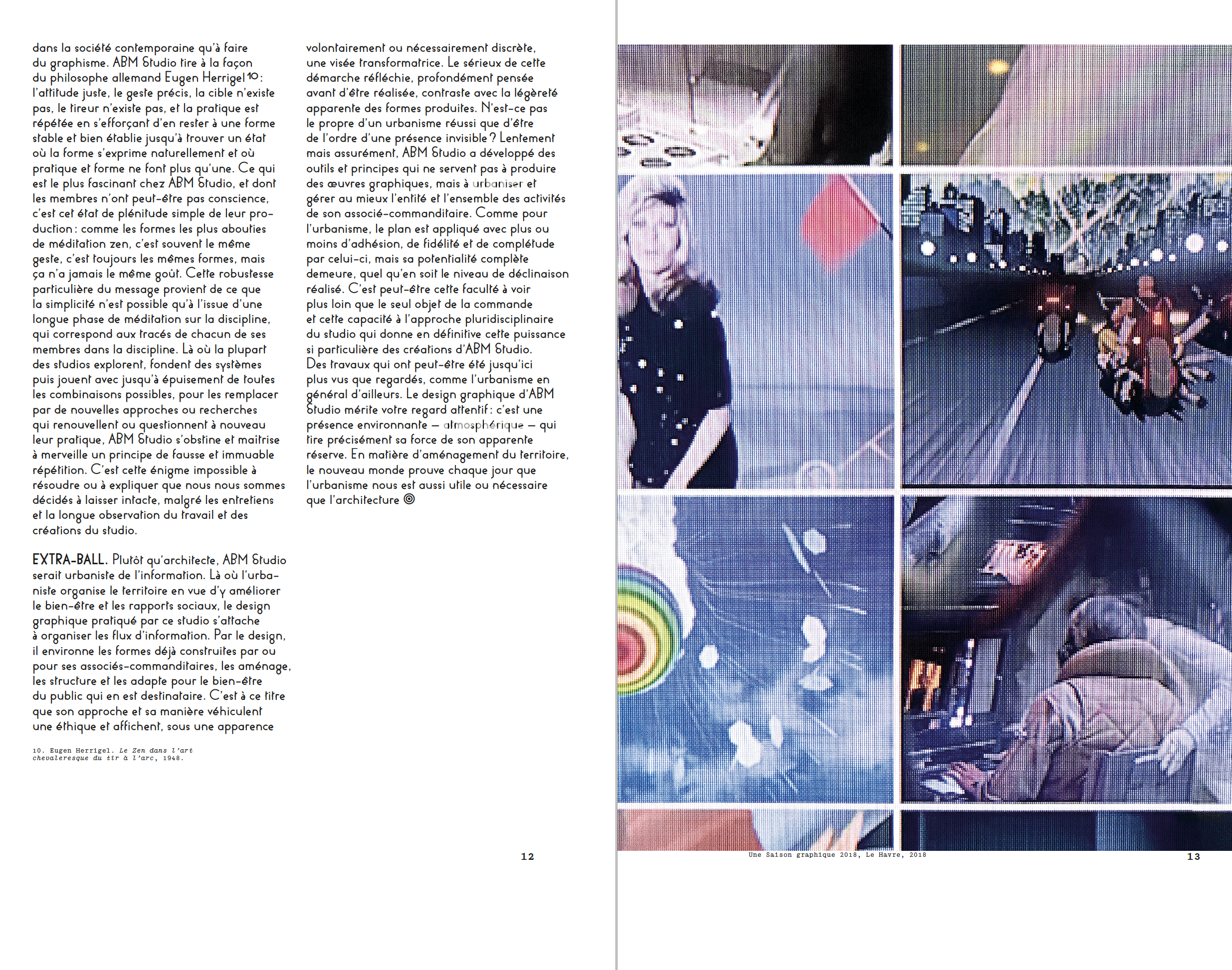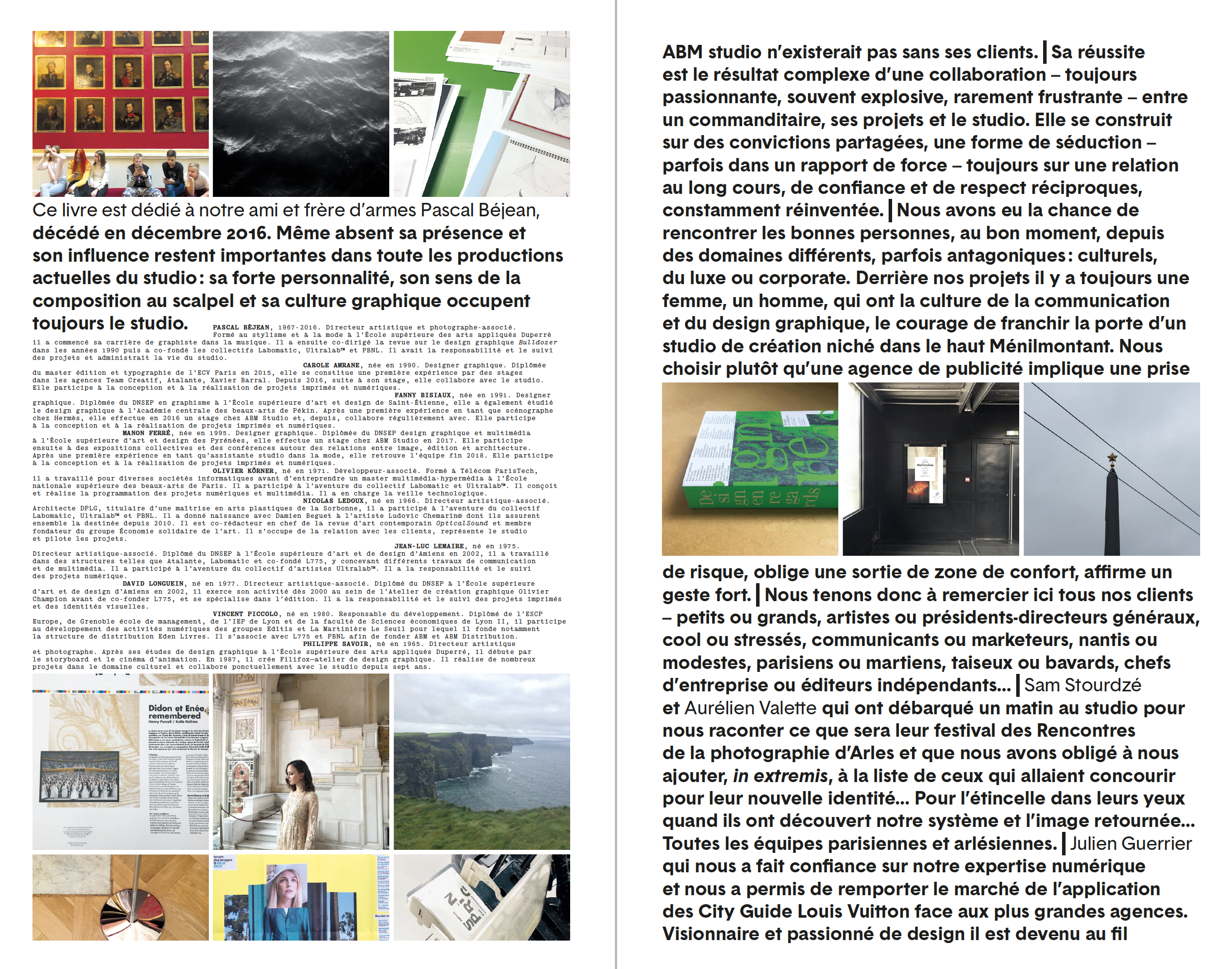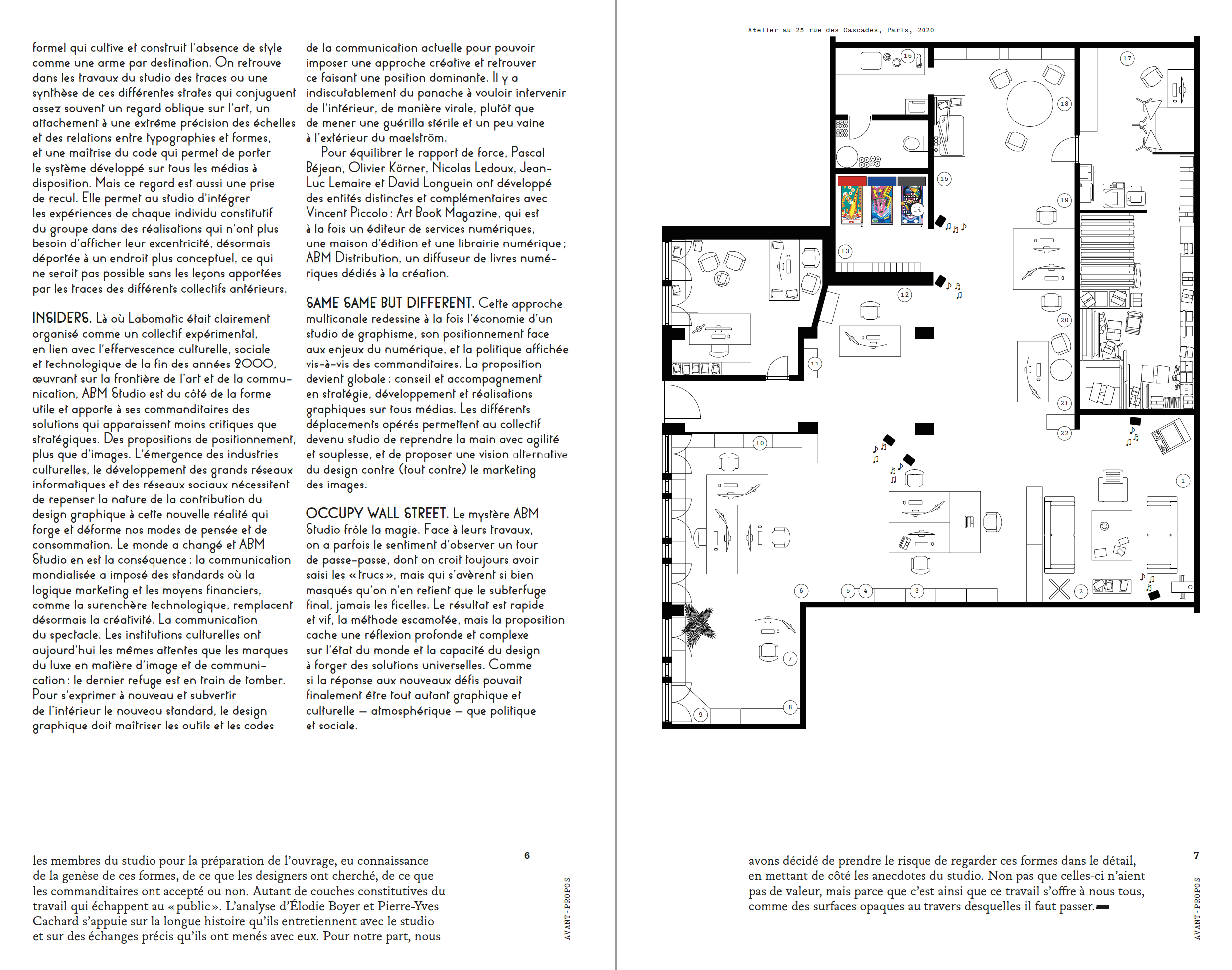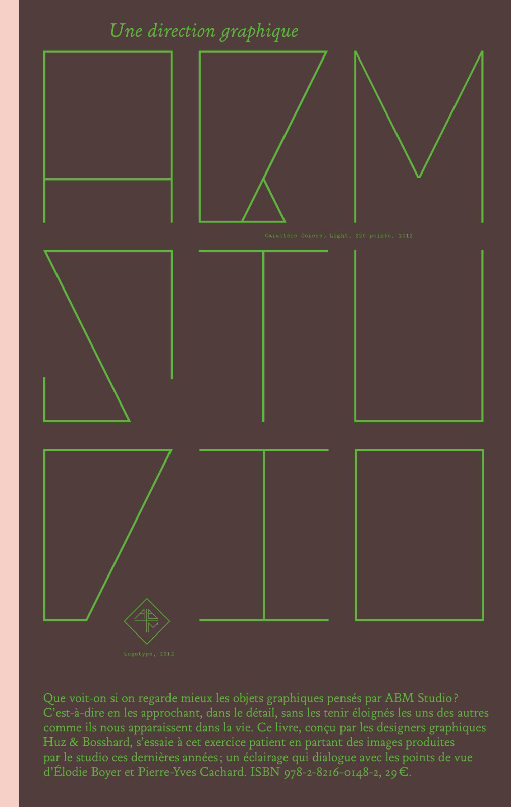 « Le livre d'Olivier Huz, accompagné d'Élodie Boyer et Pierre-Yves Cachard, est un ouvrage sur un atelier de graphisme. Il n'en paraît pas tous les jours. Depuis le 25, rue des Cascades, dans le 20e arrondissement parisien, le collectif ABM Studio conçoit des affiches et des documents pour les Rencontres de la photographie d'Arles, le Forum des images à Paris ou l'Opéra de Lyon. Pratiquant un humour visuel distancié, ses membres aiment les associations d'images étranges et les mises en page faussement neutres, qui tranchent avec les codes habituels de la communication. Du plan de leurs bureaux à leur playlist mélangeant Brian Eno, Philip Glass, les Stooges et Kraftwerk, on se plonge dans leur métier fait d'une grande exigence. Chez ABM Studio, pas de fausse amabilité ni de complaisance. Chaque création est une œuvre radicale qui nettoie le regard. Quant au livre, maquetté par un autre atelier, Huz & Bosshard, il est à leur image : un mélange intrigant de chahut et de minimalisme servi sur papier épais rehaussé d'aplats fluo. »