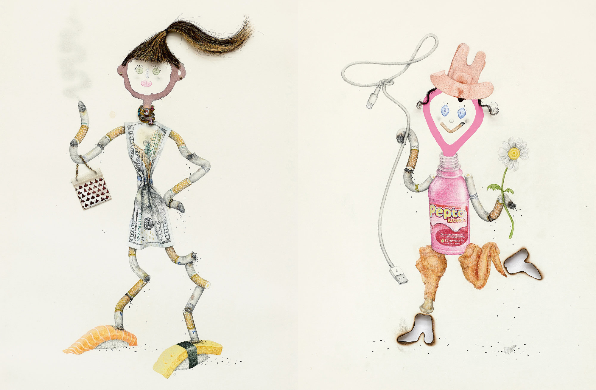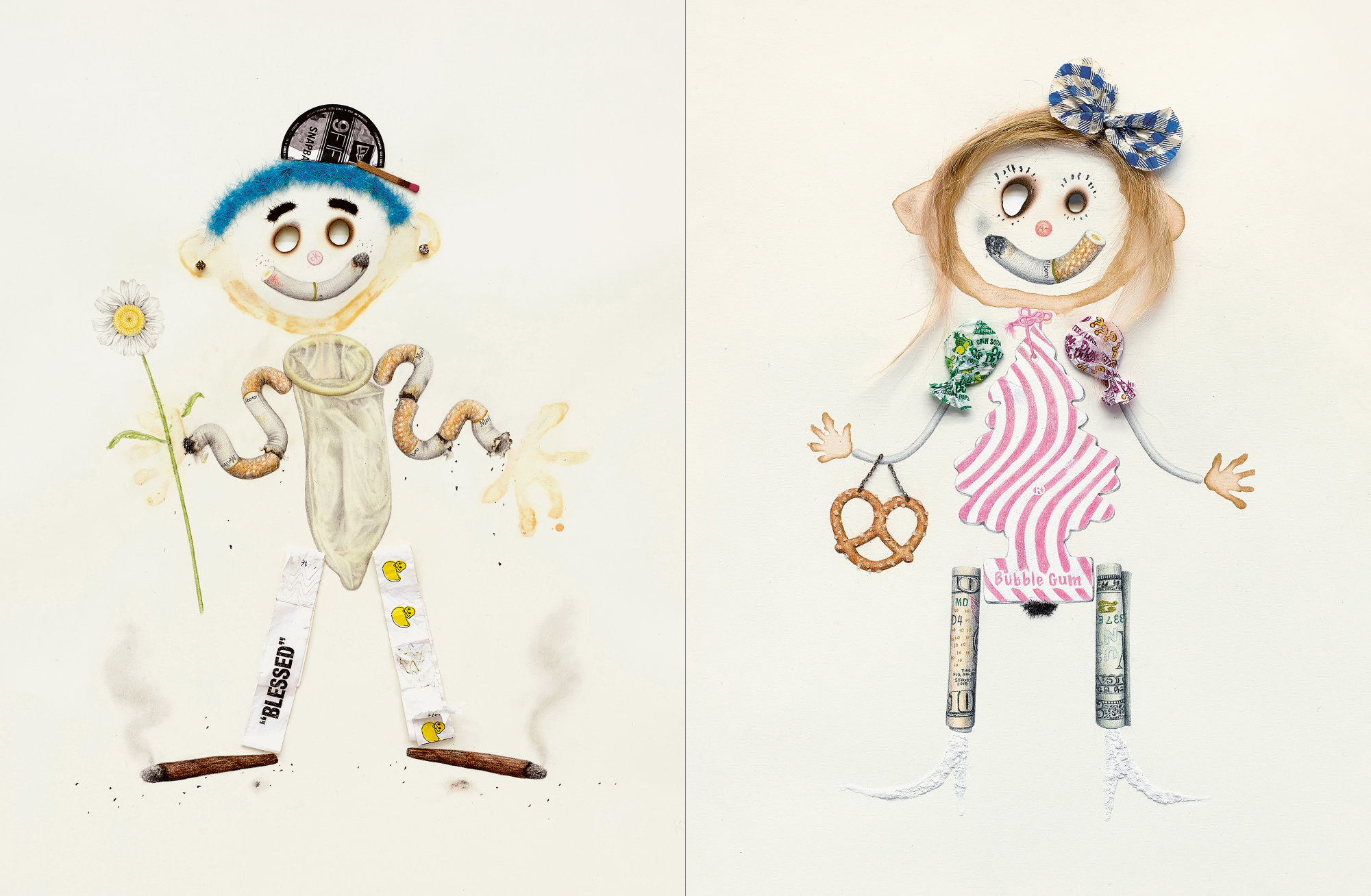 Les dessins-collages d'Aurel Schmidt de la série des « poupées », incorporant objets trouvés et détritus divers, mouches, préservatifs, mégots, fluides corporels, etc., reflets de la vie new-yorkaise de l'artiste, constituant une sorte de memento mori contemporain.