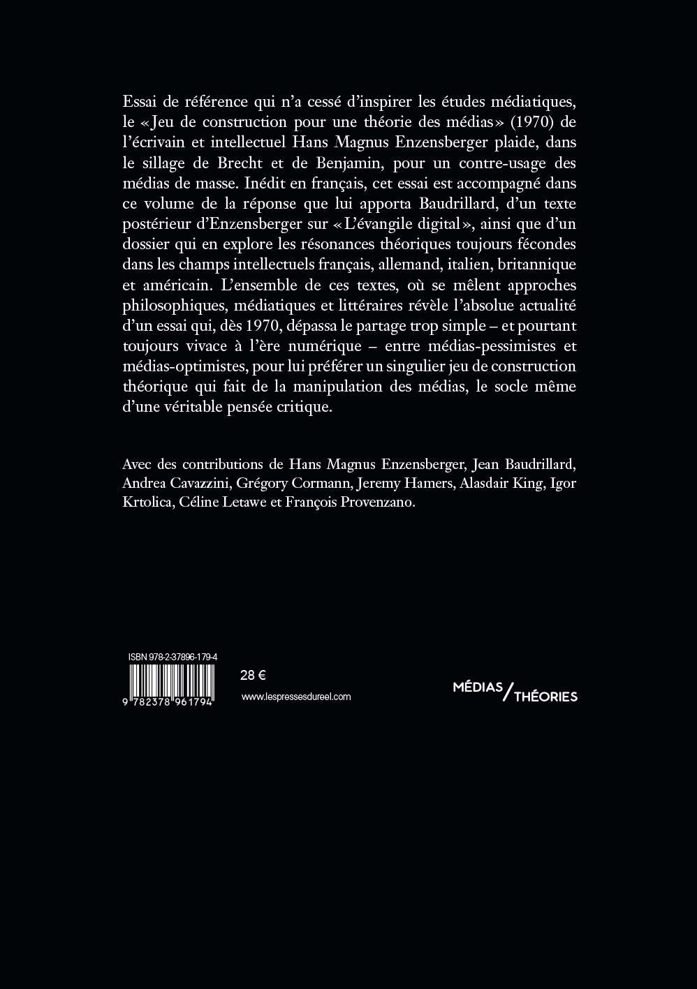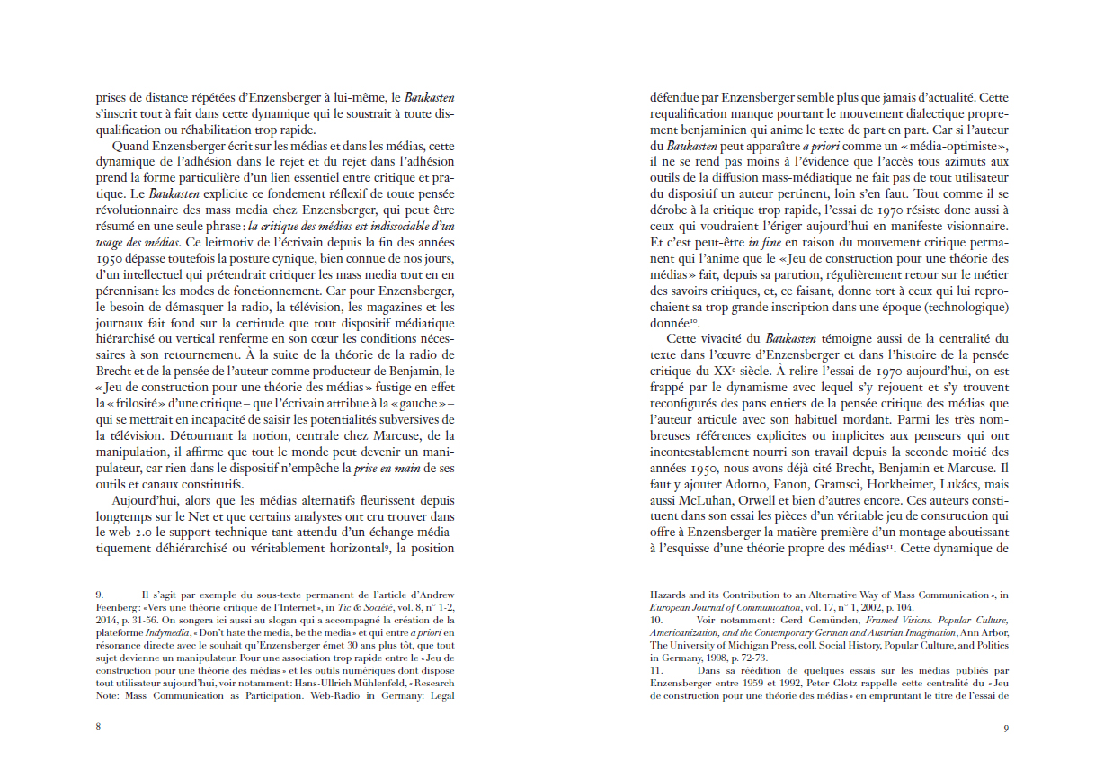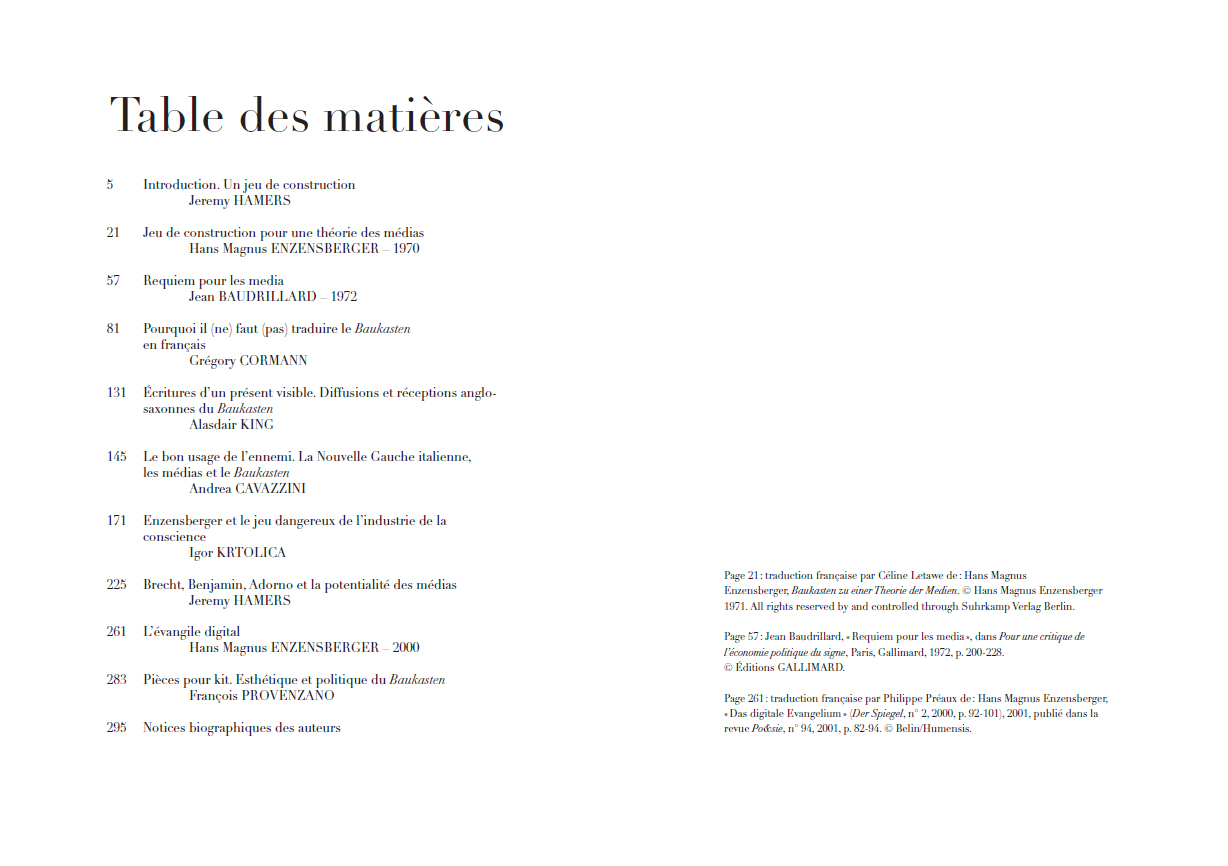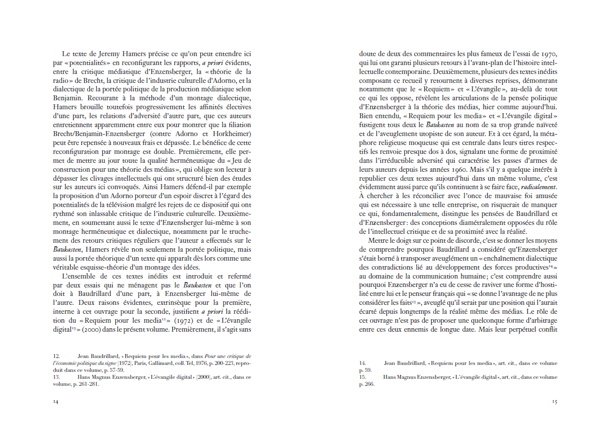 Benjamin, pour un contre-usage des médias de masse. Inédit en français, cet essai est accompagné dans ce volume de la réponse que lui apporta Baudrillard, d'un texte postérieur d'Enzensberger sur « L'évangile digital », ainsi que d'un dossier qui en explore les résonances théoriques toujours fécondes dans les champs intellectuels français, allemand, italien, britannique et américain. L'ensemble de ces textes, où se mêlent approches philosophiques, médiatiques et littéraires révèle l'absolue actualité d'un essai qui, dès 1970, dépassa le partage trop simple – et pourtant toujours vivace à l'ère numérique – entre médias-pessimistes et médias-optimistes, pour lui préférer un singulier jeu de construction théorique qui fait de la manipulation des médias, le socle même d'une véritable pensée critique.