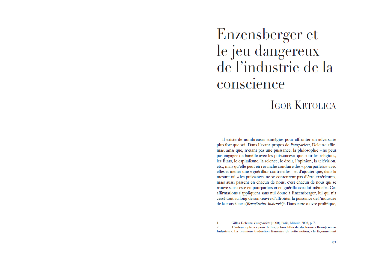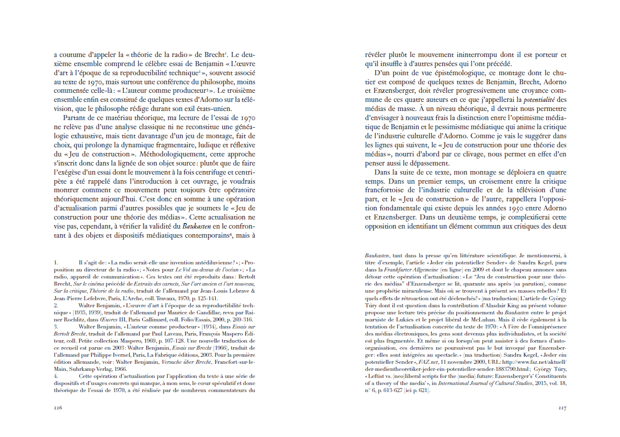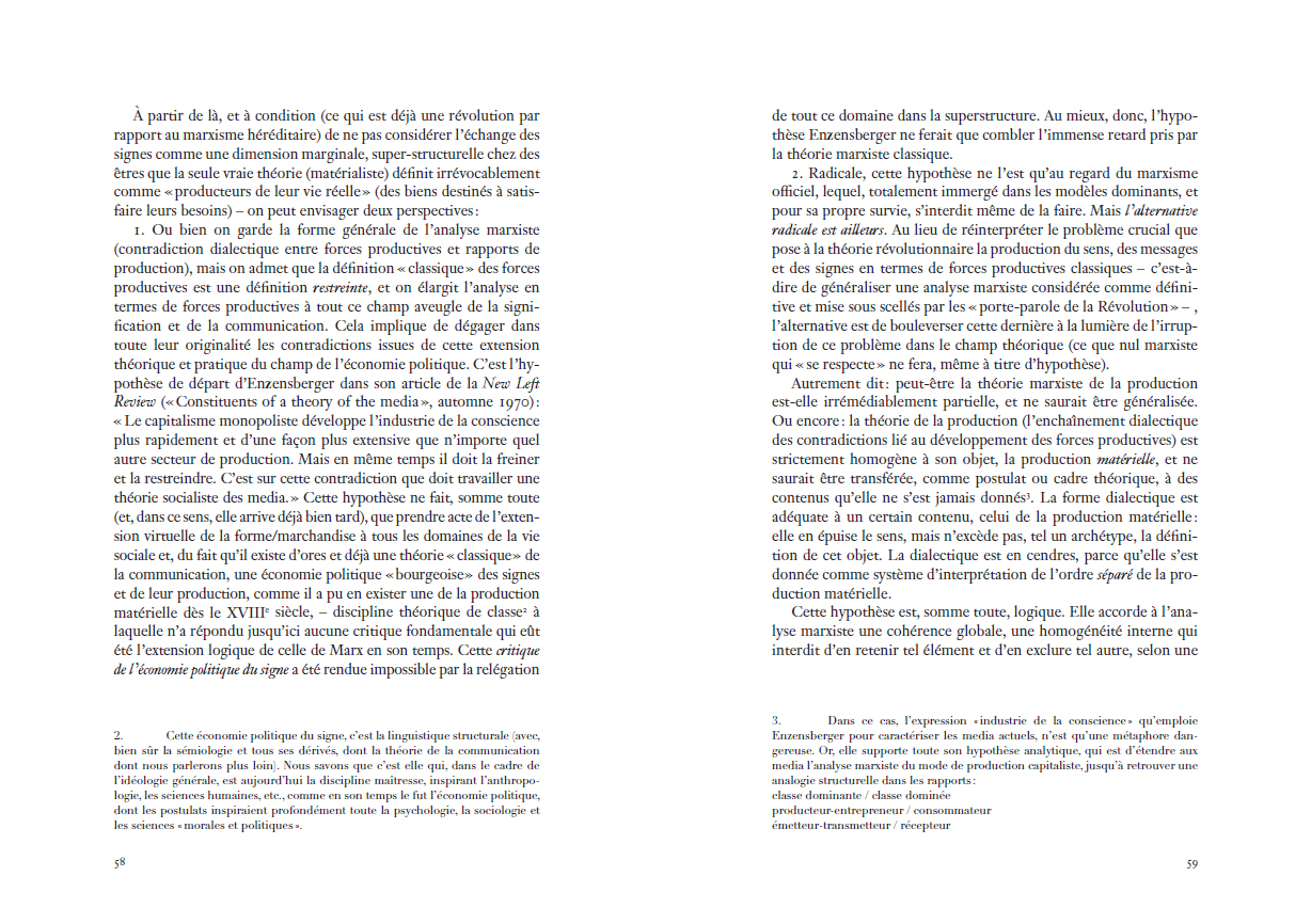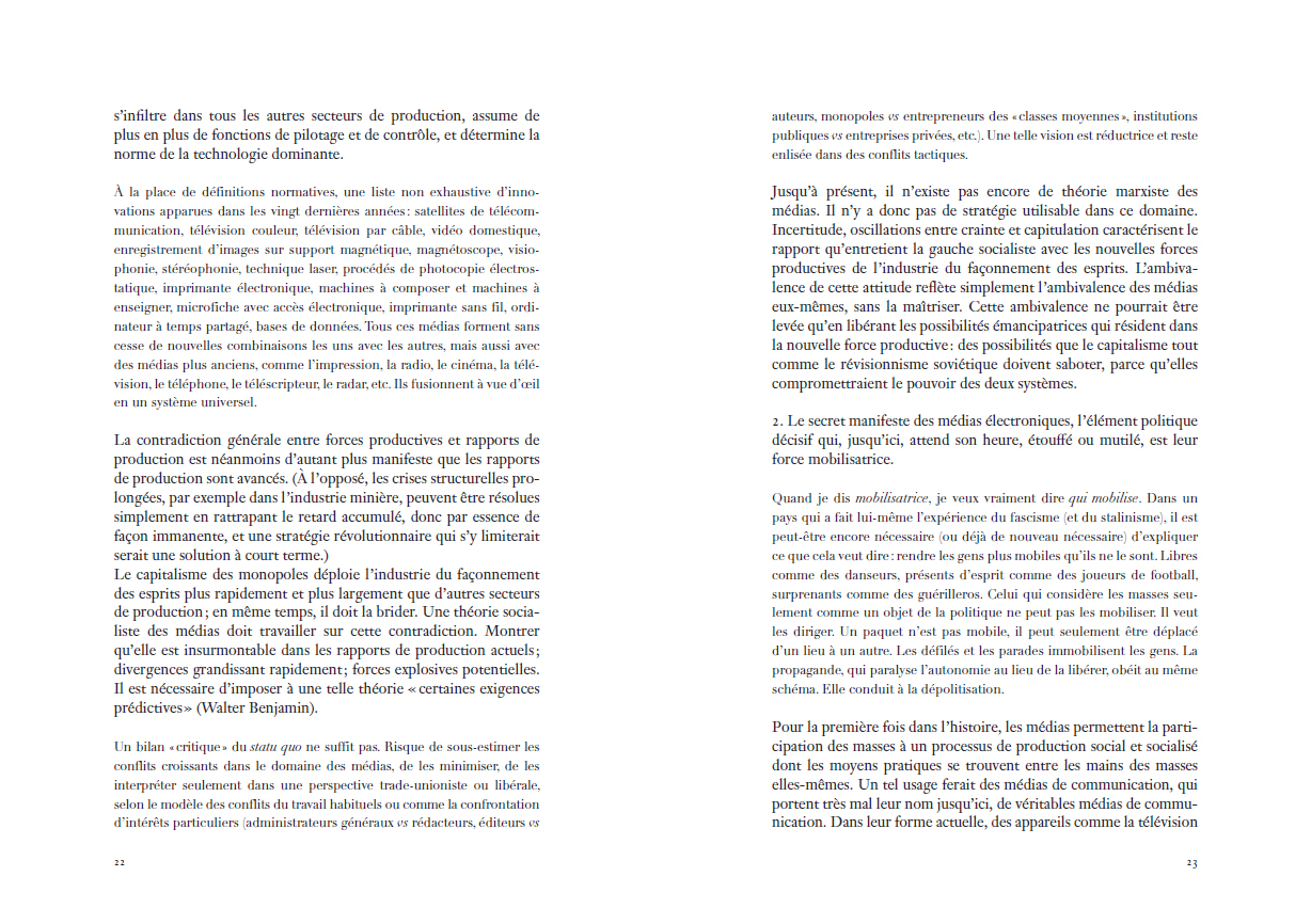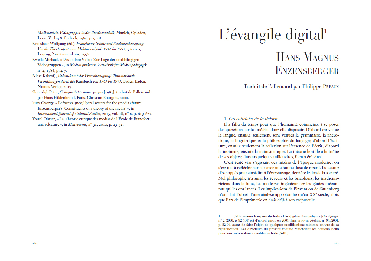 Benjamin, pour un contre-usage des médias de masse. Inédit en français, cet essai est accompagné dans ce volume de la réponse que lui apporta Baudrillard, d'un texte postérieur d'Enzensberger sur « L'évangile digital », ainsi que d'un dossier qui en explore les résonances théoriques toujours fécondes dans les champs intellectuels français, allemand, italien, britannique et américain. L'ensemble de ces textes, où se mêlent approches philosophiques, médiatiques et littéraires révèle l'absolue actualité d'un essai qui, dès 1970, dépassa le partage trop simple – et pourtant toujours vivace à l'ère numérique – entre médias-pessimistes et médias-optimistes, pour lui préférer un singulier jeu de construction théorique qui fait de la manipulation des médias, le socle même d'une véritable pensée critique.