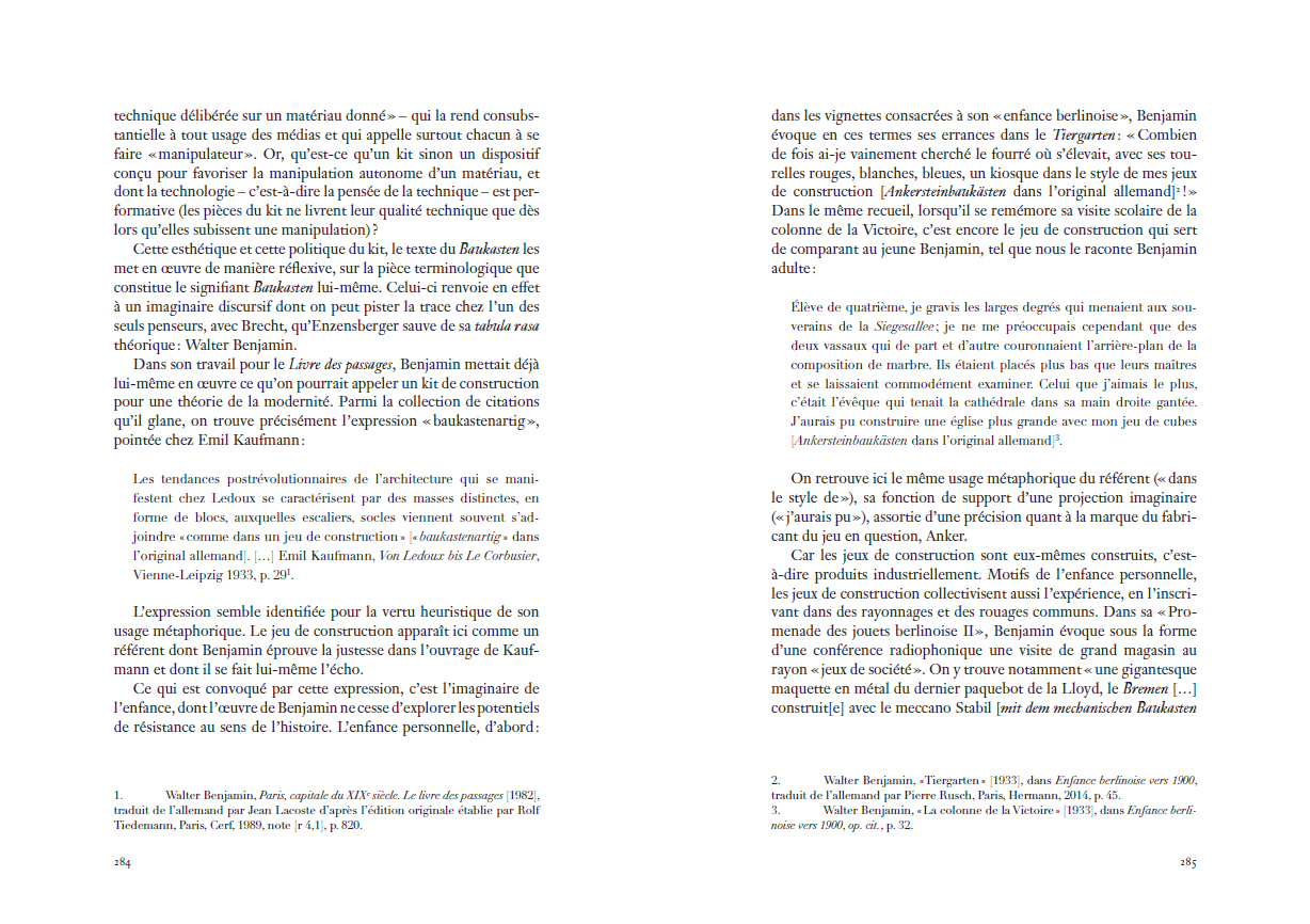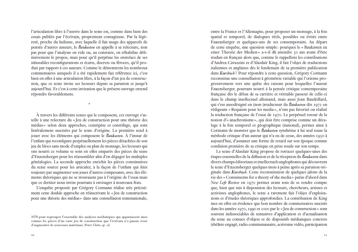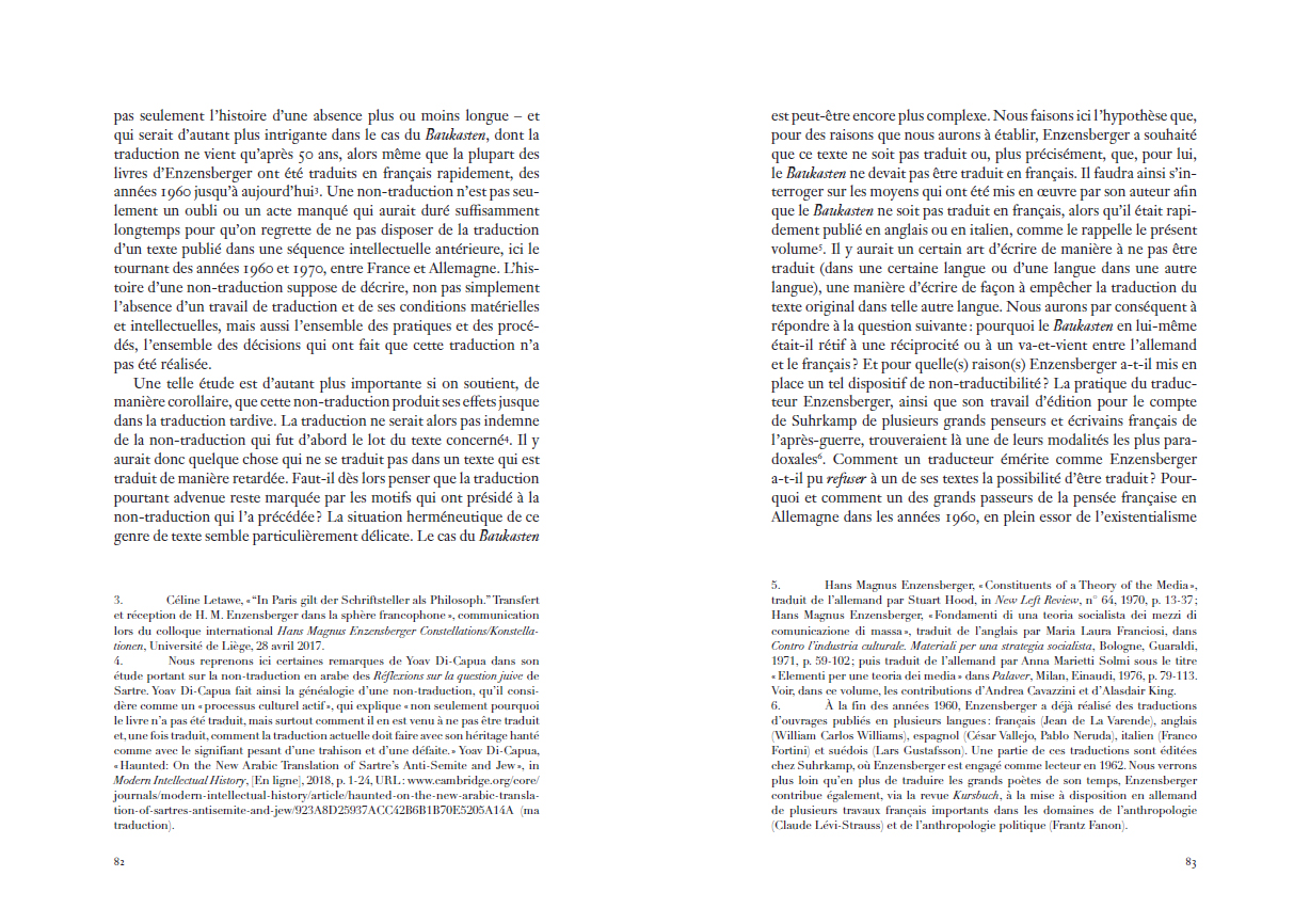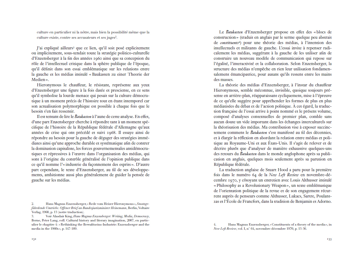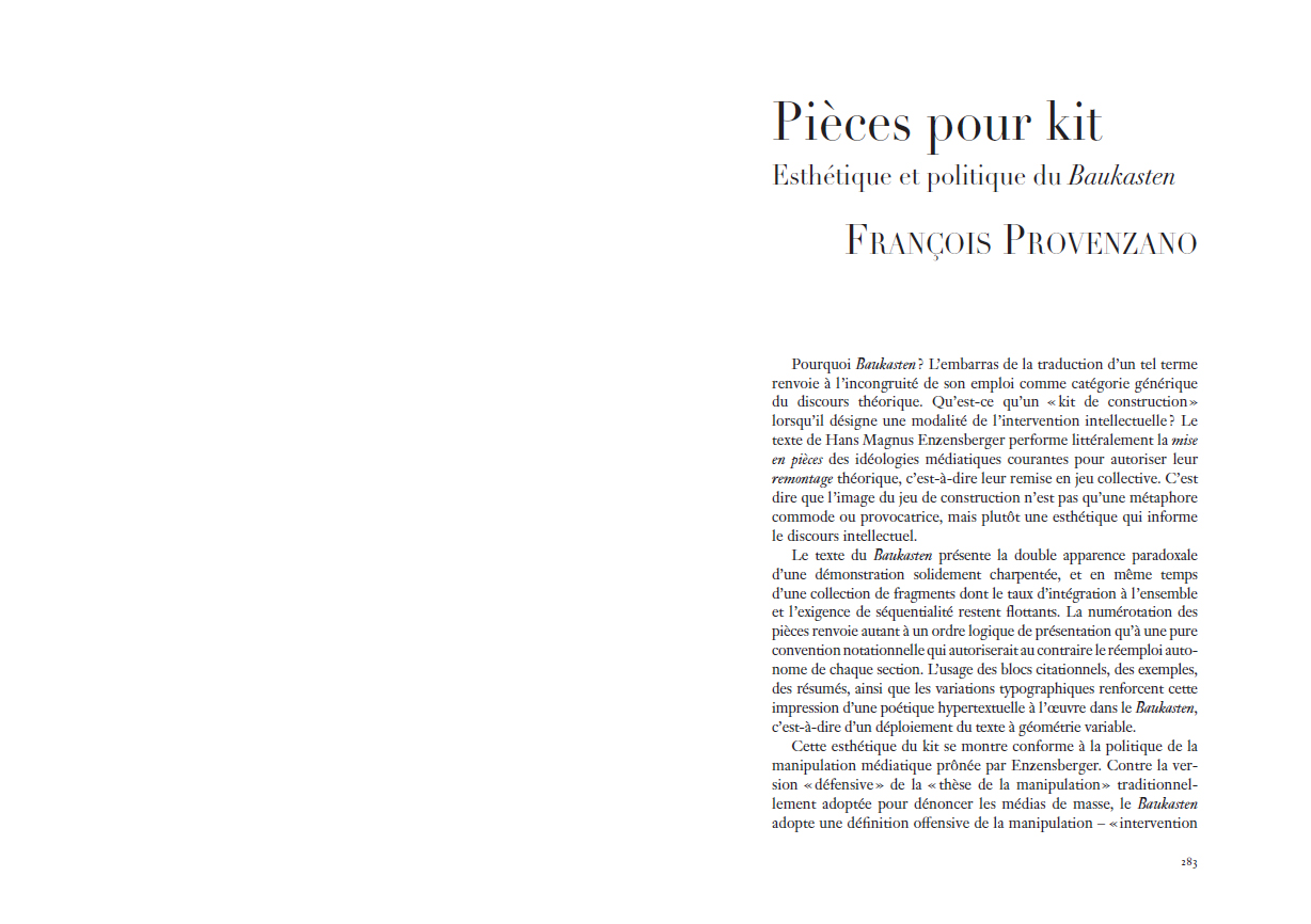 Baukasten – en allemand – brillait par son absence au répertoire francophone de l'un des plus vifs penseurs de la contemporanéité, pourtant régulièrement publié dans la multiplicité de son œuvre poétique, théâtrale et philosophique. Sous la direction de Jeremy Hamers et Céline Letawe, cet ouvrage collectif remet enfin au cœur de la théorie des médias la pensée d'Enzensberger et sa proposition originale : penser le potentiel émancipateur des médias de masse par leur puissance mobilisatrice des forces productives, organisées collectivement dans un devenir "manipulateur". »