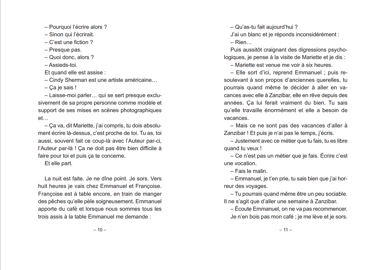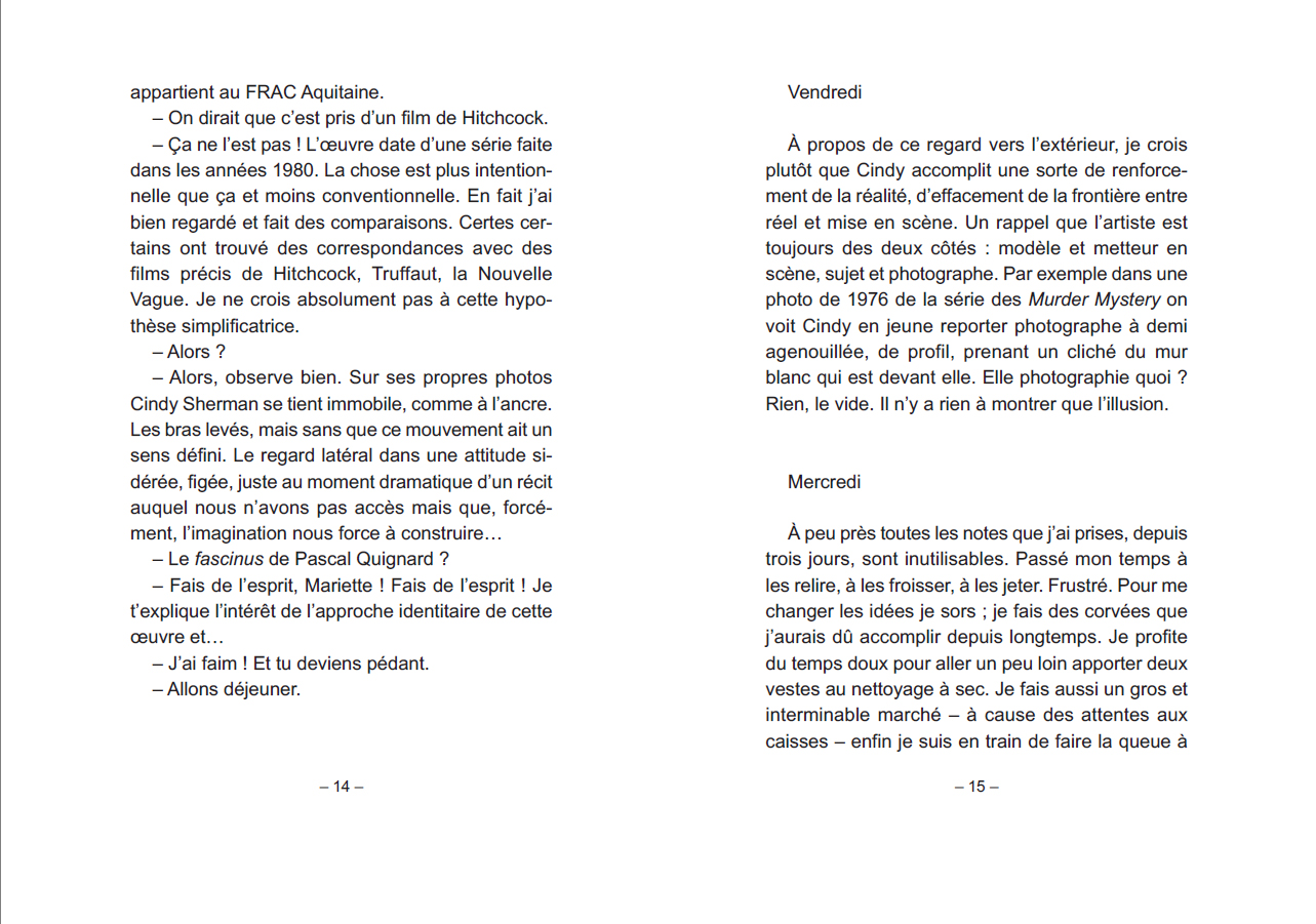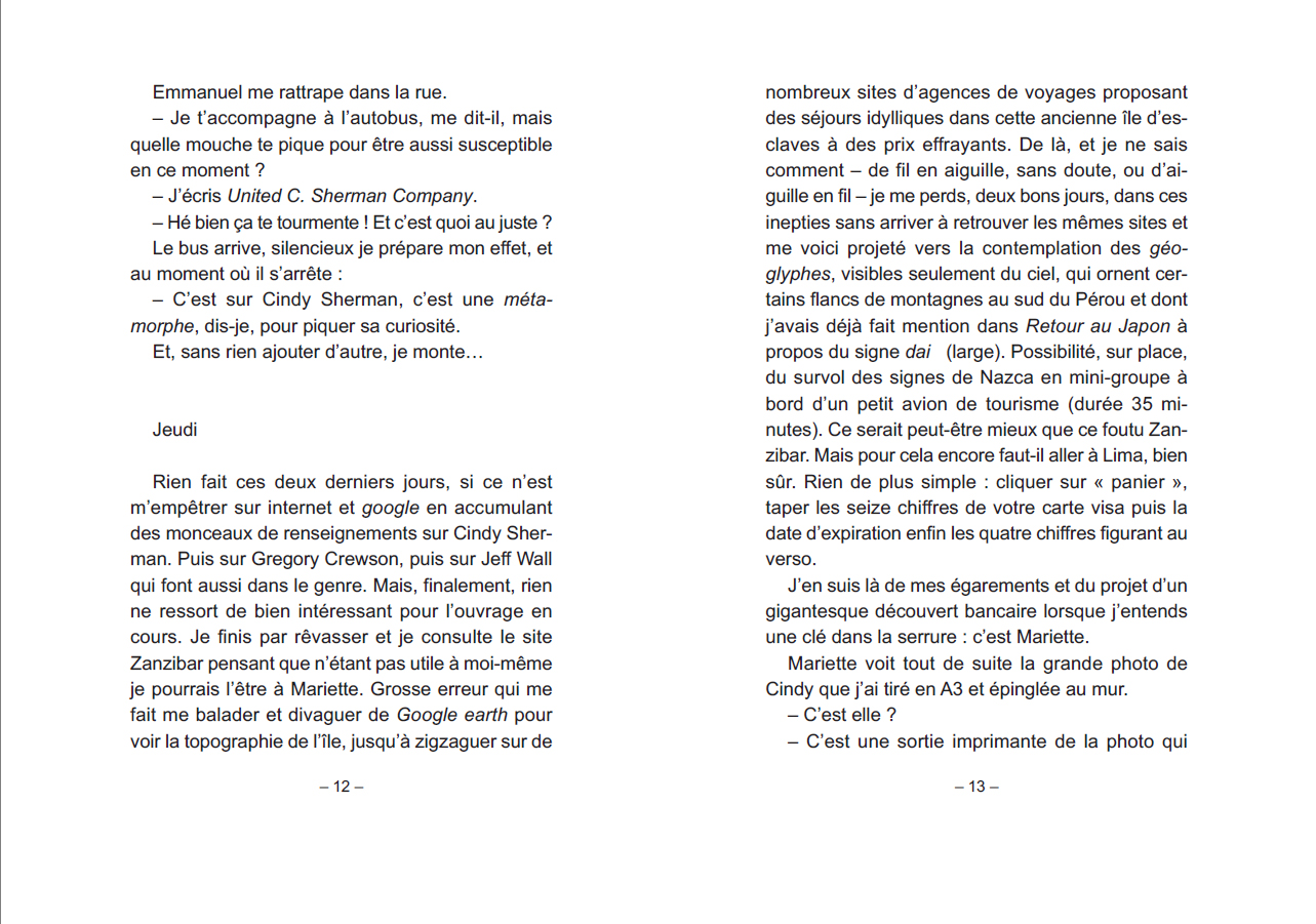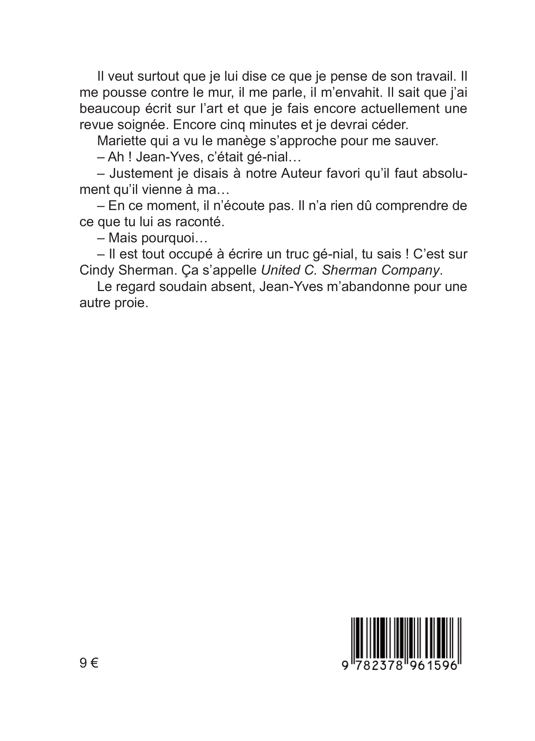 – Il est tout occupé à écrire un truc gé-nial, tu sais ! C'est sur Cindy Sherman. Ça s'appelle United C. Sherman Company.