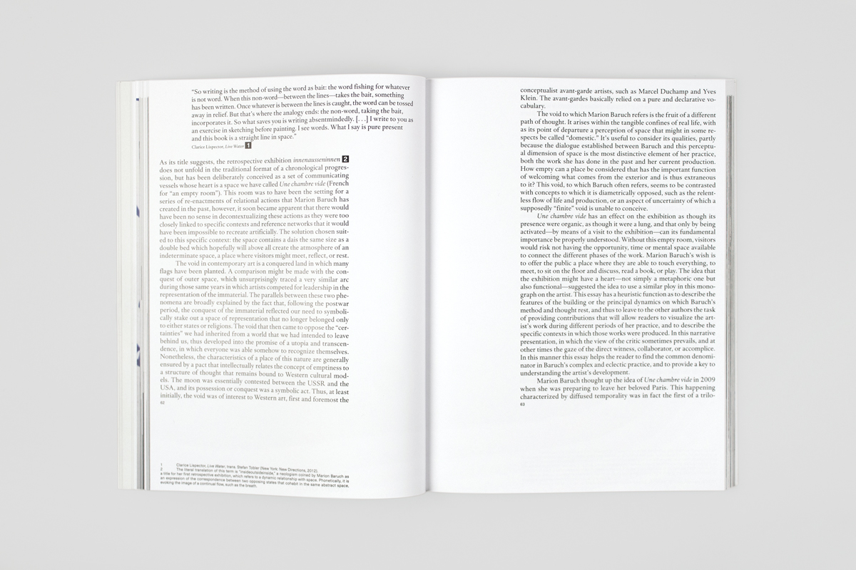 Publié à l'occasion de l'exposition rétrospective de Marion Baruch au Kunstmuseum Luzern, au Magasin des horizons, Grenoble, aux Abattoirs, Toulouse, au Muzeul de Arta, Timişoara; et au Museo MA*GA, Gallarate.