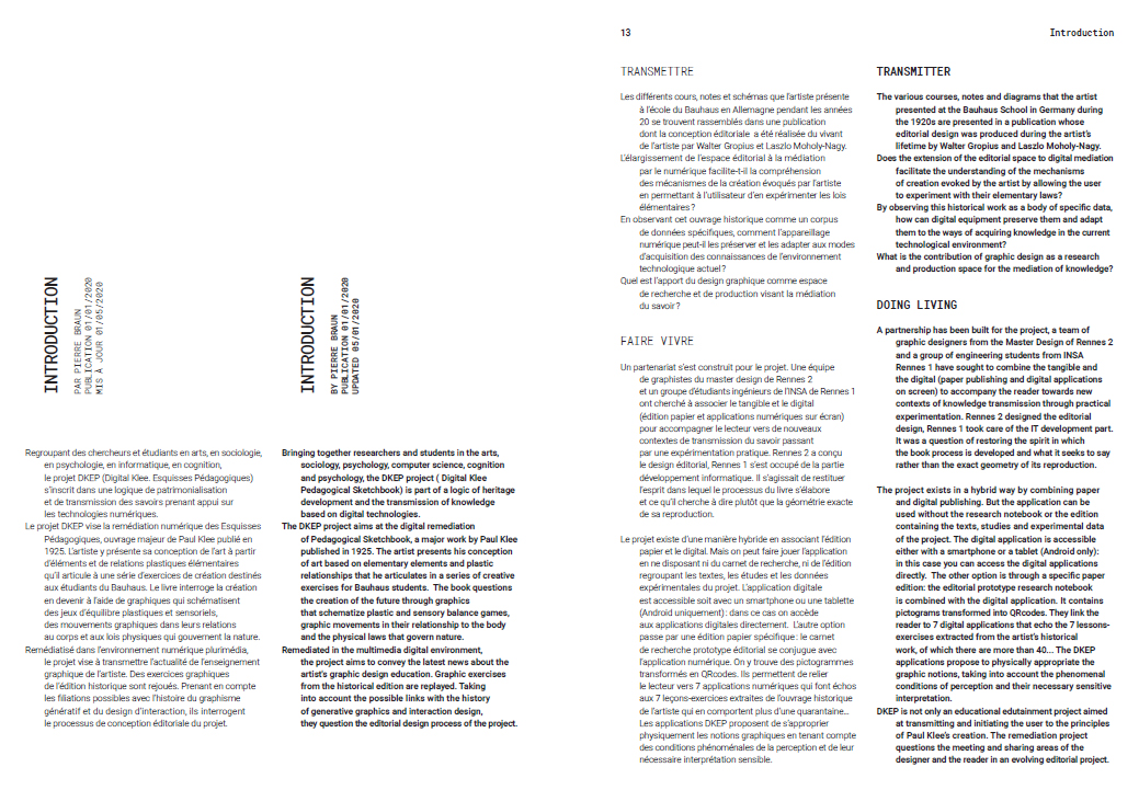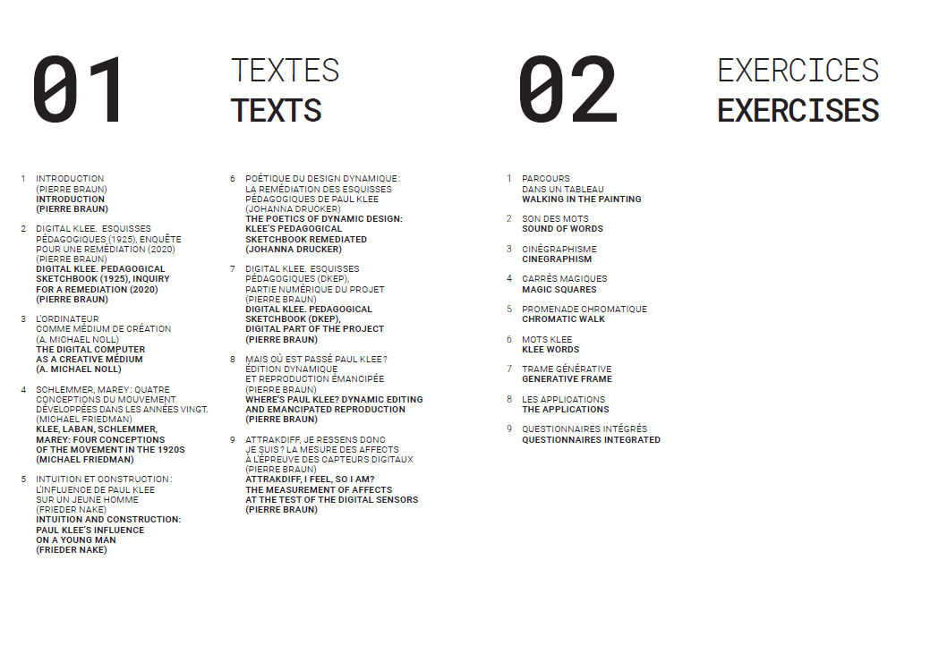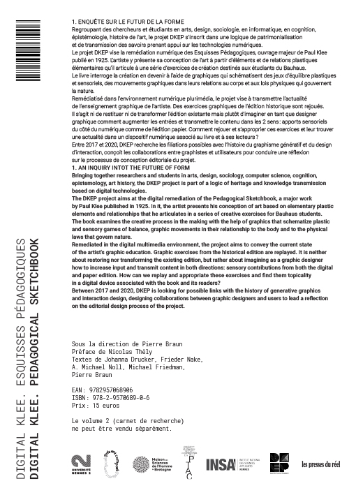 Entre 2017 et 2020, des chercheur.e.s en art, design, informatique, psychologie, sociologie, humanités numériques, mathématiques, interrogent la publication historique de l'artiste Paul Klee parue en 1925 au Bauhaus. Les travaux de recherche conduisent à inscrire le projet dans une logique de patrimonialisation et de transmission du savoir prenant appui sur les technologies numériques.