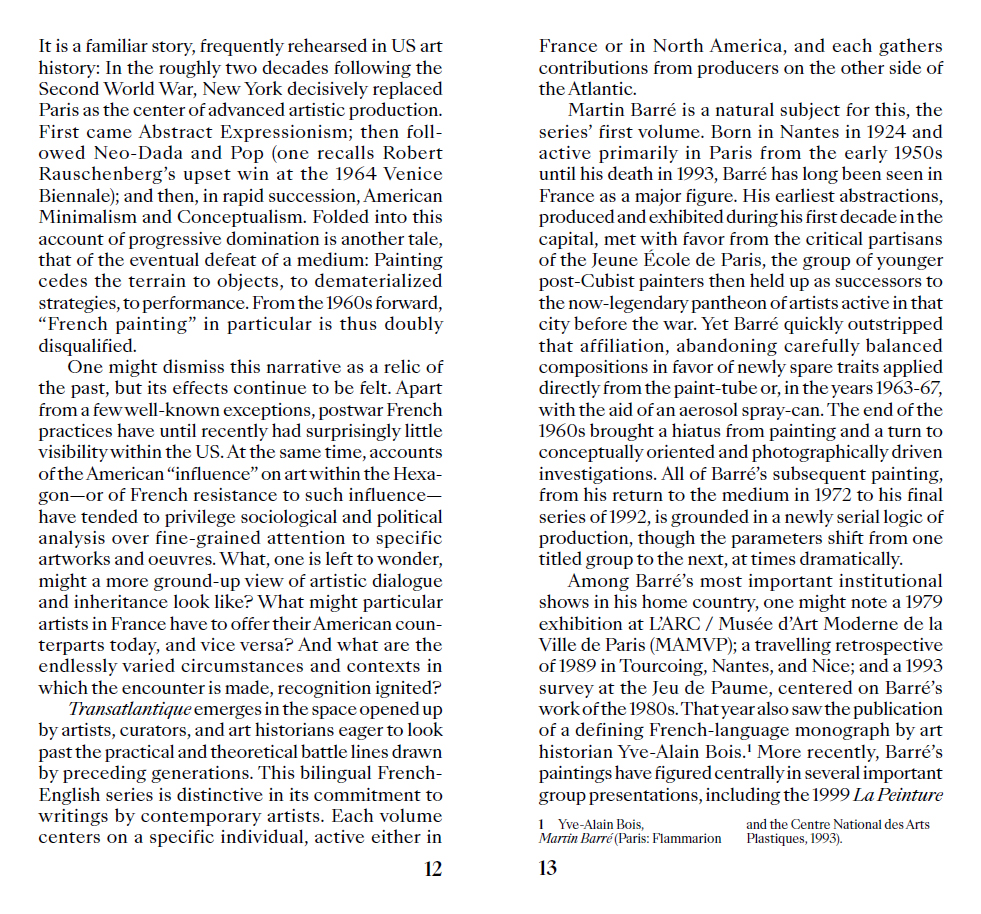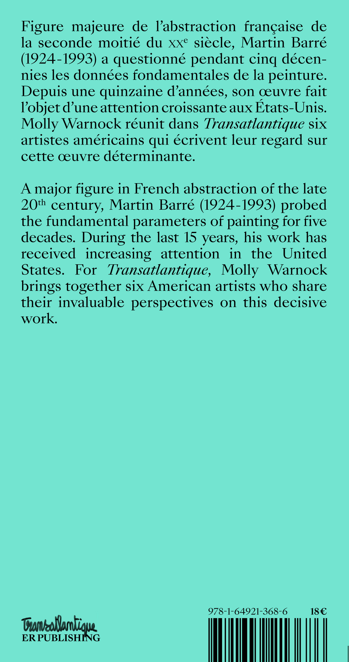 Figure majeure de l'abstraction française de la seconde moitié du XXe siècle, Martin Barré (1924-1993) a questionné pendant cinq décennies les données fondamentales de la peinture. Depuis une quinzaine d'années, son œuvre fait l'objet d'une attention croissante aux Etats-Unis. Molly Warnock réunit dans Transatlantique six artistes américains qui écrivent leur regard sur cette œuvre déterminante.