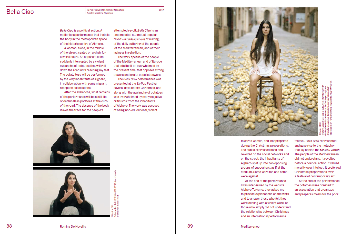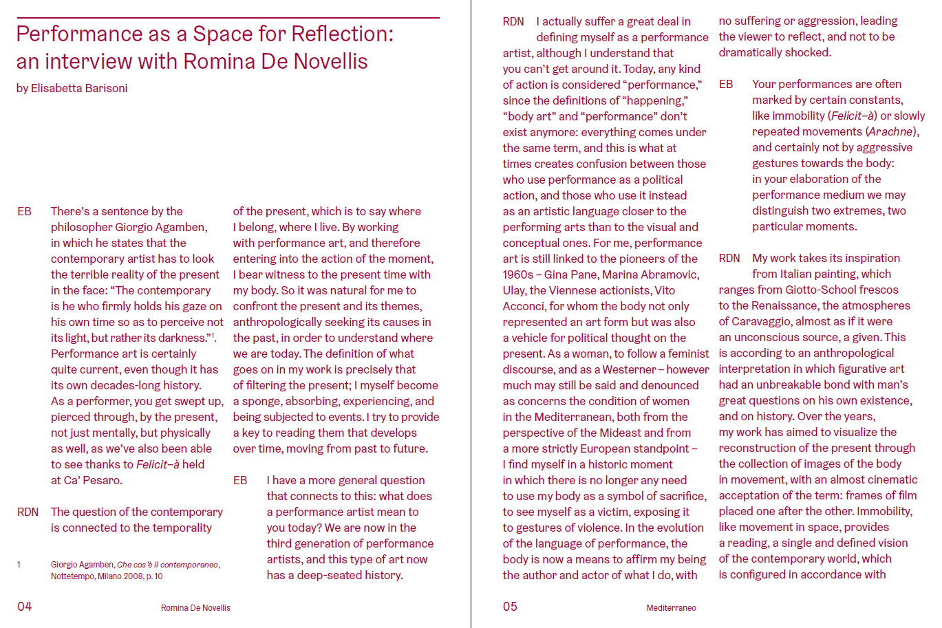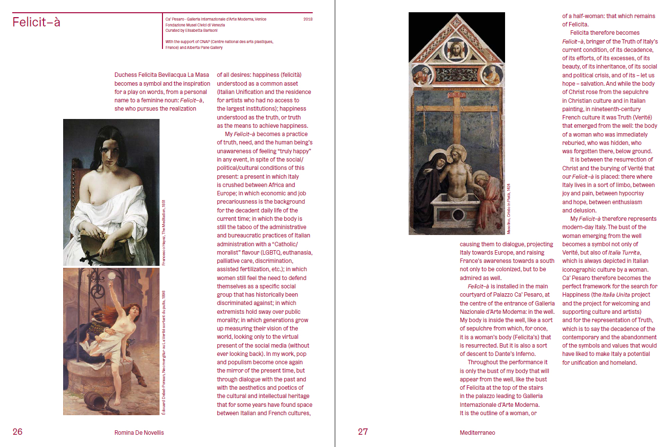 Première publication dédiée au travail de Romina De Novellis, Mediterraneo rassemble une sélection de ses œuvres réalisées au cours des dix dernières années ainsi qu'un entretien avec Elisabetta Barisoni (Ca' Pesaro - Galleria Internazionale d'Arte Moderna, Venise). Les performances sont décrites par l'artiste elle-même et nous invitent poétiquement à une réflexion profonde sur la condition humaine, sur ses contraintes et ses limites, mais aussi sur la crise politique et sociale qui touche actuellement le bassin méditerranéen.