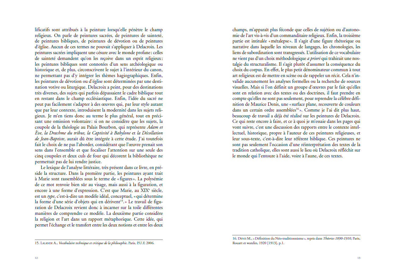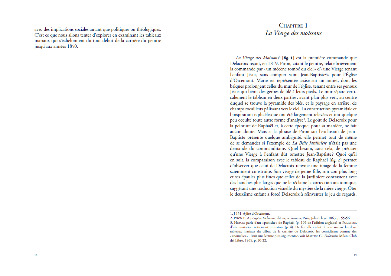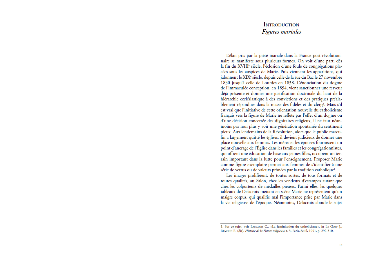 En guise de réponse, ce livre suit trois pistes. La première est celle des enjeux politiques et sociaux qui au XIXe siècle se cristallisent autour de la figure de Marie. La seconde piste explore la métaphore, très en vogue chez les romantiques, d'une religion de l'art. Les peintures en série prennent alors place dans un système d'échanges et les sujets répétés révèlent quelque chose de leurs destinataires. Mais, la religion étant propice à l'introspection, certaines œuvres recèlent aussi des fragments de leur auteur. C'est la troisième piste. L'irruption plus ou moins discrète d'allusions autobiographiques tressées au récit biblique est comparée à la figure de la métalepse en littérature. Figures, métaphores, métalepse, car à parler de religion – même en peinture – on en revient toujours à se frotter au texte.