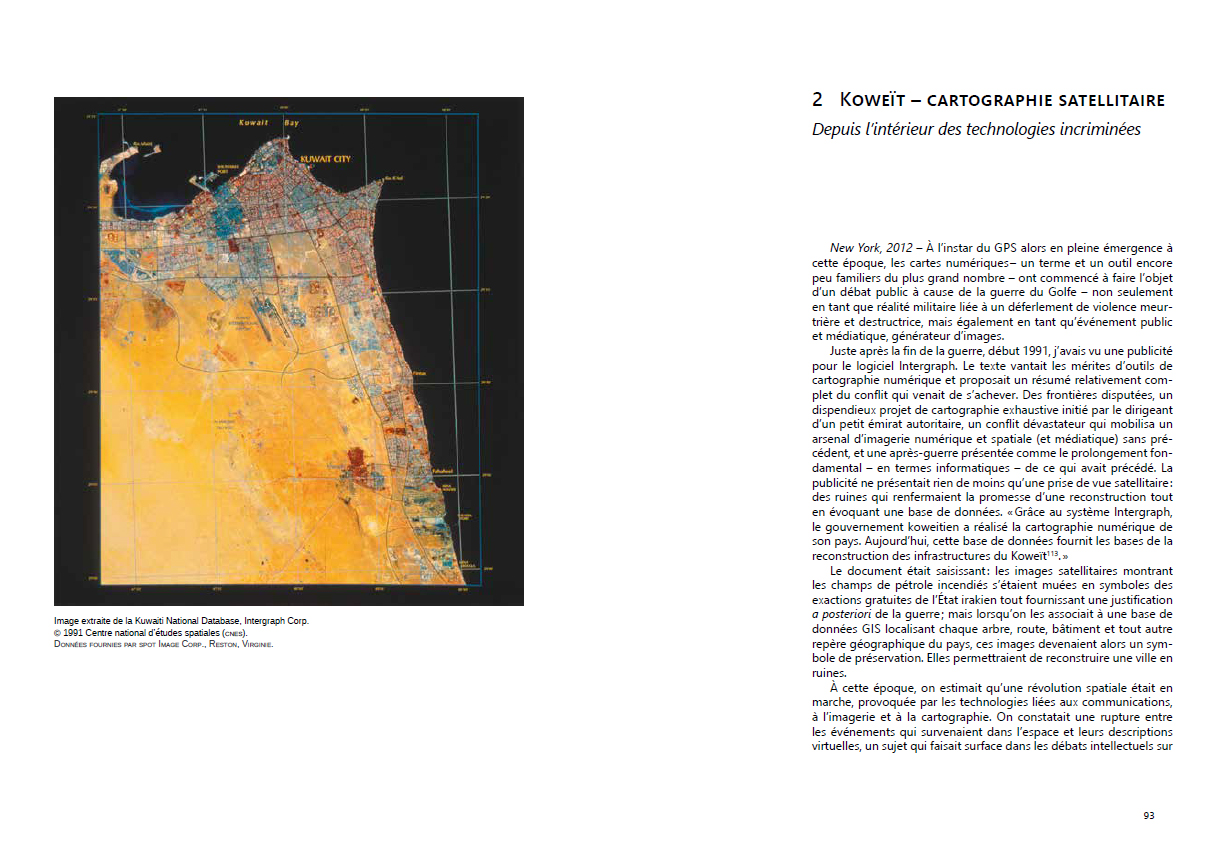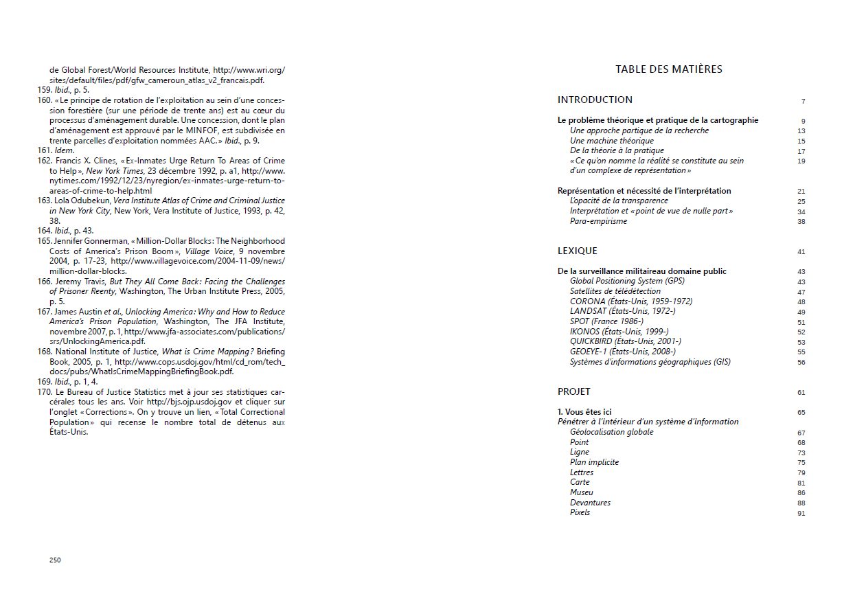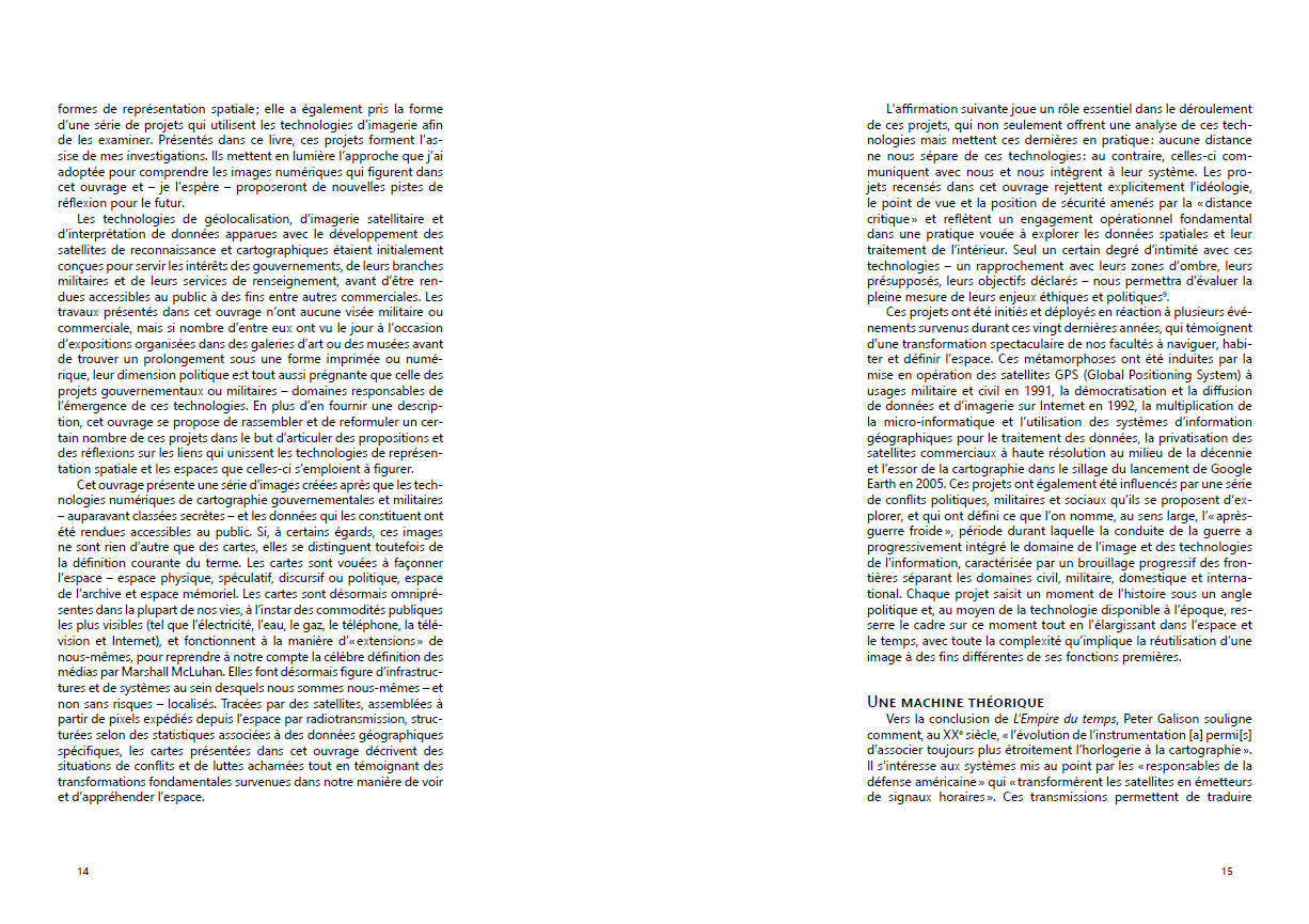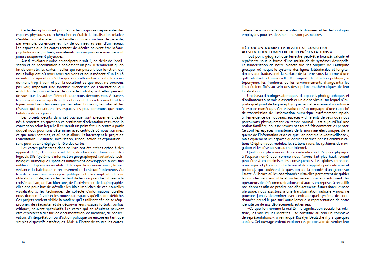 Le début du XXIe siècle a été le théâtre d'une mutation révolutionnaire de notre capacité à parcourir, habiter et définir l'espace. Les innombrables flux de données qui s'insinuent dans nos vies renferment toujours plus de relevés GPS (Global Positioning System) et d'images satellites dont la qualité était autrefois uniquement accessible à quelques agences militaires et de renseignement, tandis que les puissants programmes liés au SIG (système d'information géographique) sont aujourd'hui des outils répandus. Ces nouvelles technologies soulèvent des questions fondamentales portant sur les limites de l'espace physique et de sa représentation et de l'espace virtuel et de sa matérialisation. Dans