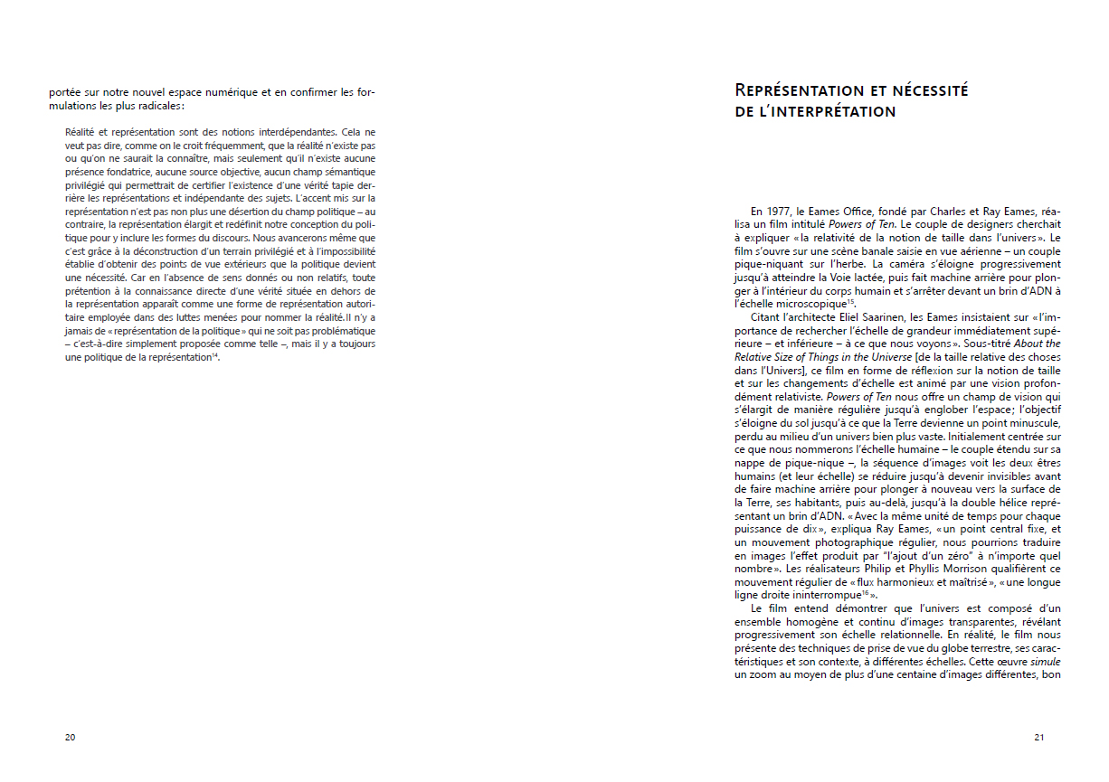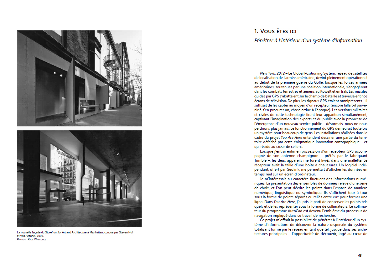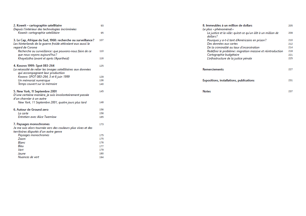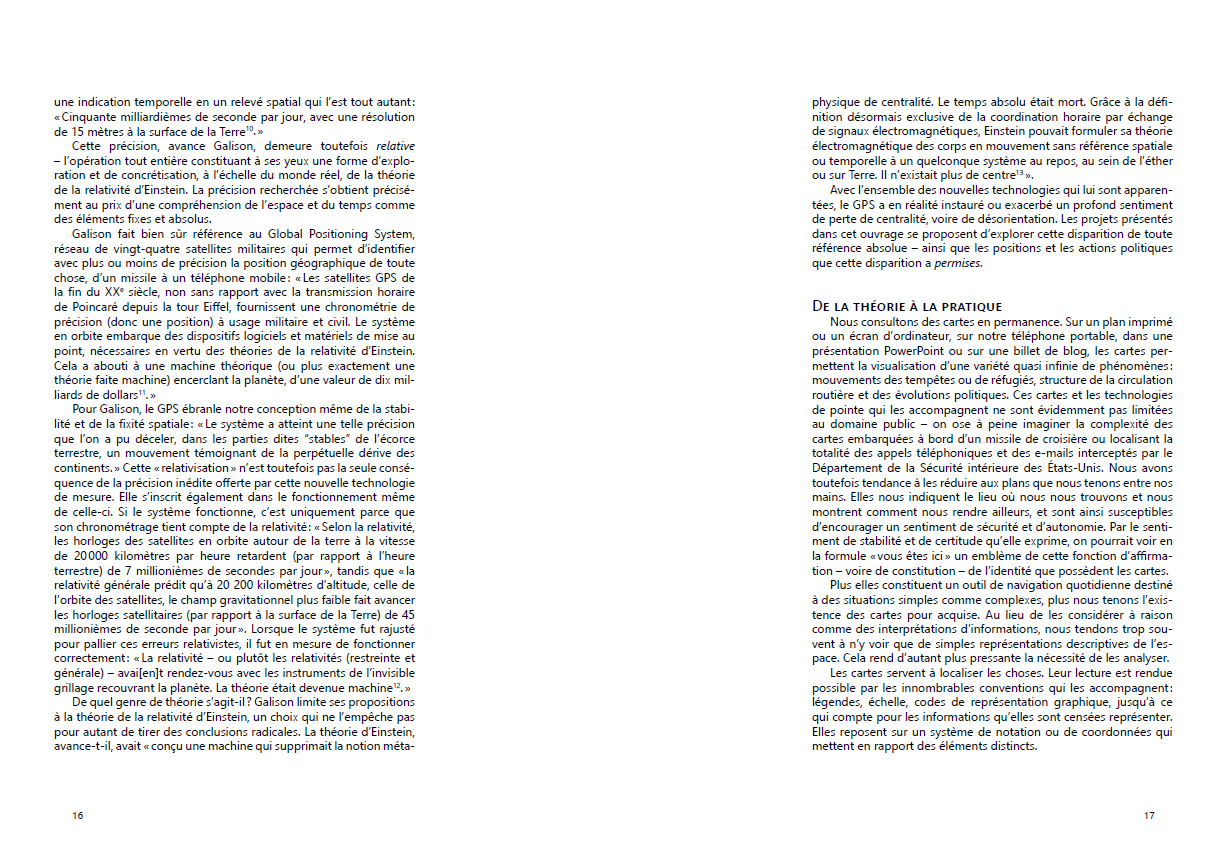 Le début du XXIe siècle a été le théâtre d'une mutation révolutionnaire de notre capacité à parcourir, habiter et définir l'espace. Les innombrables flux de données qui s'insinuent dans nos vies renferment toujours plus de relevés GPS (Global Positioning System) et d'images satellites dont la qualité était autrefois uniquement accessible à quelques agences militaires et de renseignement, tandis que les puissants programmes liés au SIG (système d'information géographique) sont aujourd'hui des outils répandus. Ces nouvelles technologies soulèvent des questions fondamentales portant sur les limites de l'espace physique et de sa représentation et de l'espace virtuel et de sa matérialisation. Dans