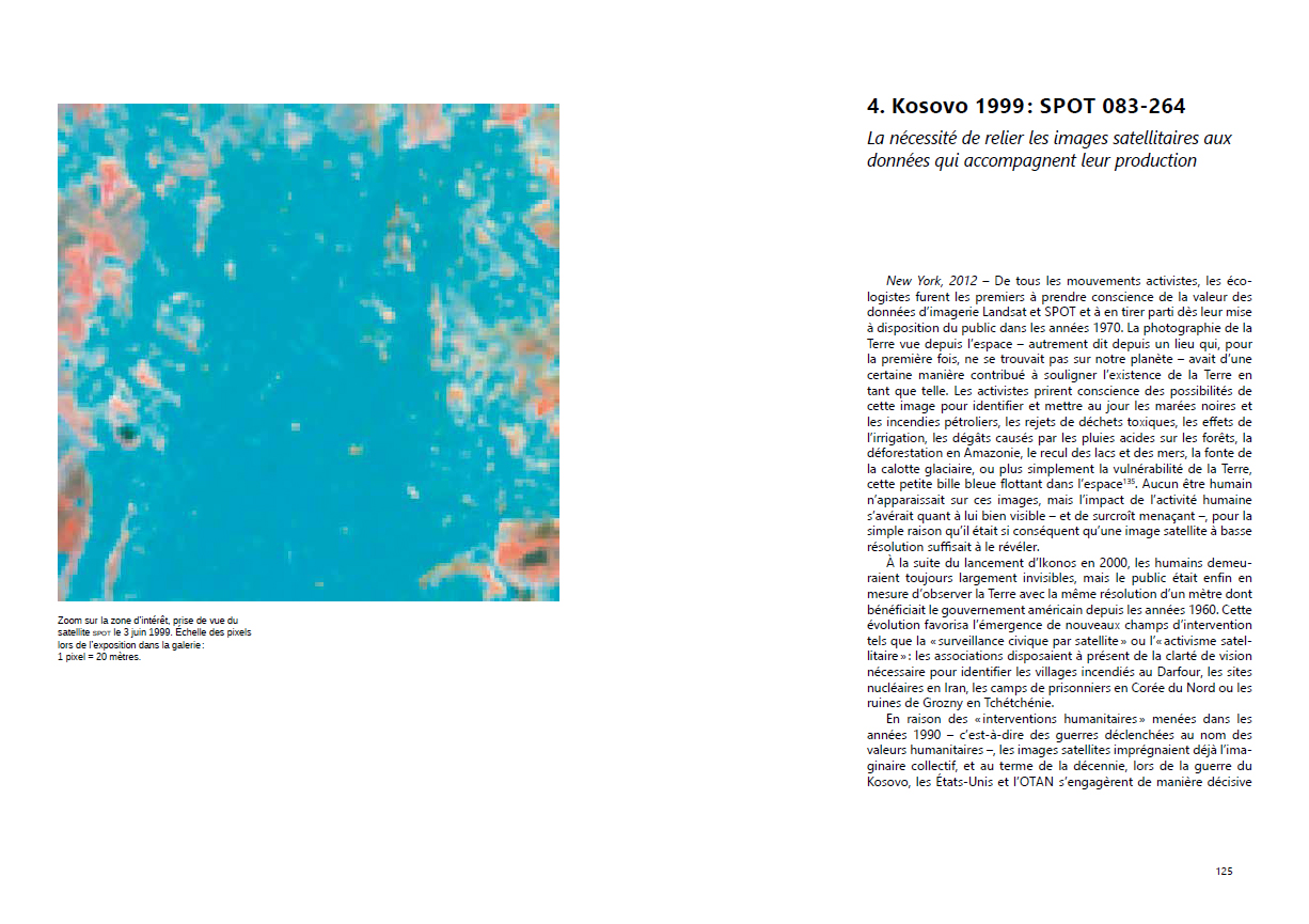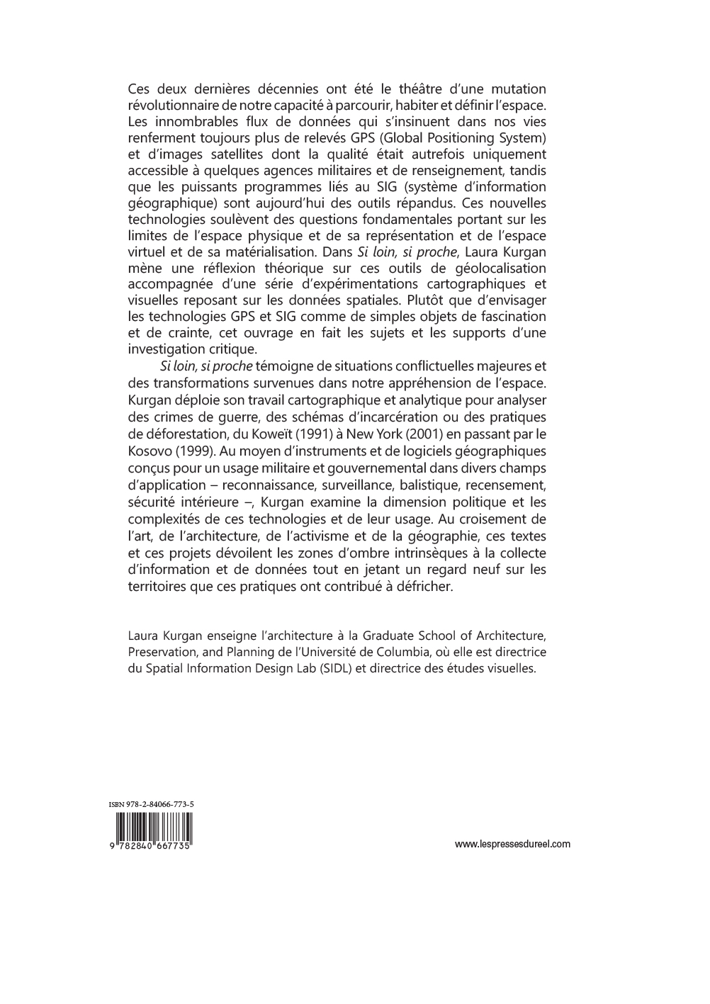 Si loin, si proche témoigne de situations conflictuelles majeures et des transformations survenues dans notre appréhension de l'espace. Kurgan déploie son travail cartographique et analytique pour analyser des crimes de guerre, des schémas d'incarcération ou des pratiques de déforestation, du Koweït (1991) à New York (2001) en passant par le Kosovo (1999). Au moyen d'instruments et de logiciels géographiques conçus pour un usage militaire et gouvernemental dans divers champs d'application – reconnaissance, surveillance, balistique, recensement, sécurité intérieure –, Kurgan examine la dimension politique et les complexités de ces technologies et de leur usage. Au croisement de l'art, de l'architecture, de l'activisme et de la géographie, ces textes et ces projets dévoilent les zones d'ombre intrinsèques à la collecte d'information et de données tout en jetant un regard neuf sur les territoires que ces pratiques ont contribué à défricher.