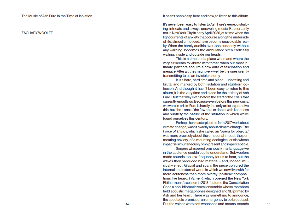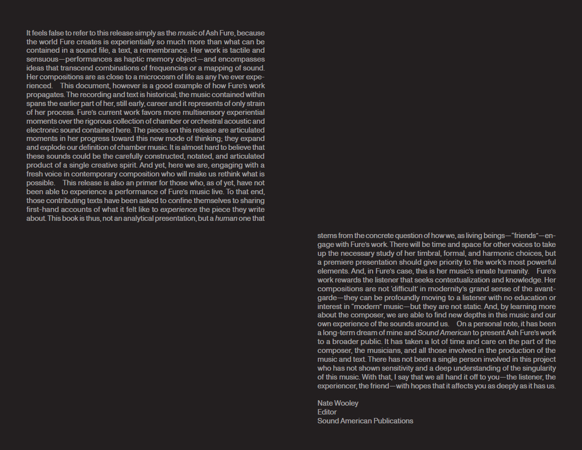 Livre d'artiste rassemblant le premier enregistrement publié de la musique de la compositrice et artiste intermedia Ash Fure (code de téléchargement inclus), dont les pièces sont interprétées par l'International Contemporary Ensemble, l'Interlochen Arts Academy Orchestra, Rebekah Heller, Brandon Lopez et Nate Wooley, ainsi qu'une documentation sur ses performances immersives, un entretien, ses notes et des contributions de Zachary Woolfe (New York Times), Steve Smith (New Yorker), etc.