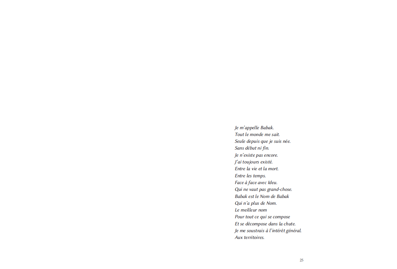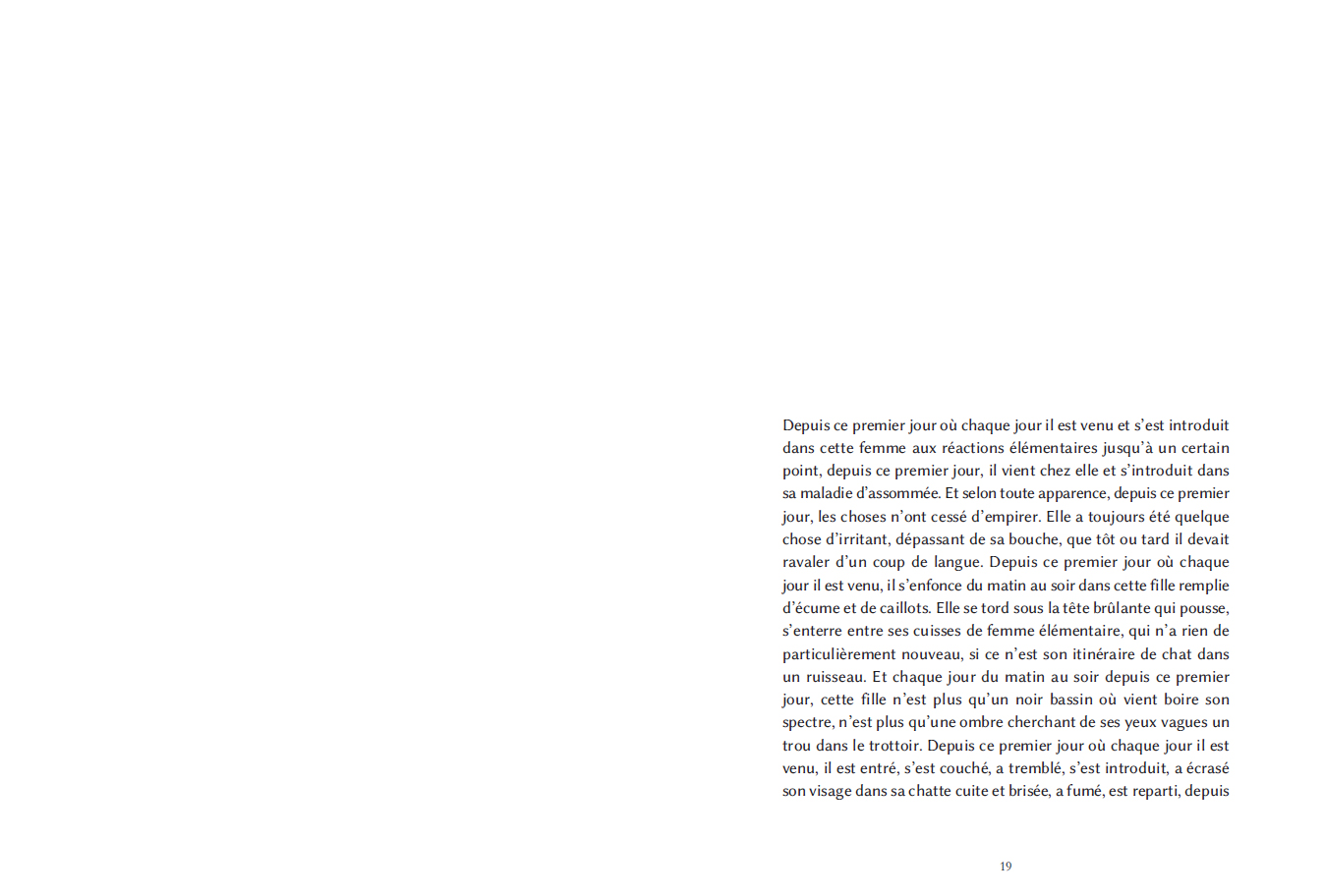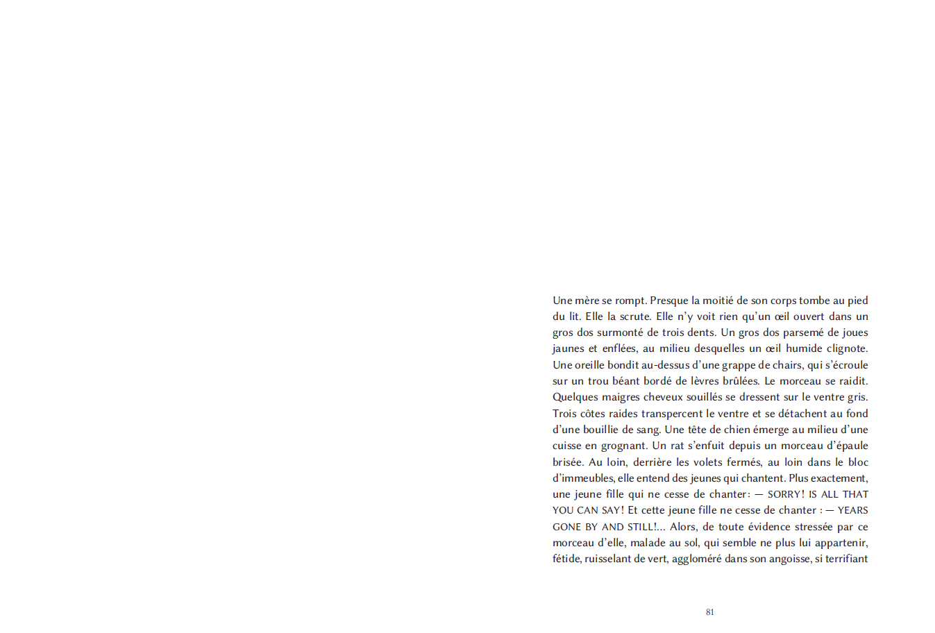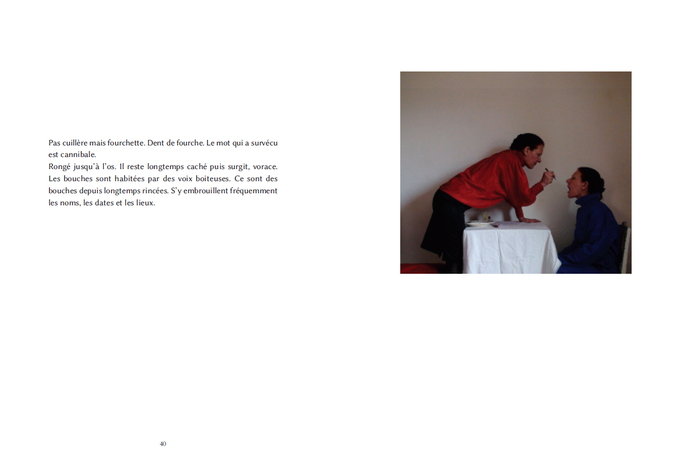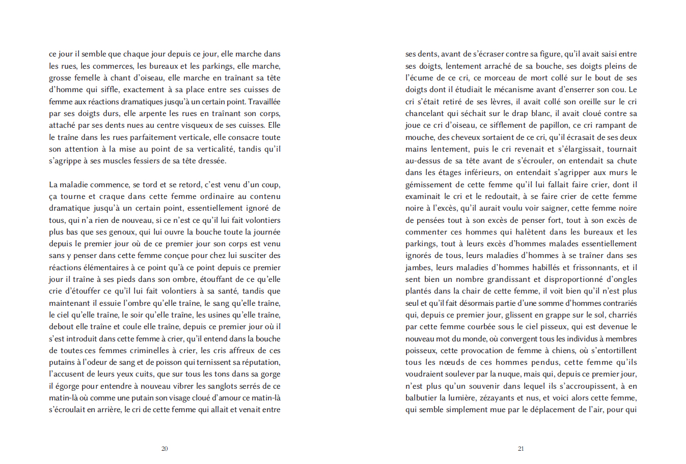 « C'est une ambiance toute particulière qui nimbe cette œuvre collective composée de la rencontre d'une artiste protéiforme, Fabienne Létang, et trois autrices – poétesses ? nous nous en tiendrons au texte de présentation –, pas n'importe lesquelles, Liliane Giraudon, Amandine André et A.C Hello. Un livre non pas à quatre mains, mais à quatre corps et quatre voix.
