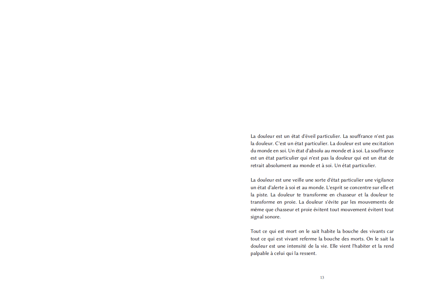 « …Désormais les entraves intimes, sociales et politiques resserrent tragiquement leurs liens. La peur se fait de plus en plus prégnante. Dans un futur proche, ne nous restera bientôt comme dernier geste que celui de prendre notre tête entre nos mains ou lever les yeux au ciel… ».