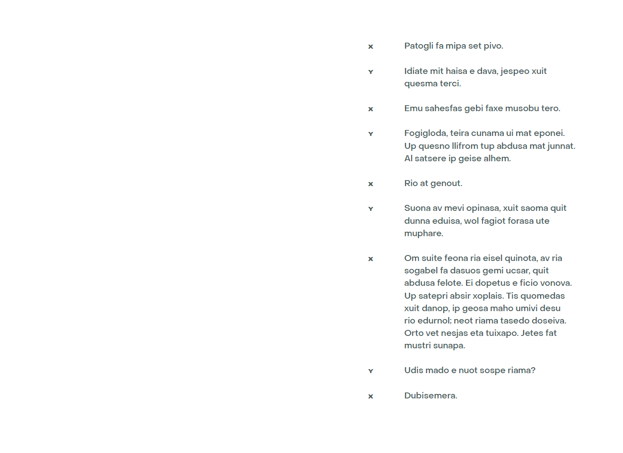 H, un dialogue entre X et Y dans une langue non identifiée, quasiment réduite à sa dimension sonore puisqu'elle ne fait pas sens.