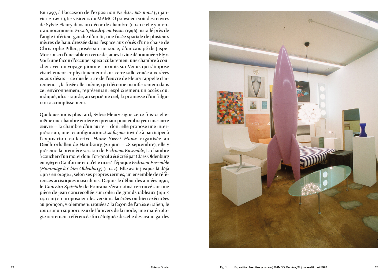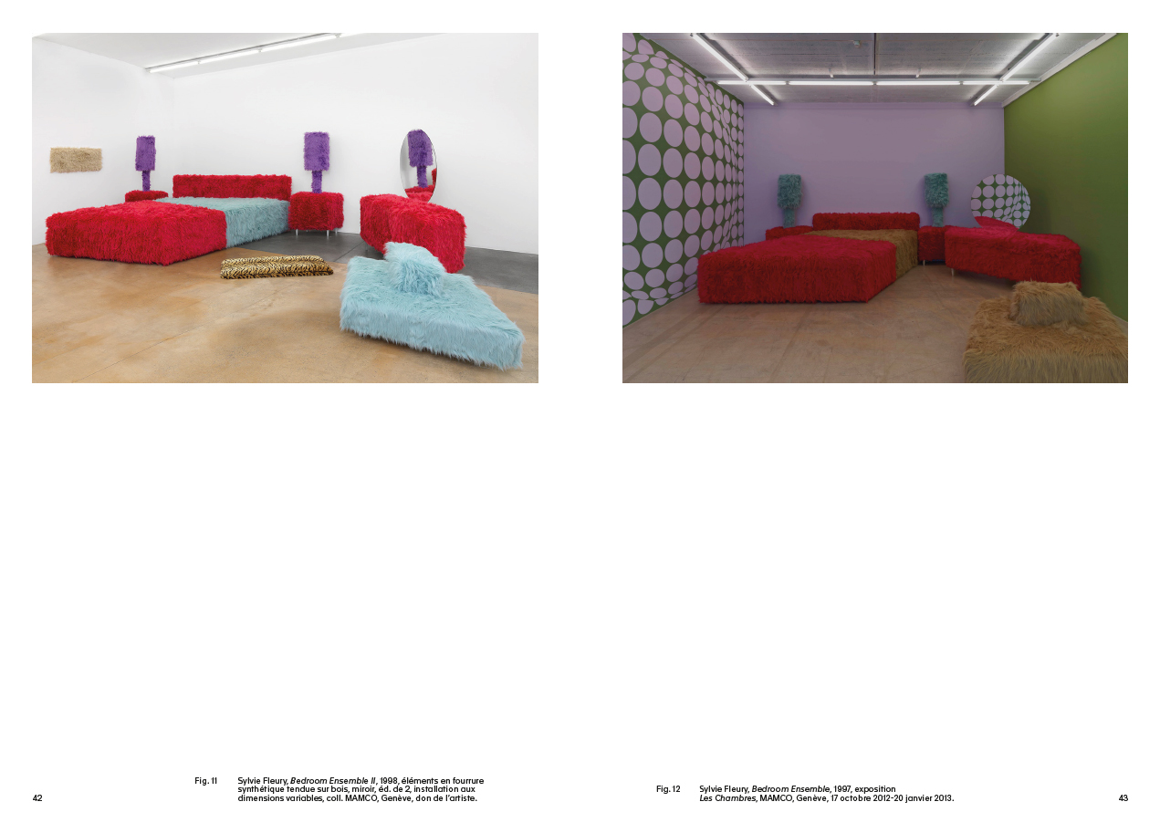L'installation Bedroom Ensemble II de Sylvie Fleury est composée de mobilier domestique où tous les meubles ont été recouverts de fausse fourrure, un matériau, récurrent dans l'œuvre de l'artiste. Mais elle rend surtout hommage à un artiste qui a, lui aussi, élevé le prosaïsme d'objets dérisoires au rang de la sculpture monumentale : en 1963, Claes Oldenburg reconstituait, sous ce même titre, des chambres à coucher dont il déformait les perspectives pour en accentuer l'effet de profondeur et les déréaliser. Cet ouvrage est la première étude globale de cette installation mais tente aussi de la situer par rapport aux autres œuvres que possède le MAMCO.