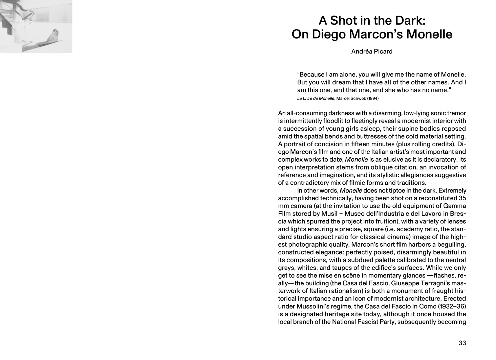 Une présentation de l'ensemble de la pratique de Diego Marcon à partir de l'analyse détaillée de trois œuvres récentes parmi ses plus complexes et emblématiques : Monelle (2017), Ludwig (2018) et The Parents' Room (2020).