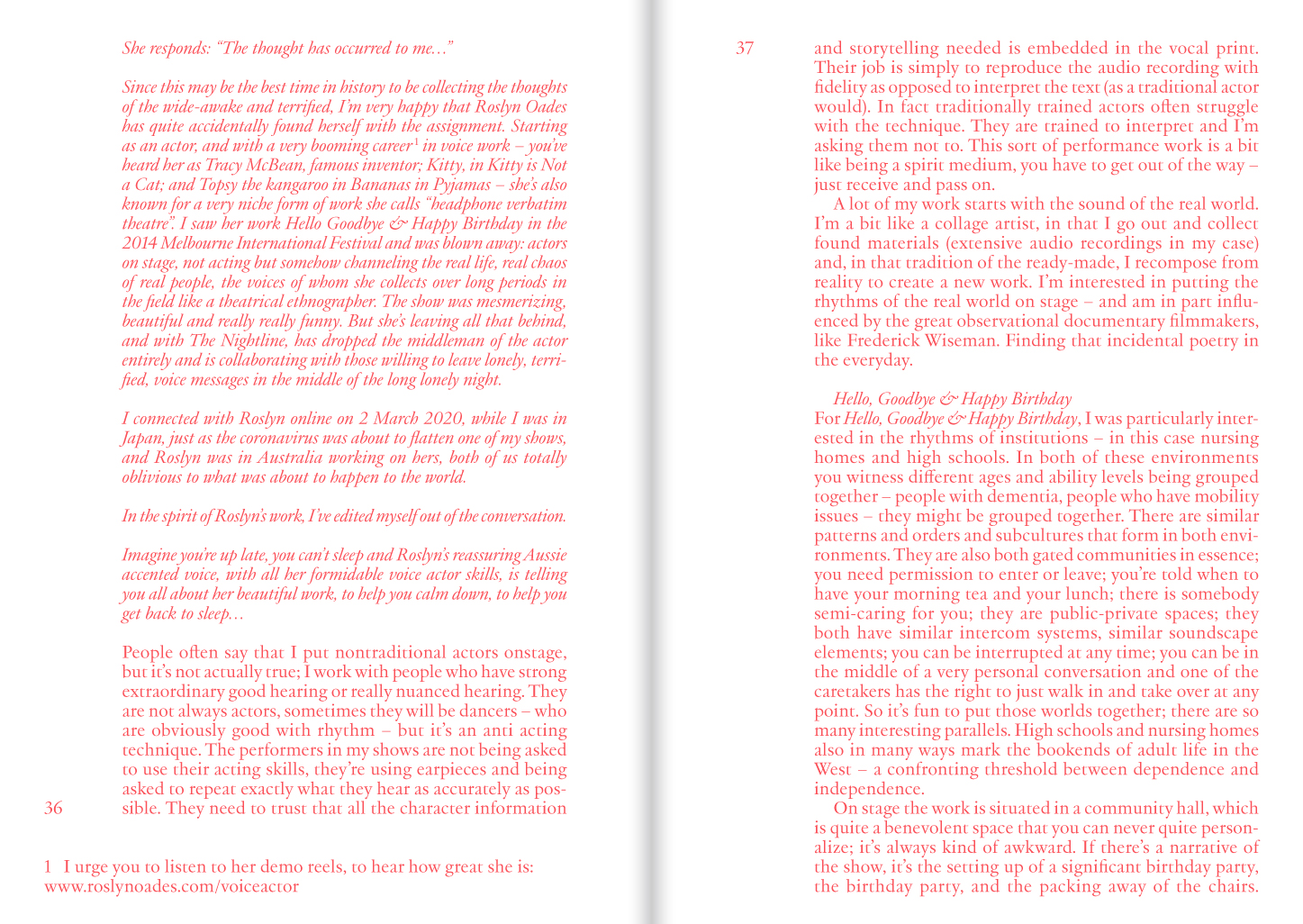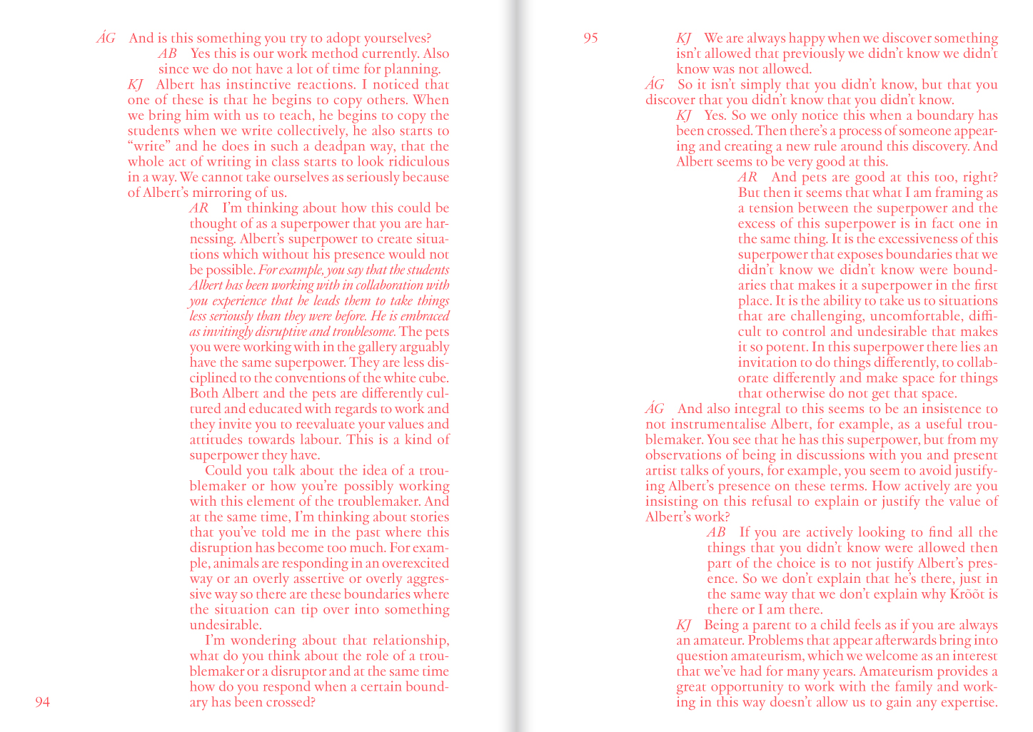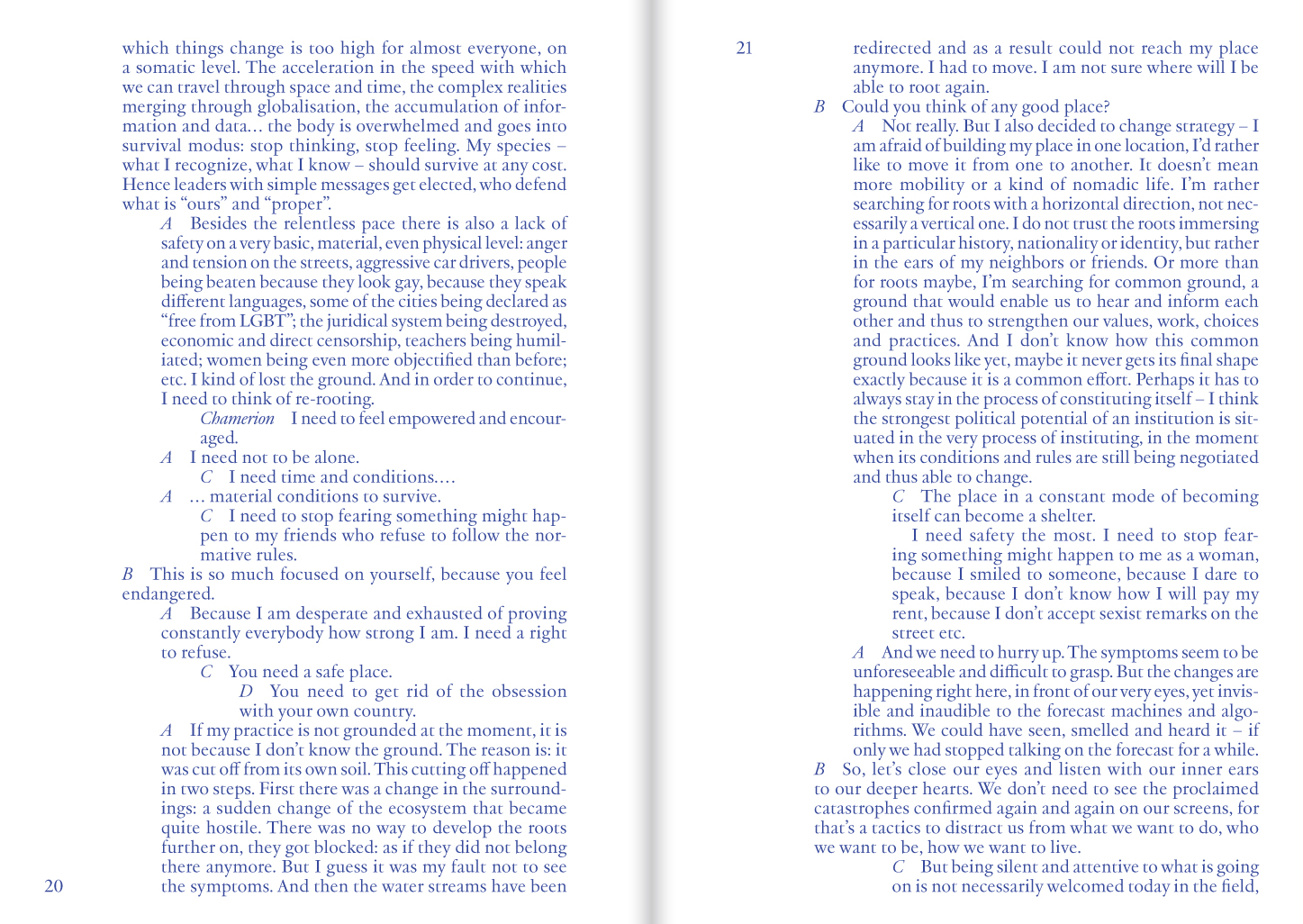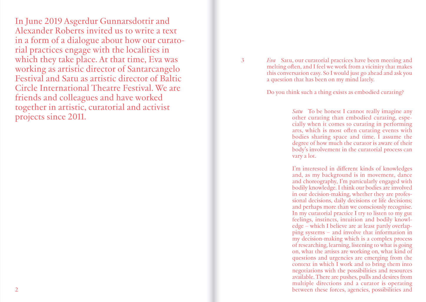« We, curators Alexander Roberts and Ásgerður G. Gunnarsdóttir, have been working on a curatorial research under the title 'Into the City, Onto the Stage' since 2014. The central point of enquiry has been to ask how we as curators – based in Reykjavík, Iceland – working as Artistic Directors of Reykjavík Dance Festival – can create a platform, with the performing arts at its centre, where the basic assumptions about who the performing arts are for can be fundamentally challenged and transformed. Who in our city gets to watch it, make it and have opinions on it How to cultivate and shape an institution that gathers publics through engagements with the performing arts on terms that are ardently anti-racist, pro-queer, interspecies, anti-ableist, feminist, pro-worker and decolonising? How to foster a platform that is constituted by a porous and intersectional community of listeners and learners committed to amplifying the voices, bodies, experiences and urgencies among them that are otherwise often under represented, lesser seen and lesser heard? [...] We conceived of this book as a space to learn from others that have also been busy devising artistic and curatorial strategies relevant to these questions. »