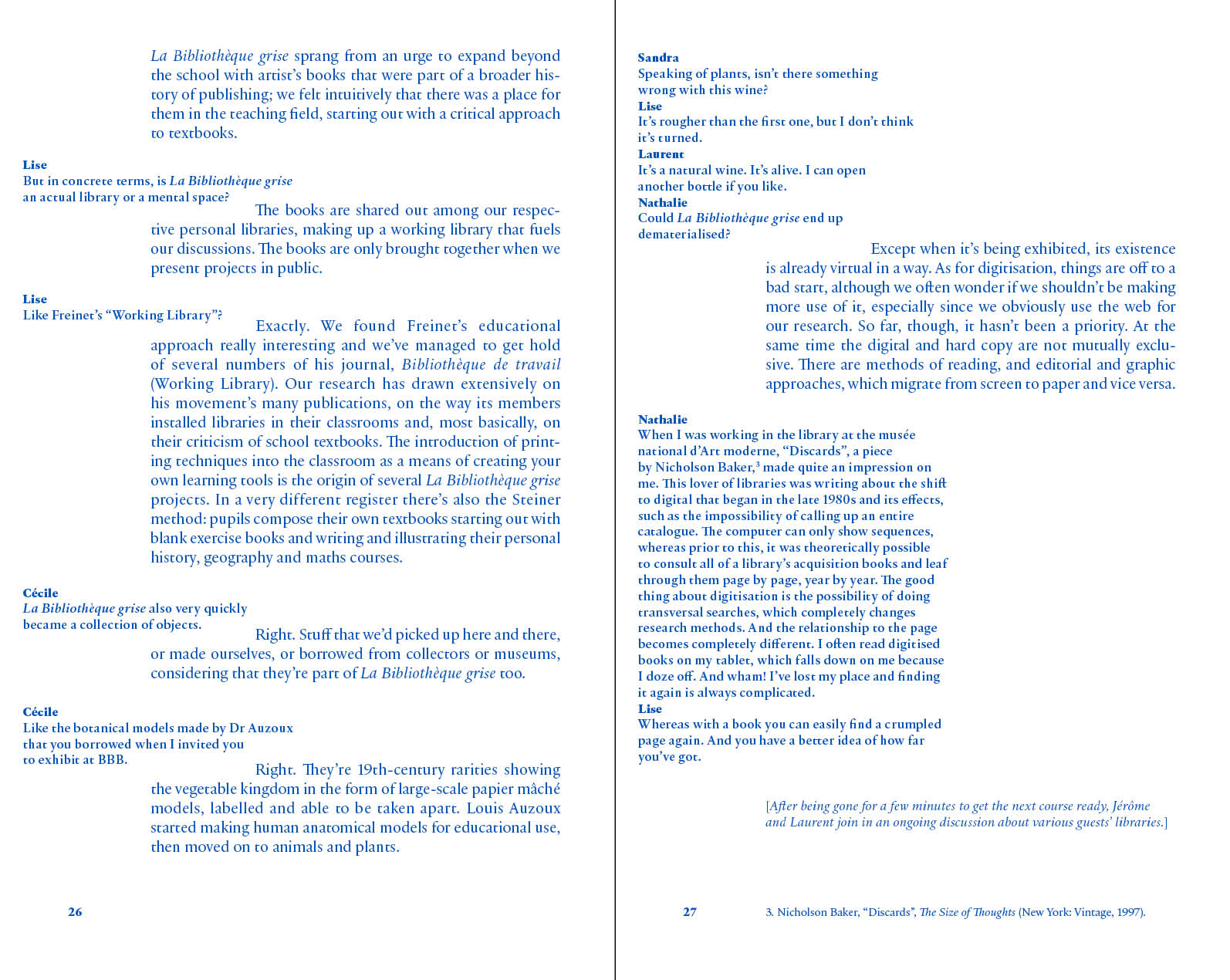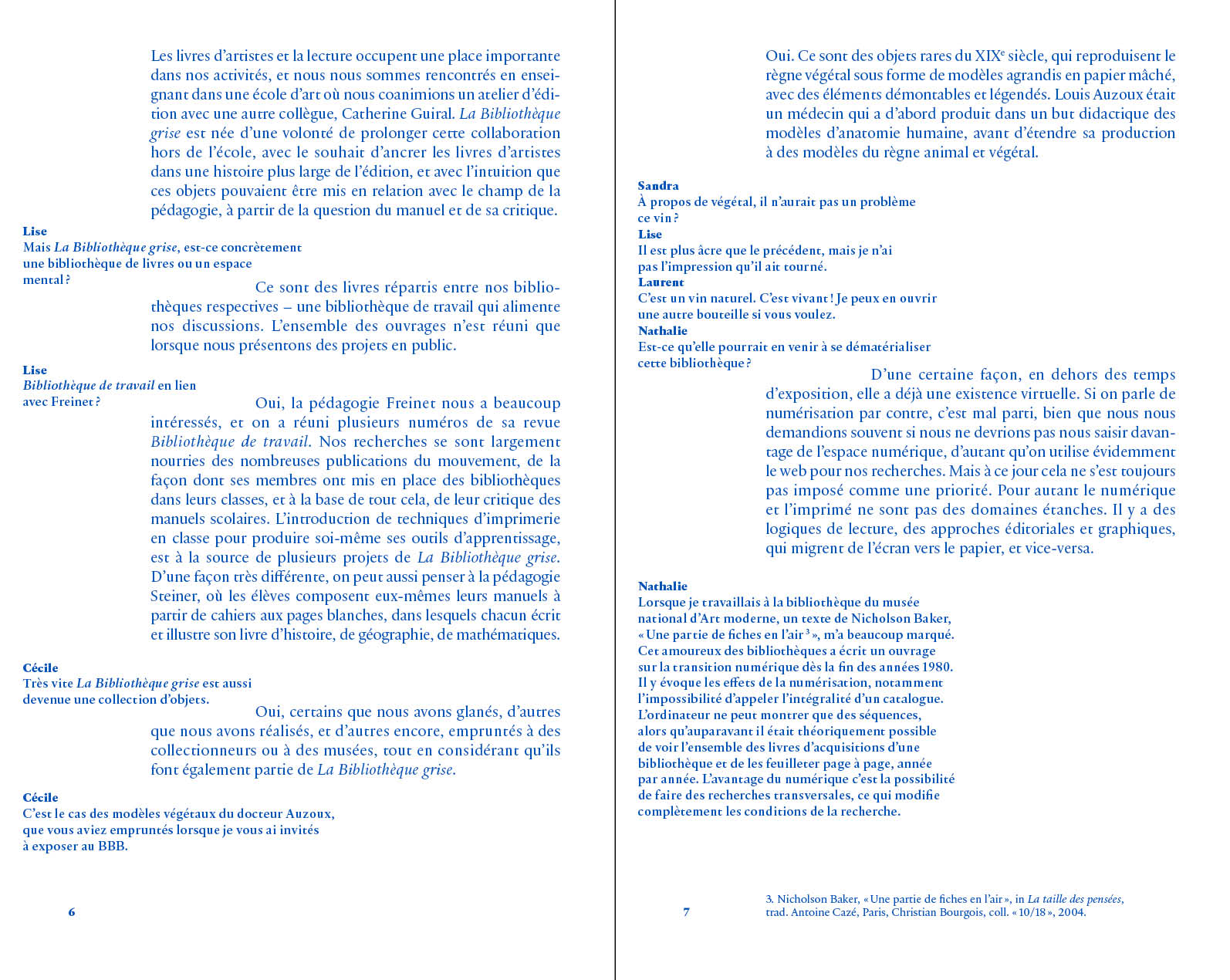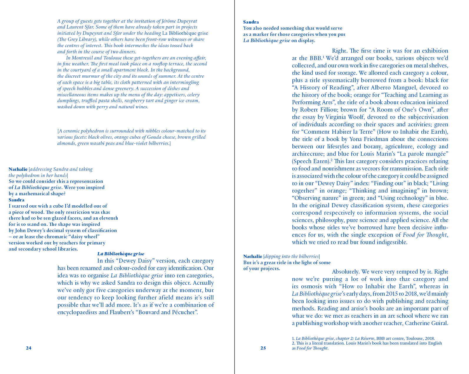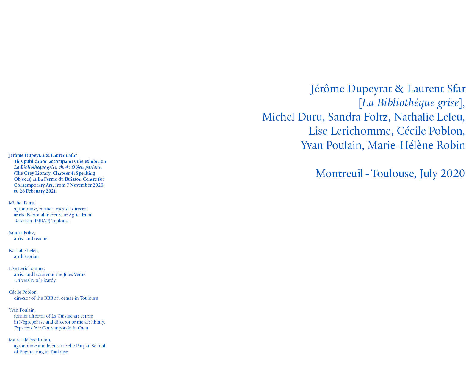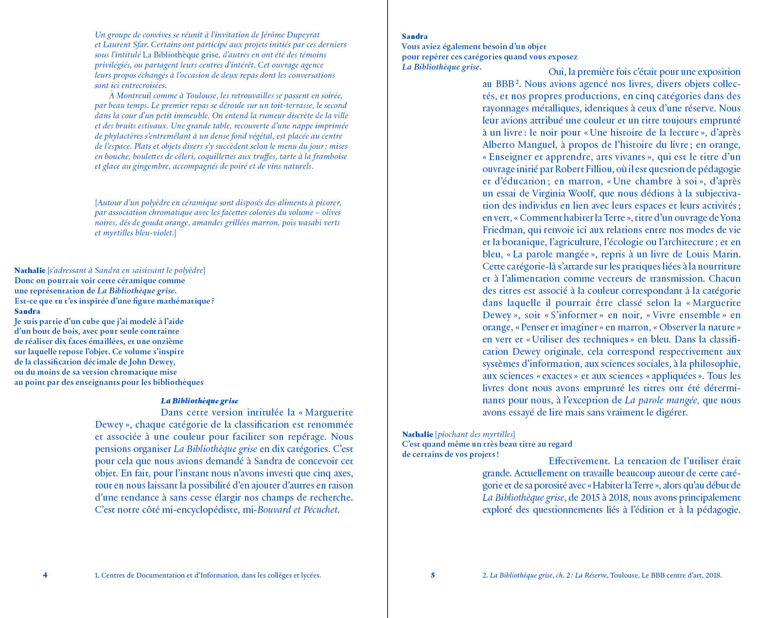 Pour l'exposition La Bibliothèque grise - ch. 4 « Objets parlants », la collection Digressions accueille un nouvel opus présentant l'exposition à travers la retranscription d'une conversation à plusieurs voix réunissant chercheurs·ses, critiques d'art, pédagogues, agronomes et artistes. Ces paroles ont été recueillies lors d'un repas organisé par Jérôme Dupeyrat et Laurent Sfar autour d'une nappe-édition retranscrivant une enquête présentée lors de l'exposition à La Ferme du Buisson. Les échanges portent sur les livres et la lecture, l'éducation et la pédagogie, l'alimentation et les pratiques culinaires, l'agriculture et l'écologie.