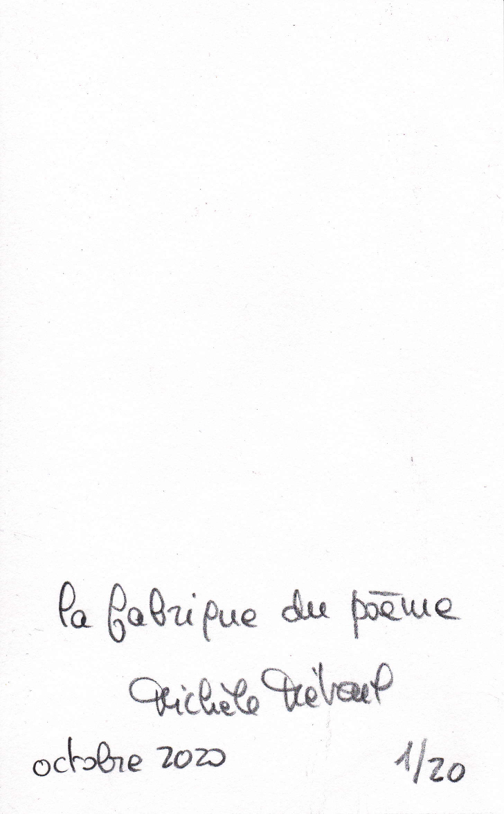 Ce livre rassemble les textes (inédits ou aujourd'hui introuvables) conçus comme partitions des publications orales de Michèle Métail depuis 1973. L'édition de tête, numérotée de 1 à 20, contient un collage signé.