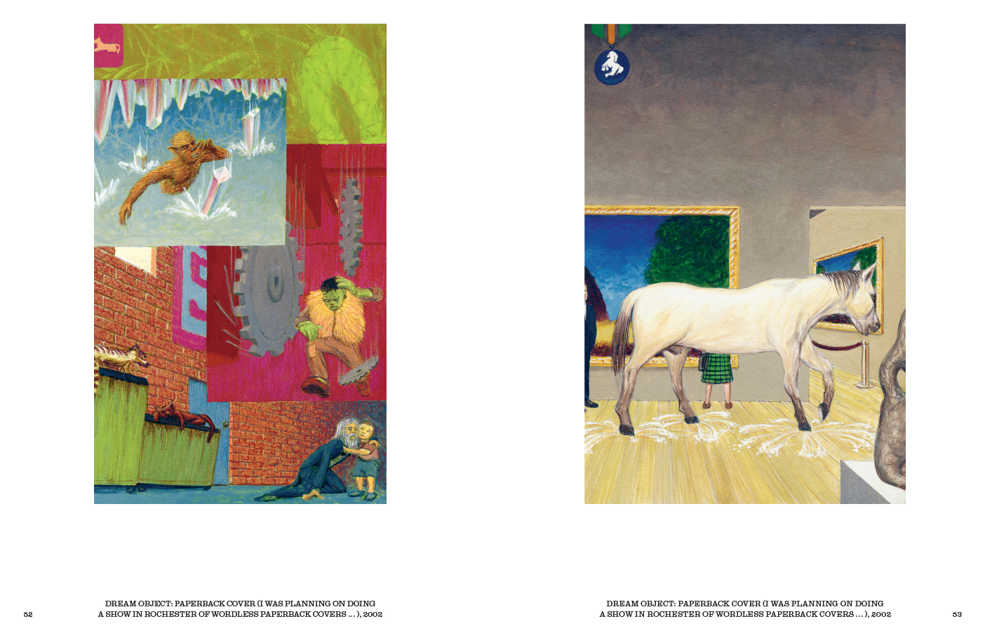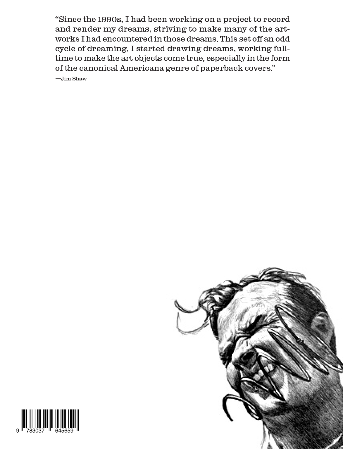 Issus du vaste corpus des Dream Drawings, les Paperback Covers (1996-2013) reprennent les dimensions de couvertures de livres. La référence à la physicalité des livres de poche bon marché est combinée à un clin d'œil à la tradition graphique anglo-saxonne, avec ses images pleine page et ses logos d'éditeurs ou de collections. Ne manque plus que le texte. Sans titres, sans auteurs, mais non sans fictions, les tableaux dépeignent des scènes oniriques dont les intitulés éclairent les éléments narratifs, condensant le récit en une seule image, dans laquelle le narrateur à la première personne s'identifie comme Jim Shaw. Ils deviennent des instantanés possibles de l'autobiographie de Shaw, mais ils constituent également un répertoire de formes et de références culturelles dont le livre de poche n'est qu'un aspect. Les bandes dessinées, les illustrations, la peinture naïve et savante, les récits fantastiques et populaires sont tous évoqués par le corpus. Collection de courts-circuits favorisant l'imagination et la subjectivité, les Paperback Covers constituent une contre-encyclopédie des désirs et névroses culturels, scientifiques et sociétaux du XXe siècle.