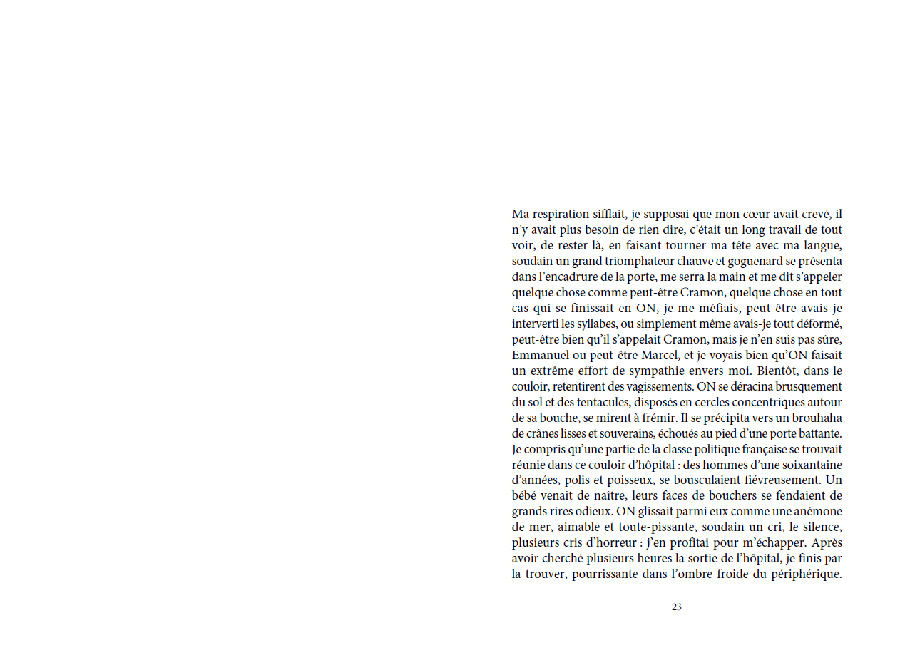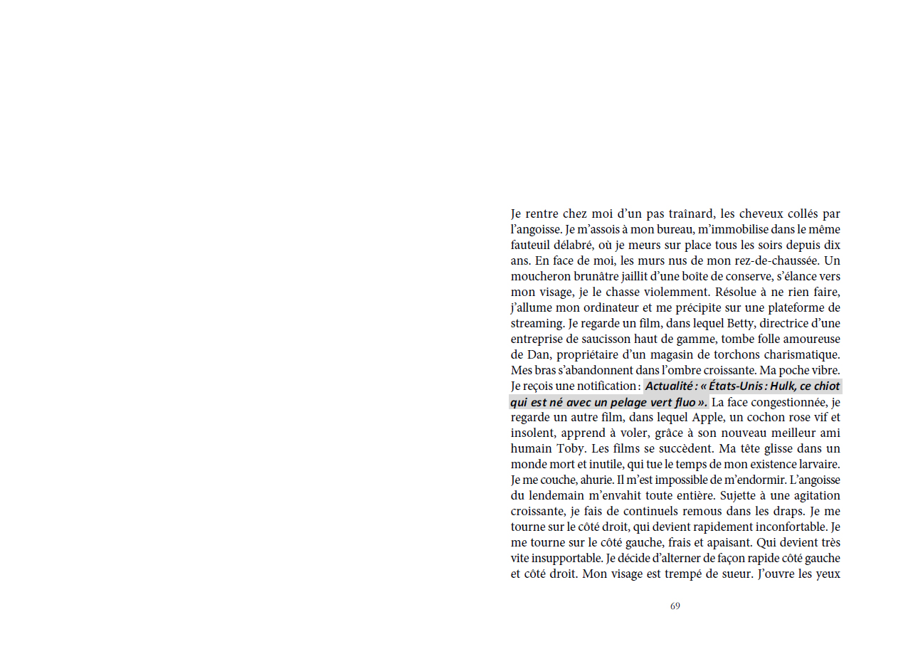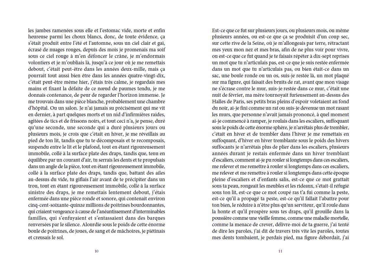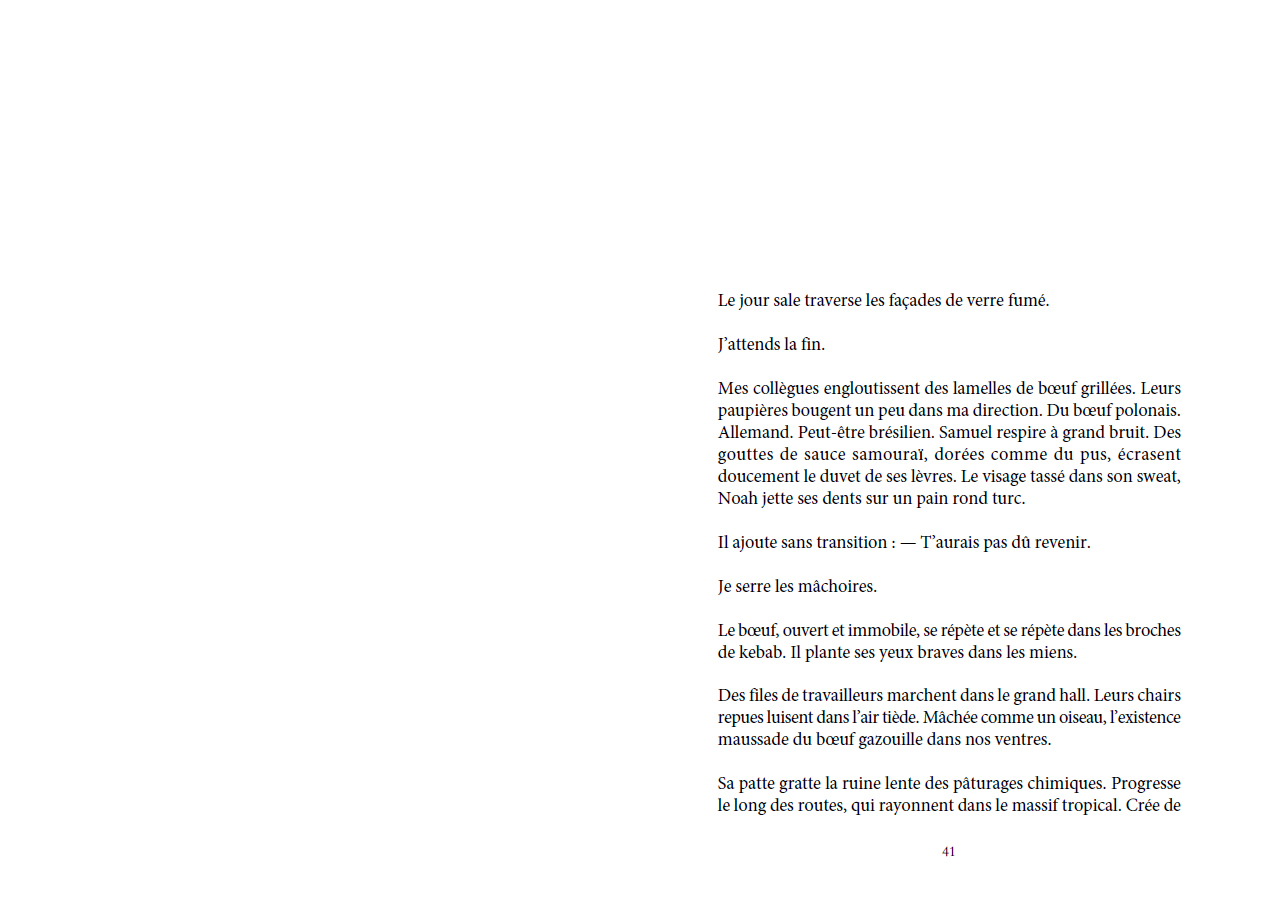 Sortir de la suffocation et du silence, faire émerger du chaos une langue, monstrueuse et irréconciliable, qui ose confronter au monde sa propre singularité… Koma Kapital, en six salves, dit la brutalité de notre société et celle dont peut être capable le monde du travail ; également, de leur capacité, ou à nous formater, ou à nous détruire.