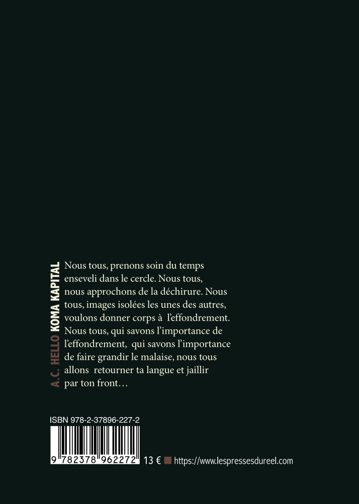« Riche, dense et expansif, Koma Kapital détonne et dénote dans un univers éditorial où le plat de l'écrit domine, où la poésie se fait vide de toute substance. A.C Hello remue tout cela. »
