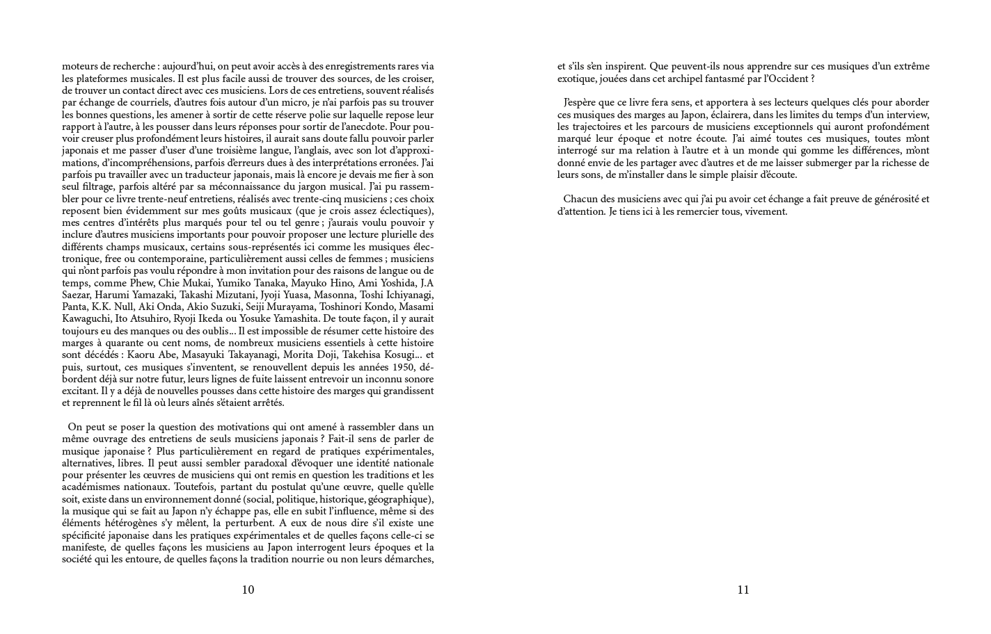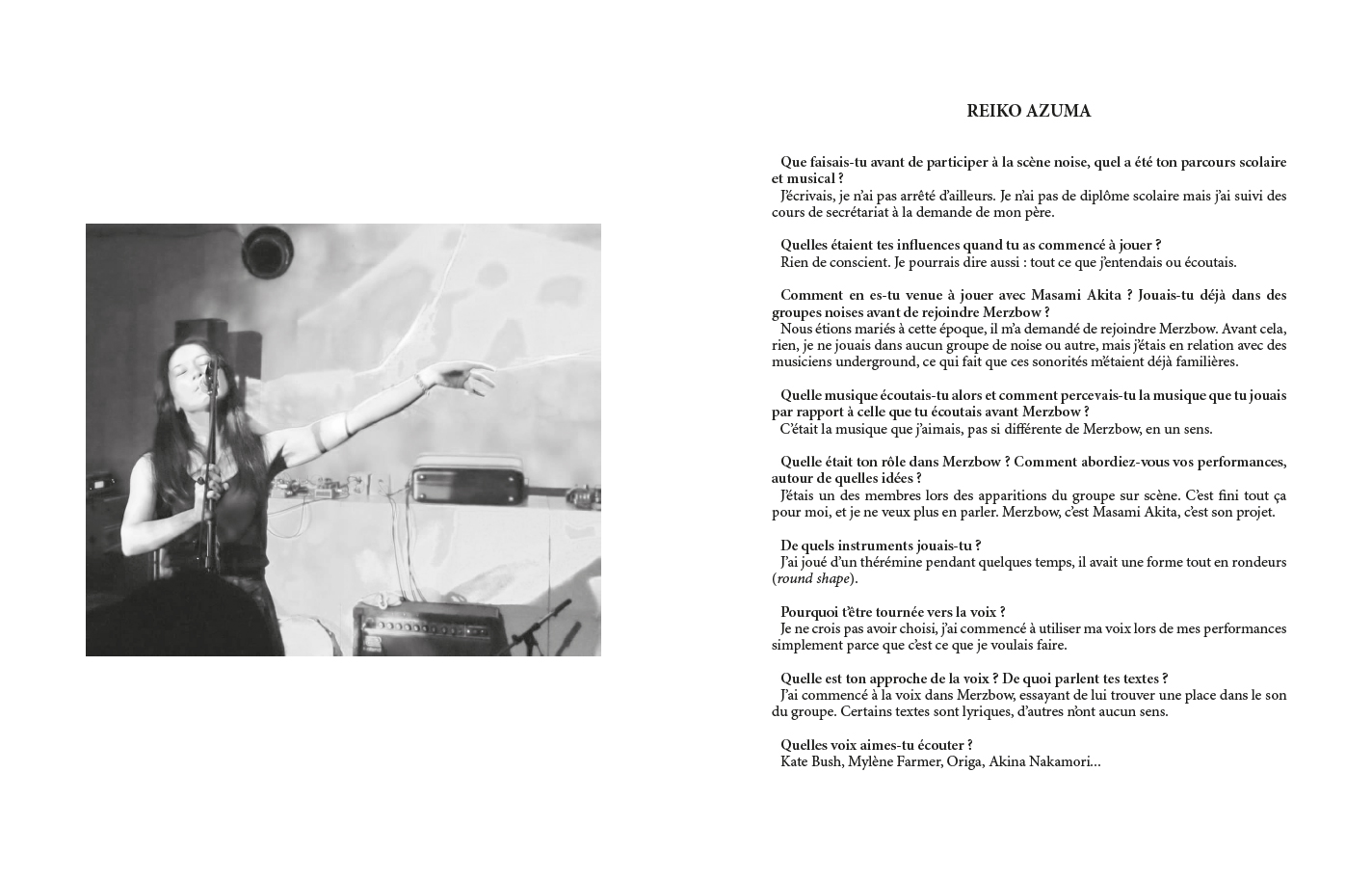Entretiens avec Masami Akita / Merzbow, Tetuzi Akiyama, Rinji Fukuoka, Haco, Keiji Haino, Hideo Ikeezumi, Kazuo Imai, Jojo Hiroshige / Hijokaïdan, Junko Hiroshige / Reiko Aruma, Shin'ichi Isohata, Makoto Kawabata, Makoto Kawashima, Tori Kudo, Sachiko M, Kan Mikami, Mikawa / Incapacitants, Harutaka Mochizuki, Katsura Mouri, Toshi Nakamura, Otomo Yoshihide, Akira Sakata, Minoru Sato, Tamio Shiraishi, Teruto Soejima, Taku Sugimoto, Ikuro Takahashi, Yuji Takahashi, Kazuki Tomokawa, Yasunao Tone, Sabu Toyozumi, Taku Unami, Masayoshi Urabe, Homei Yanagawa.